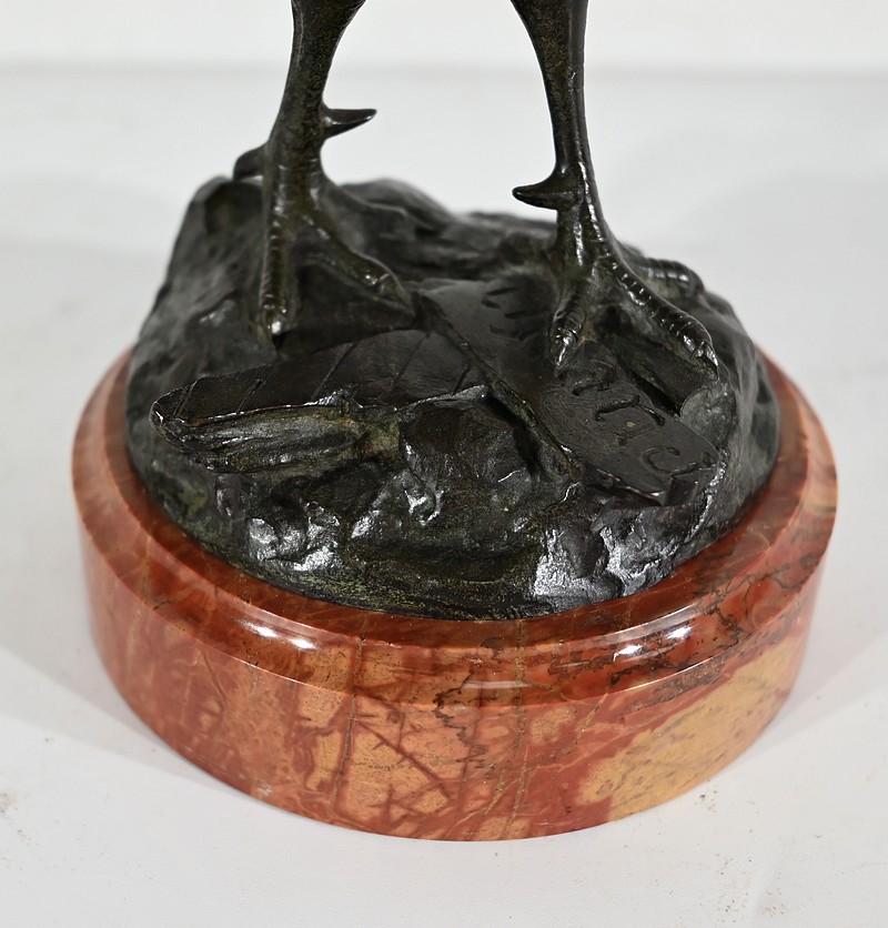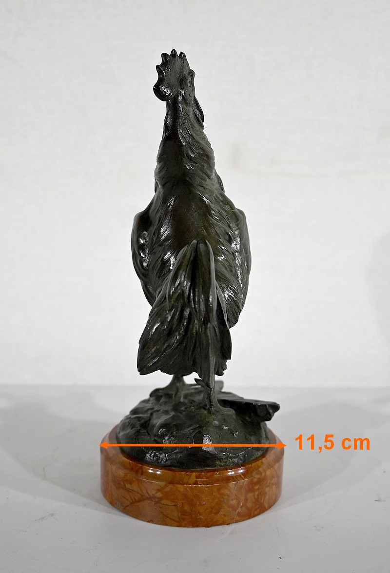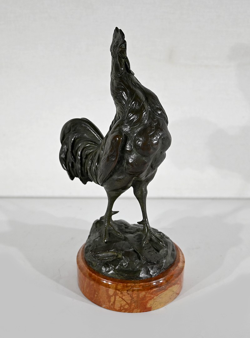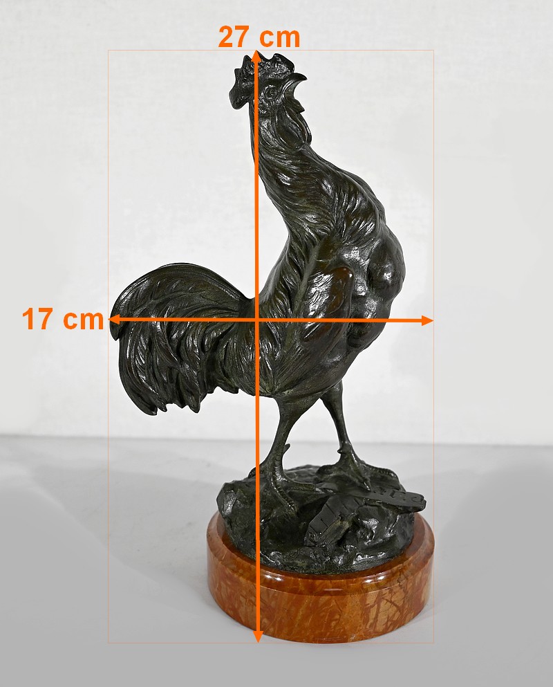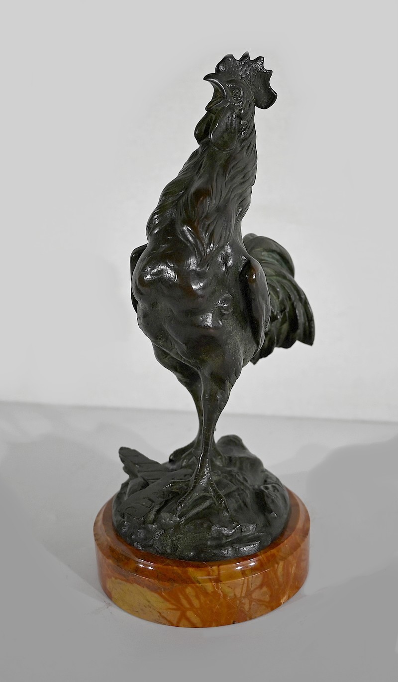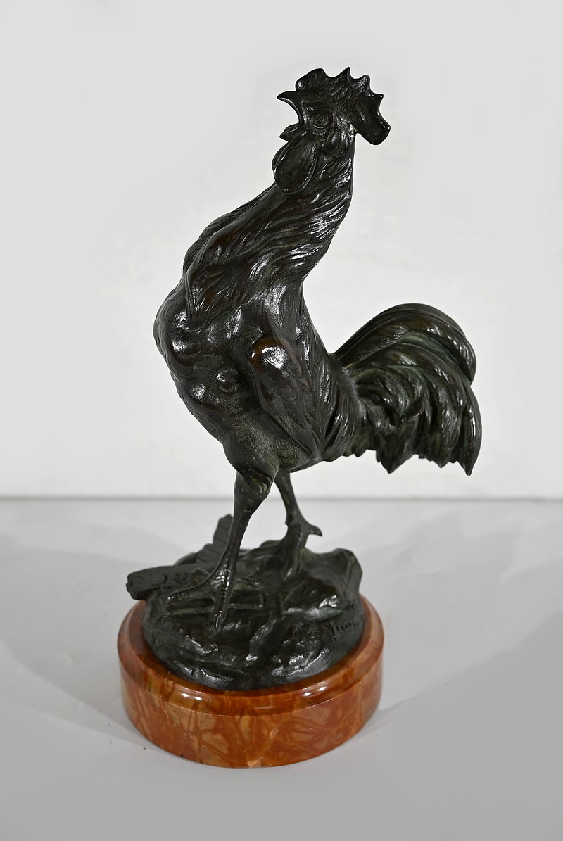 Sculpture en Bronze à patine verte représentant un coq chantant, signé Géo Vacossin et portant le cachet « Fumière et Cie Suce. Thiebaut Paris ».