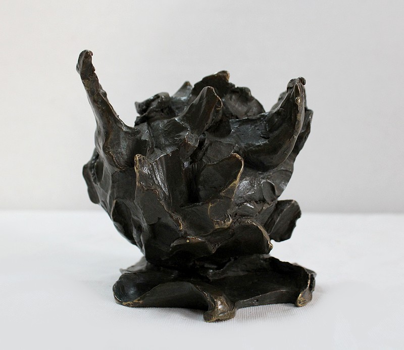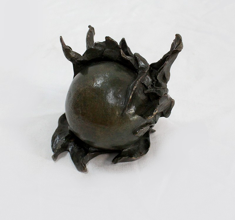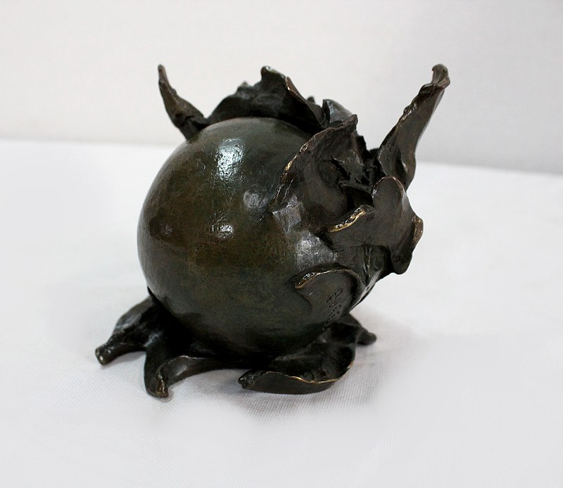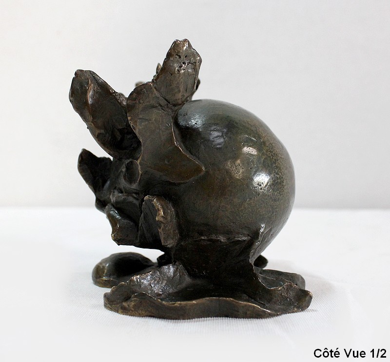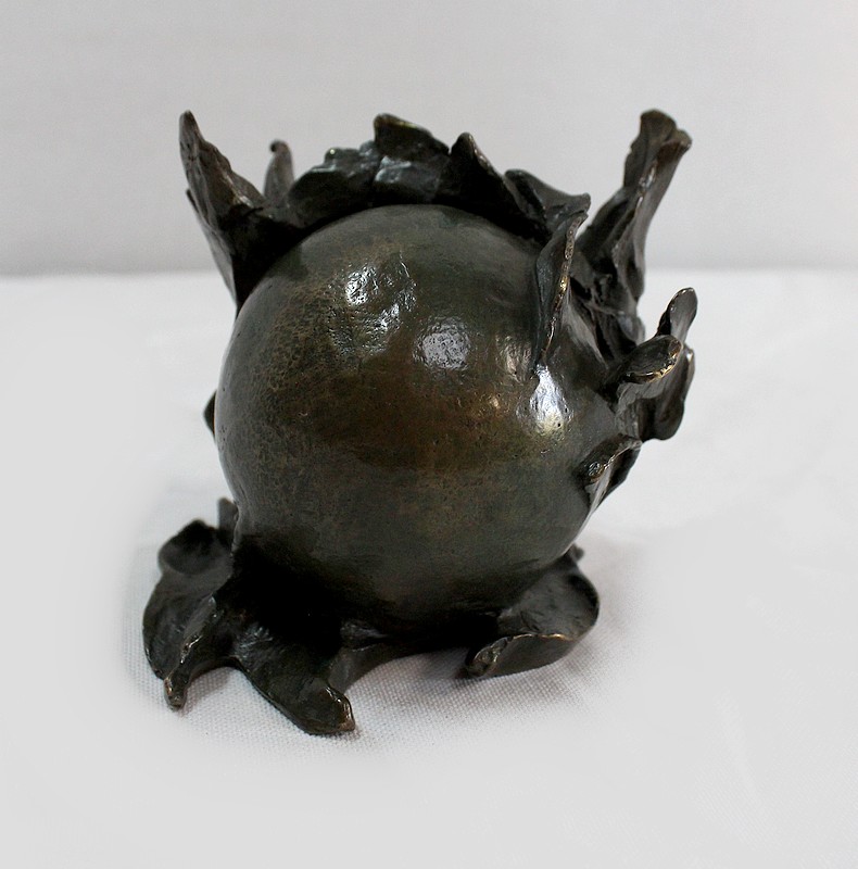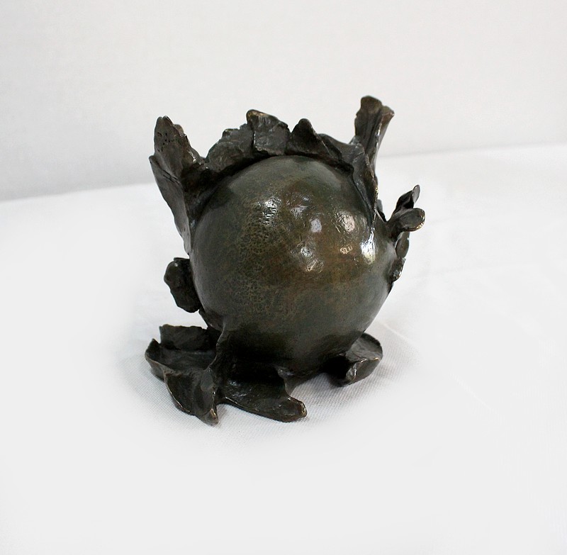 L’artiste représente ici une sphère lisse enveloppée de matière. Rappelant un fruit entouré de feuilles, l’œuvre en elle-même reste un mystère captivant.