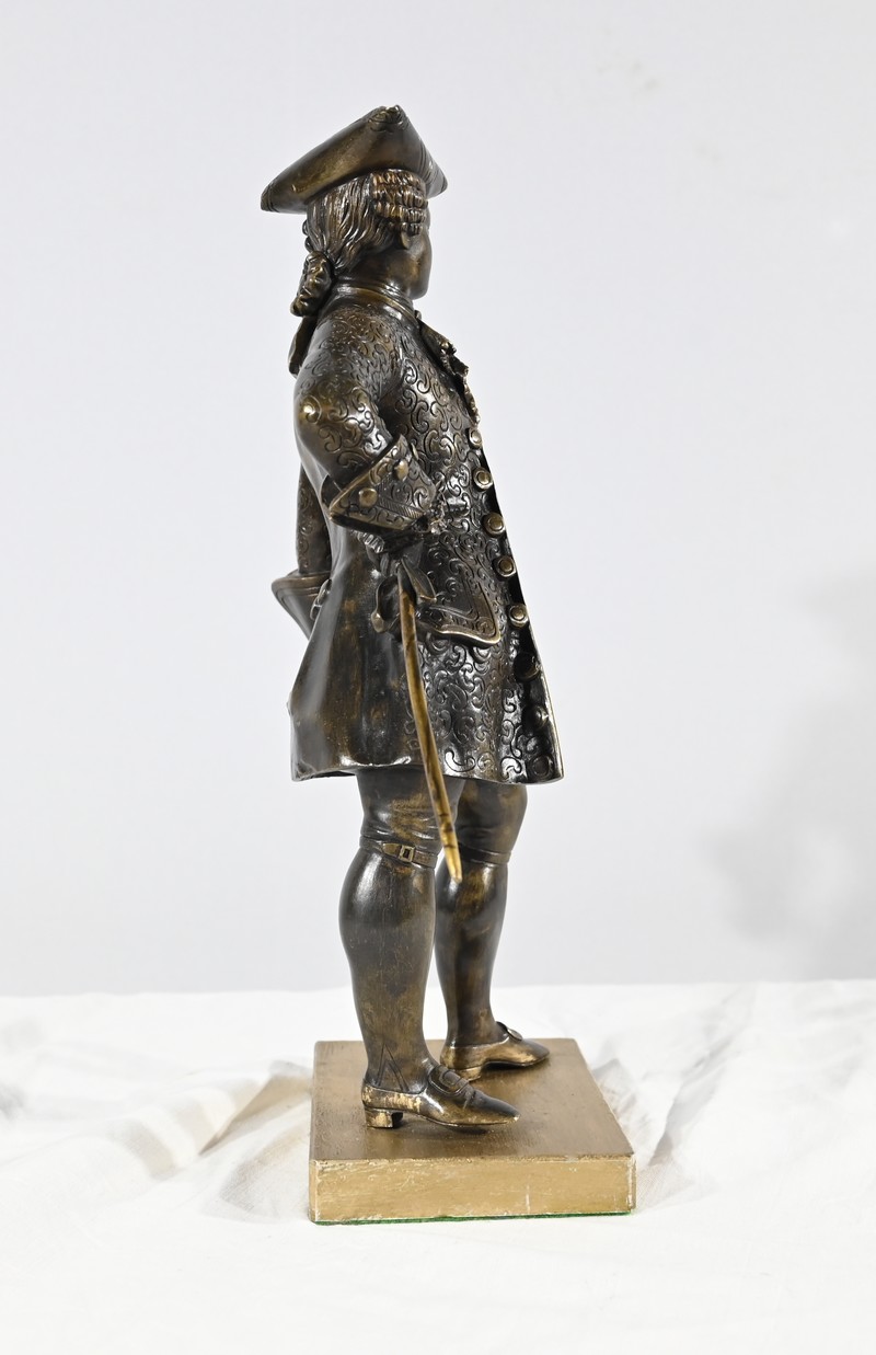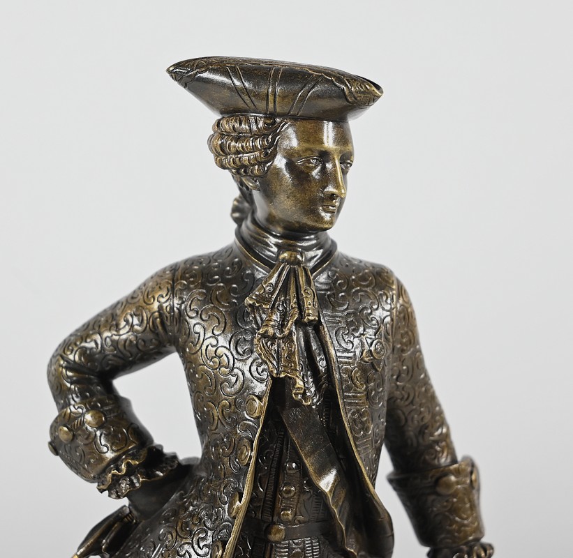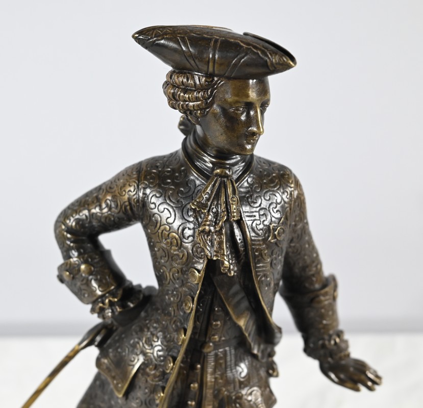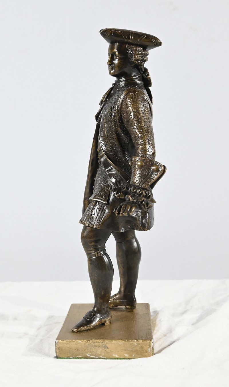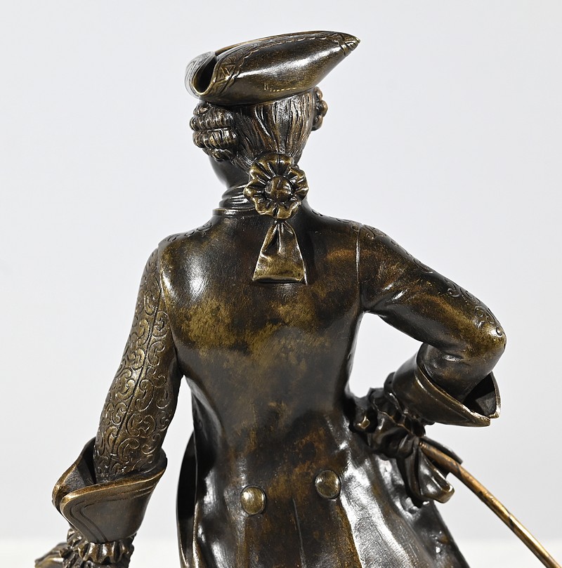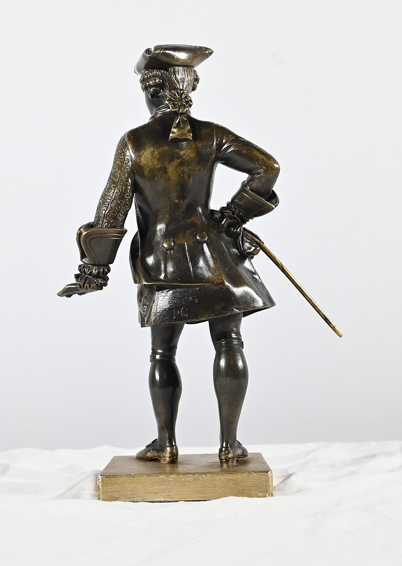 Épreuve en bronze patiné figurant un gentilhomme coiffé d’un tricorne et vêtu d’un costume que l’on imagine chamarré, agrémenté d’ornementations. En effet, sous Louis XV un justaucorps à basques est synonyme de richesse. Ces habits luxueux s’accompagnaient d’un tricorne élégant.