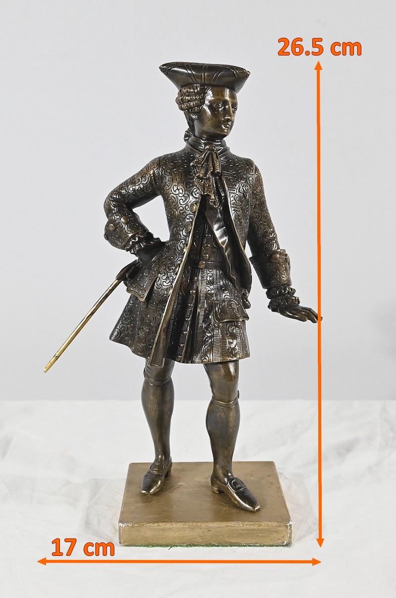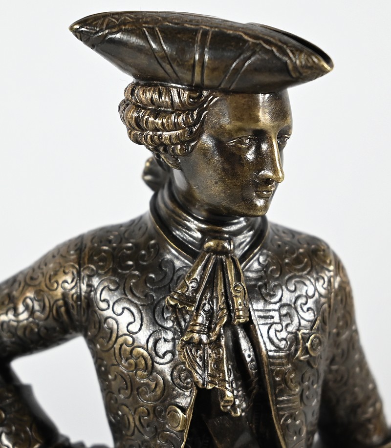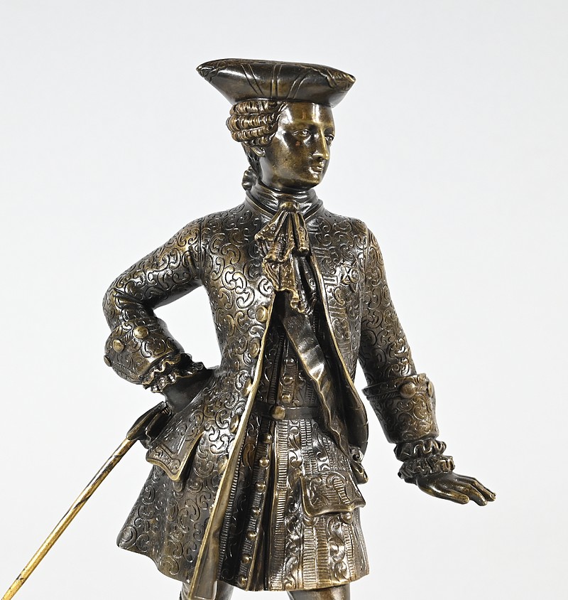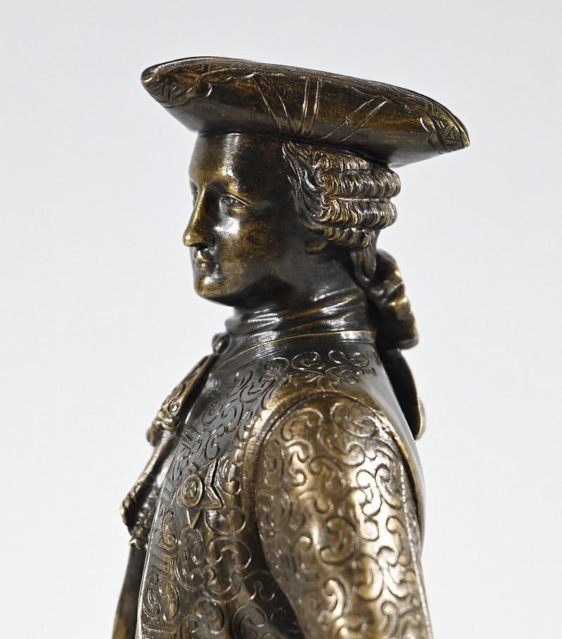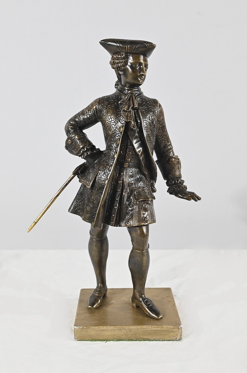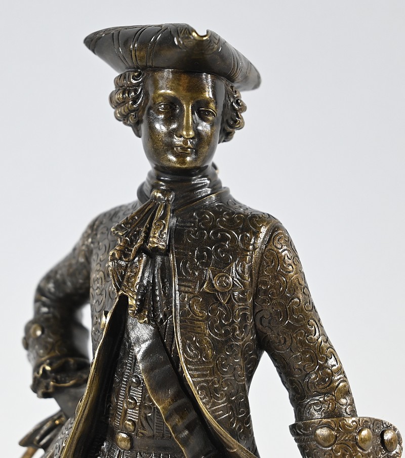 Épreuve en bronze patiné figurant un gentilhomme coiffé d’un tricorne et vêtu d’un costume que l’on imagine chamarré, agrémenté d’ornementations. En effet, sous Louis XV un justaucorps à basques est synonyme de richesse. Ces habits luxueux s’accompagnaient d’un tricorne élégant.