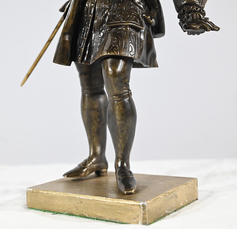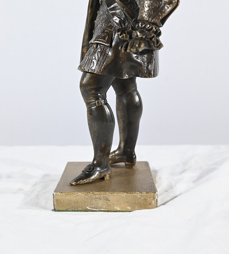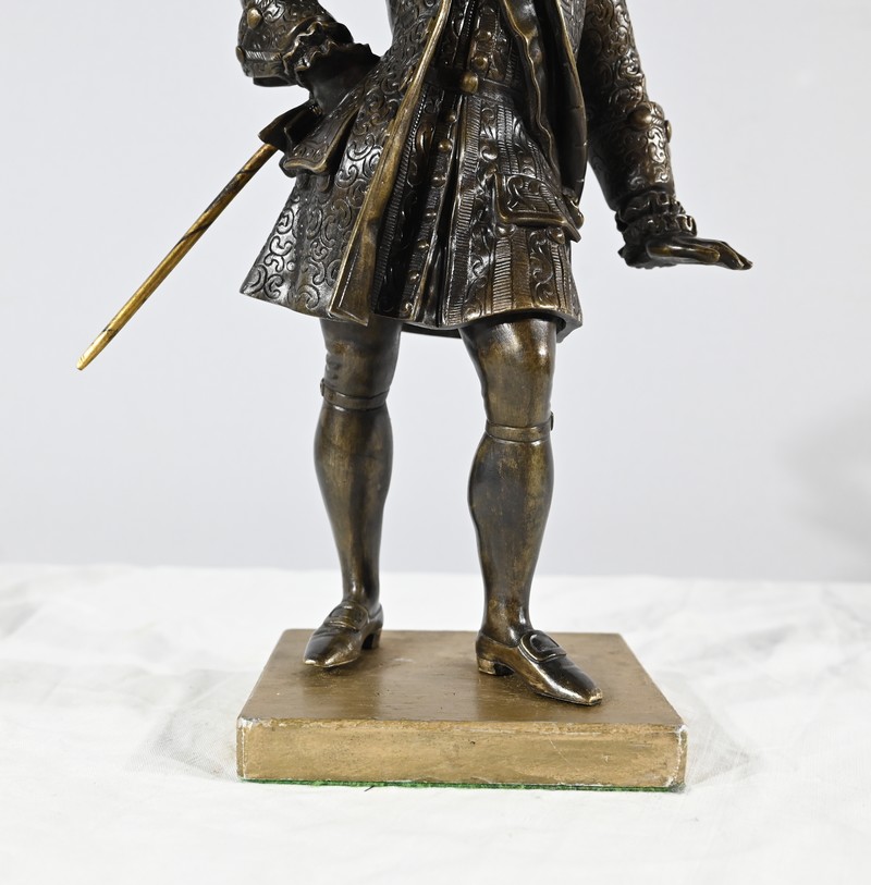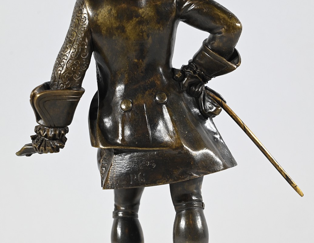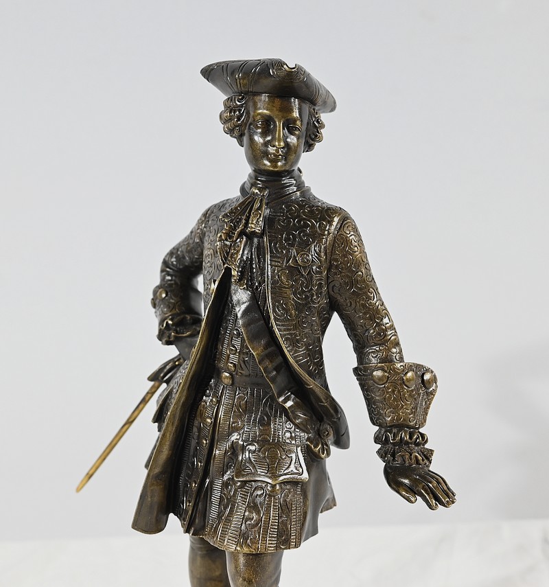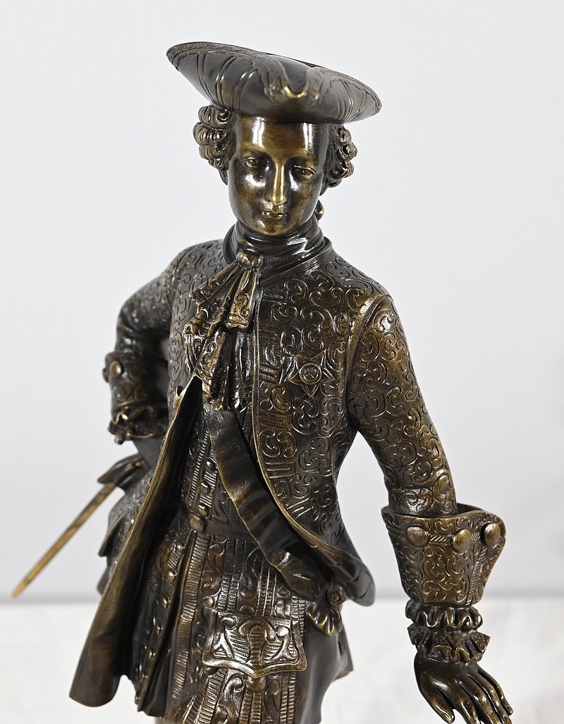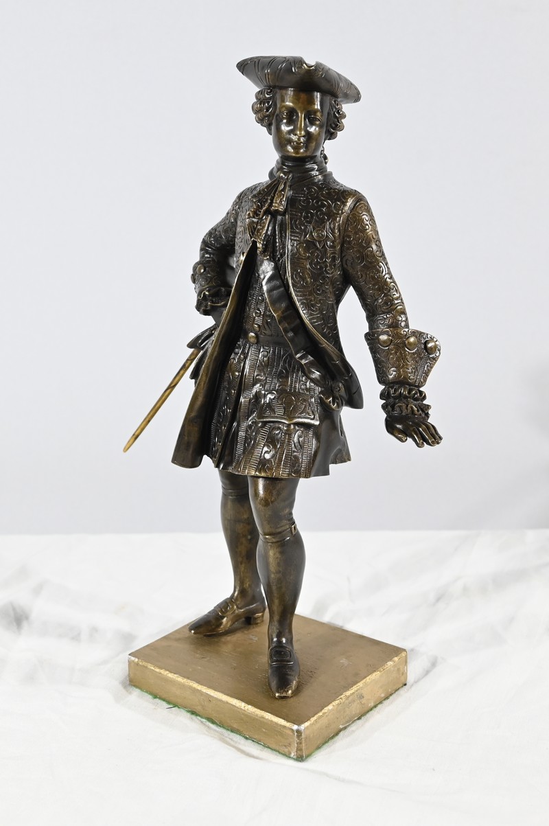 Épreuve en bronze patiné figurant un gentilhomme coiffé d’un tricorne et vêtu d’un costume que l’on imagine chamarré, agrémenté d’ornementations. En effet, sous Louis XV un justaucorps à basques est synonyme de richesse. Ces habits luxueux s’accompagnaient d’un tricorne élégant.