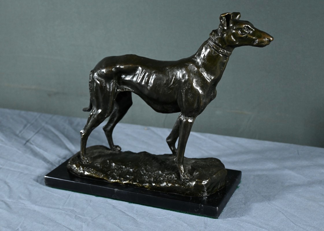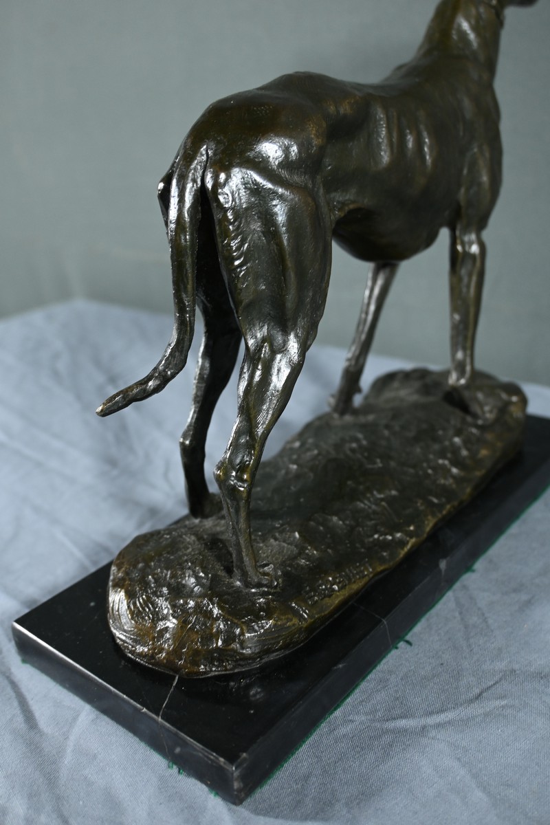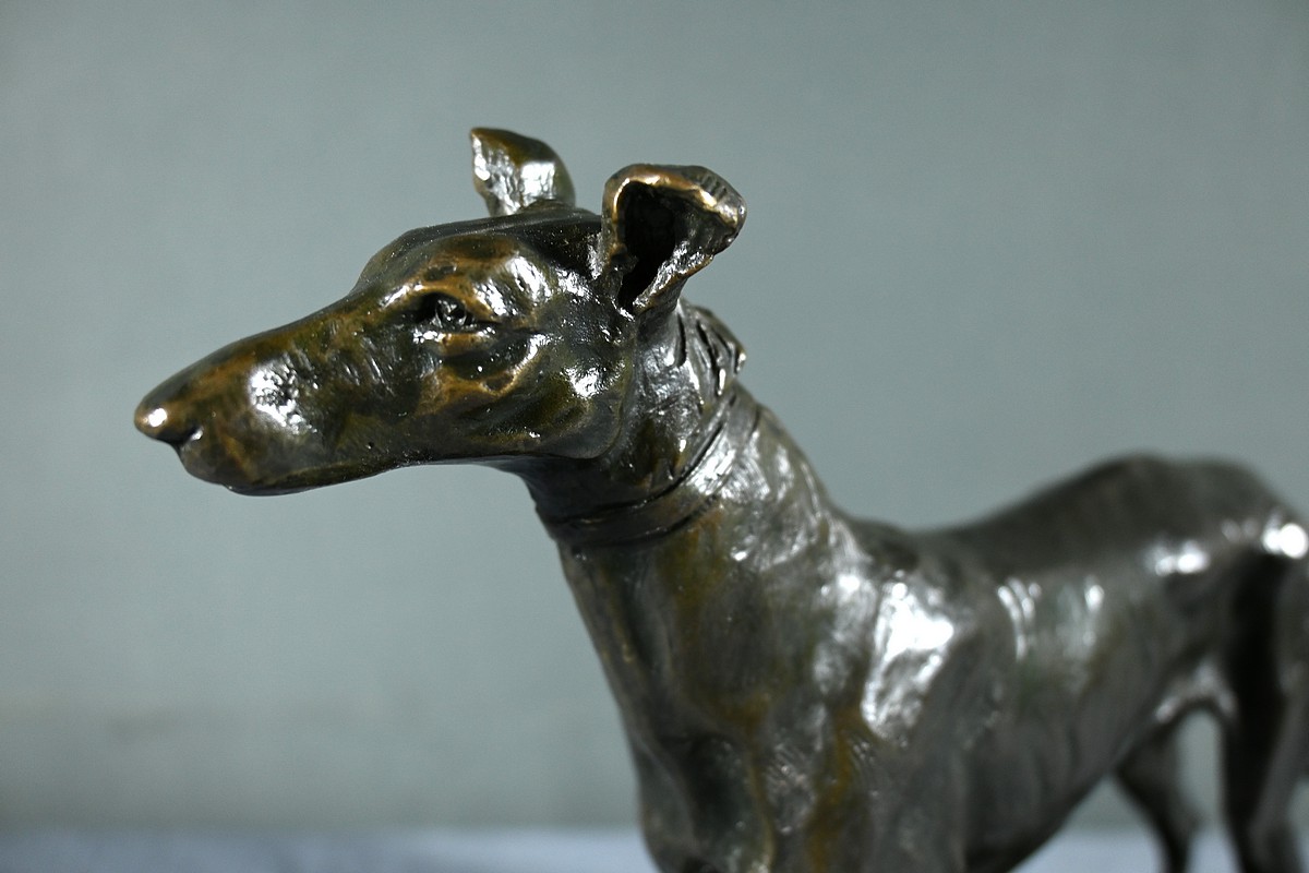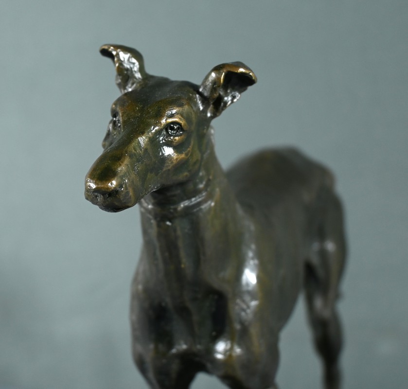La patine brune du bronze ajoute une profondeur et une richesse à la sculpture, accentuant les textures et les formes du chien.