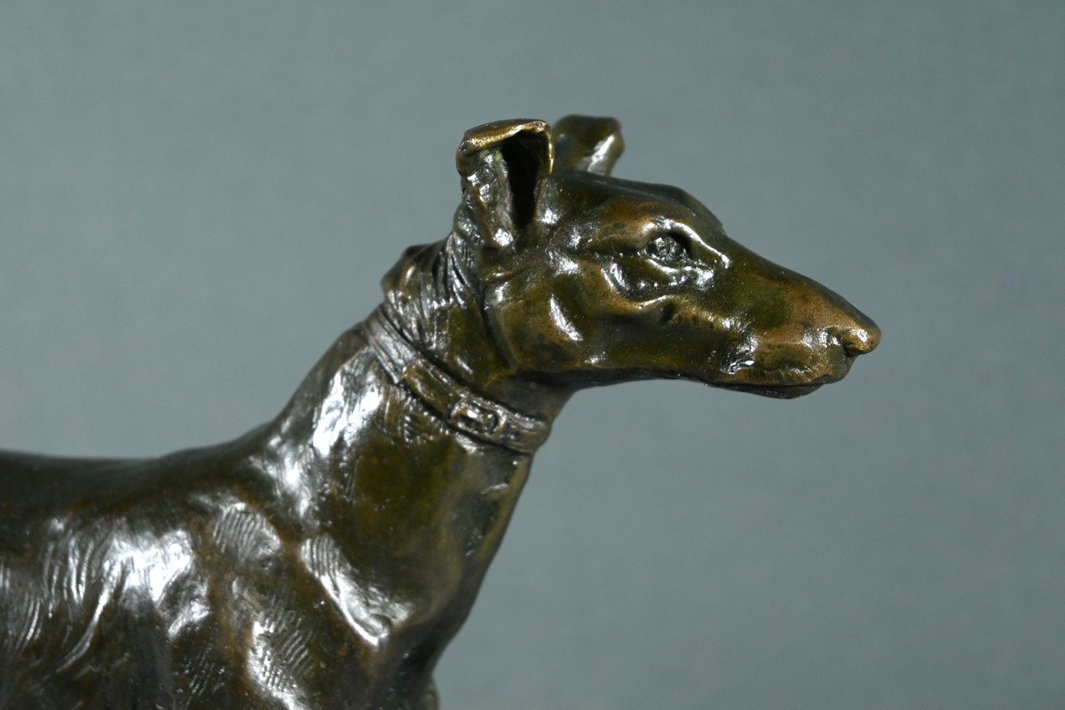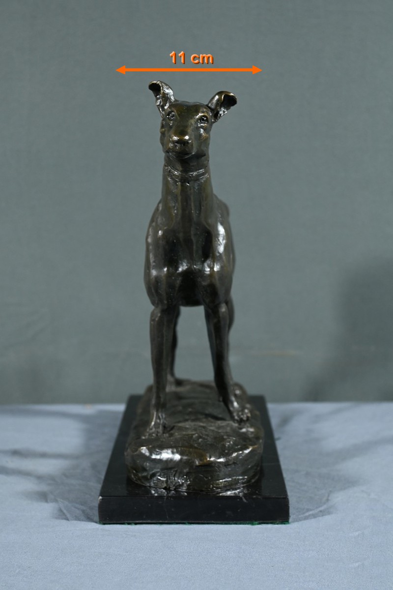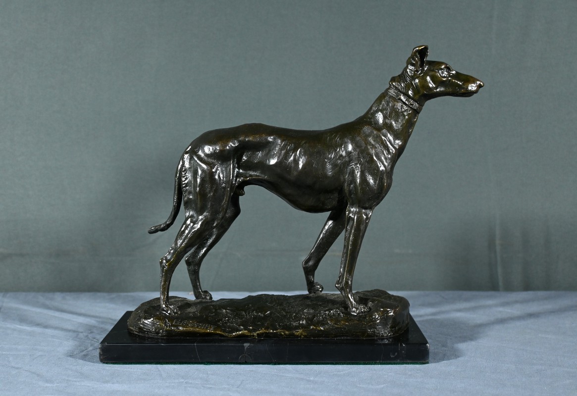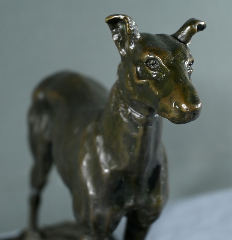 La patine brune du bronze ajoute une profondeur et une richesse à la sculpture, accentuant les textures et les formes du chien.