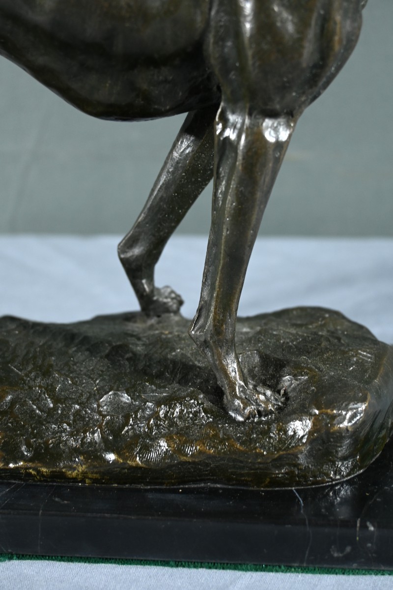 Cette œuvre repose sur un socle en marbre noir, offrant un contraste élégant avec le bronze et soulignant la finesse de la sculpture.