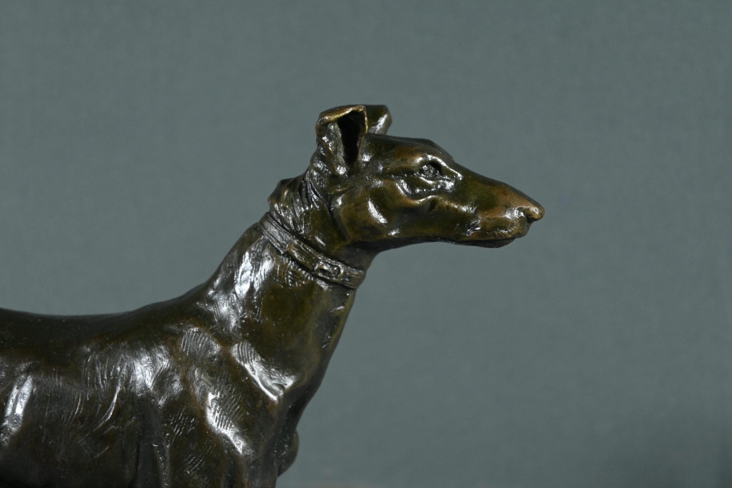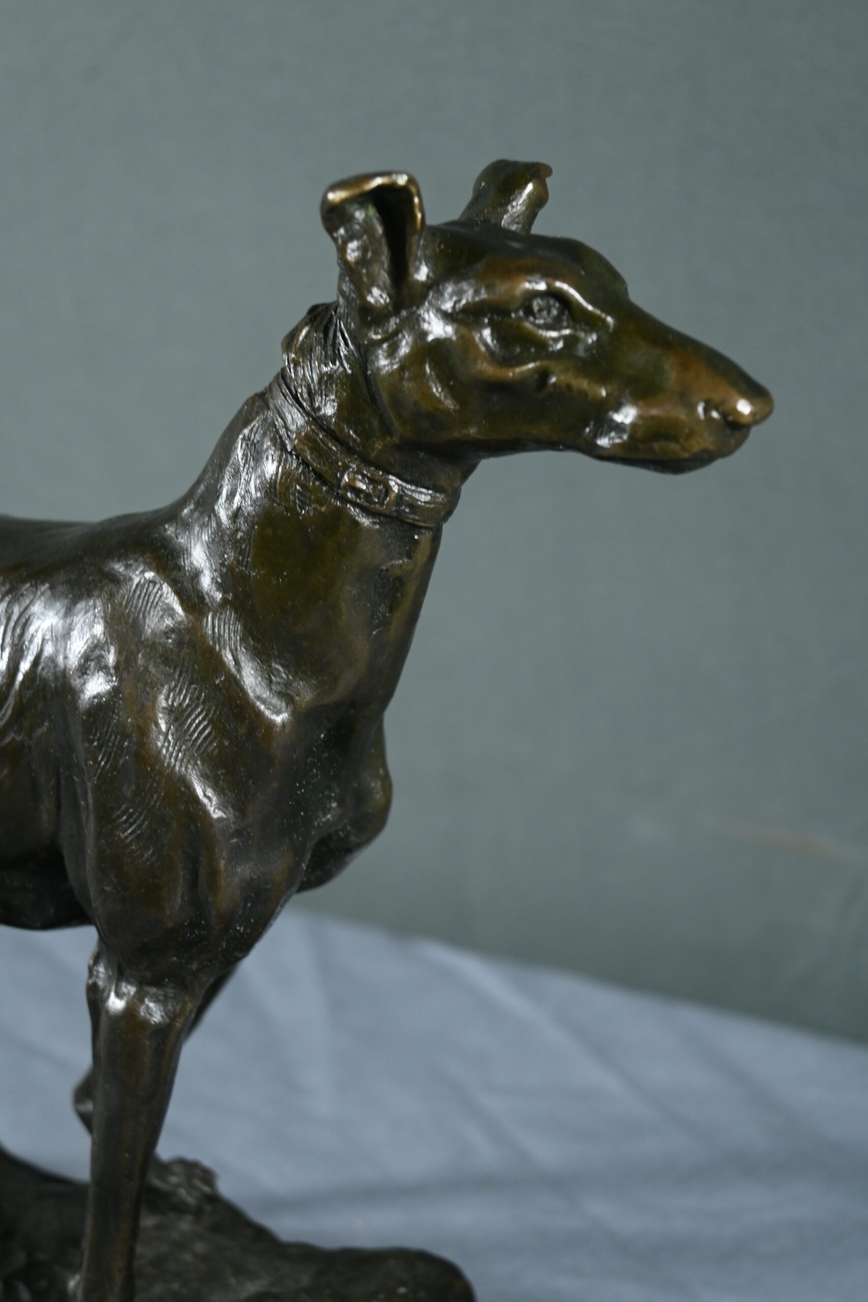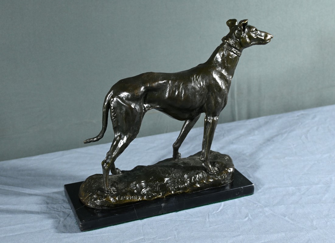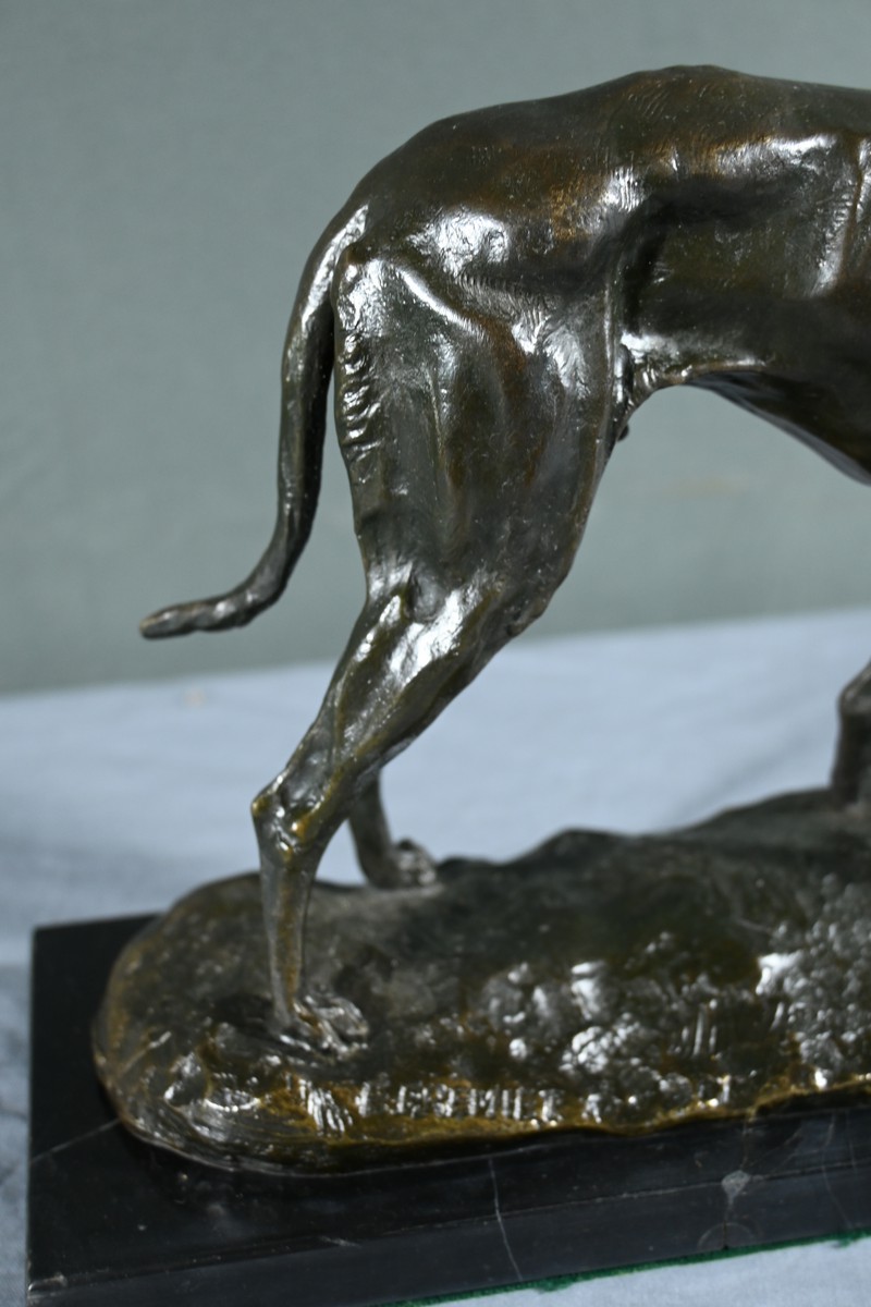 Cette sculpture en bronze à patine brune, réalisée par Emmanuel Frémiet (1824-1910), représente un lévrier avec une grande précision et une attention minutieuse aux détails anatomiques.