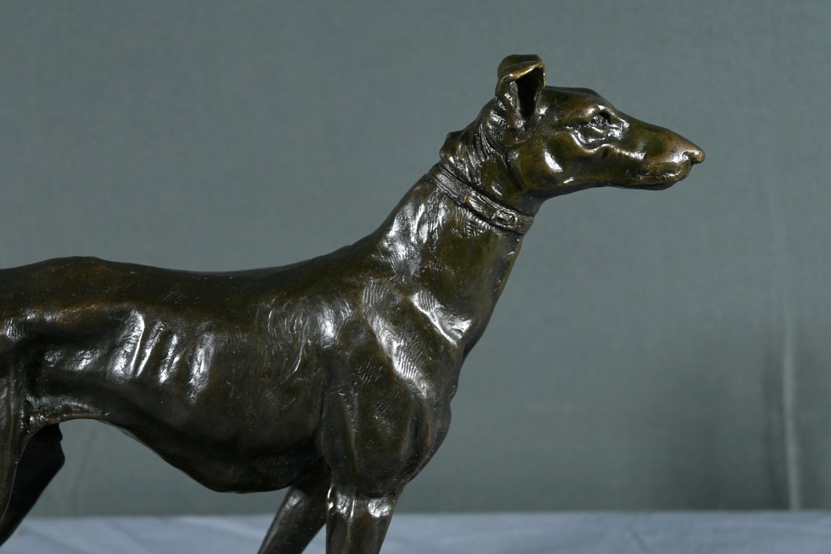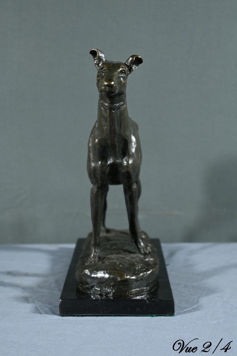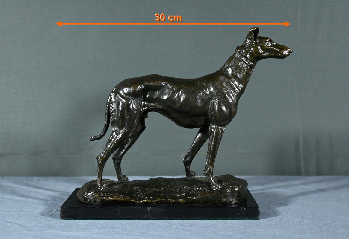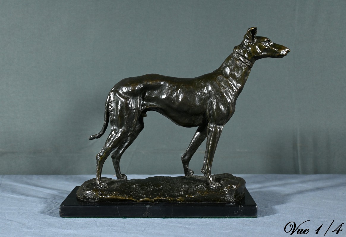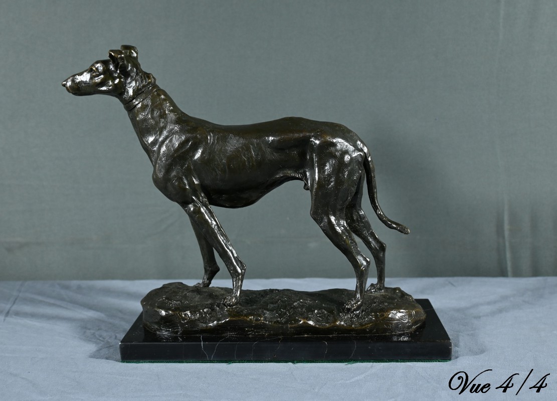 Cette sculpture en bronze à patine brune, réalisée par Emmanuel Frémiet (1824-1910), représente un lévrier avec une grande précision et une attention minutieuse aux détails anatomiques.