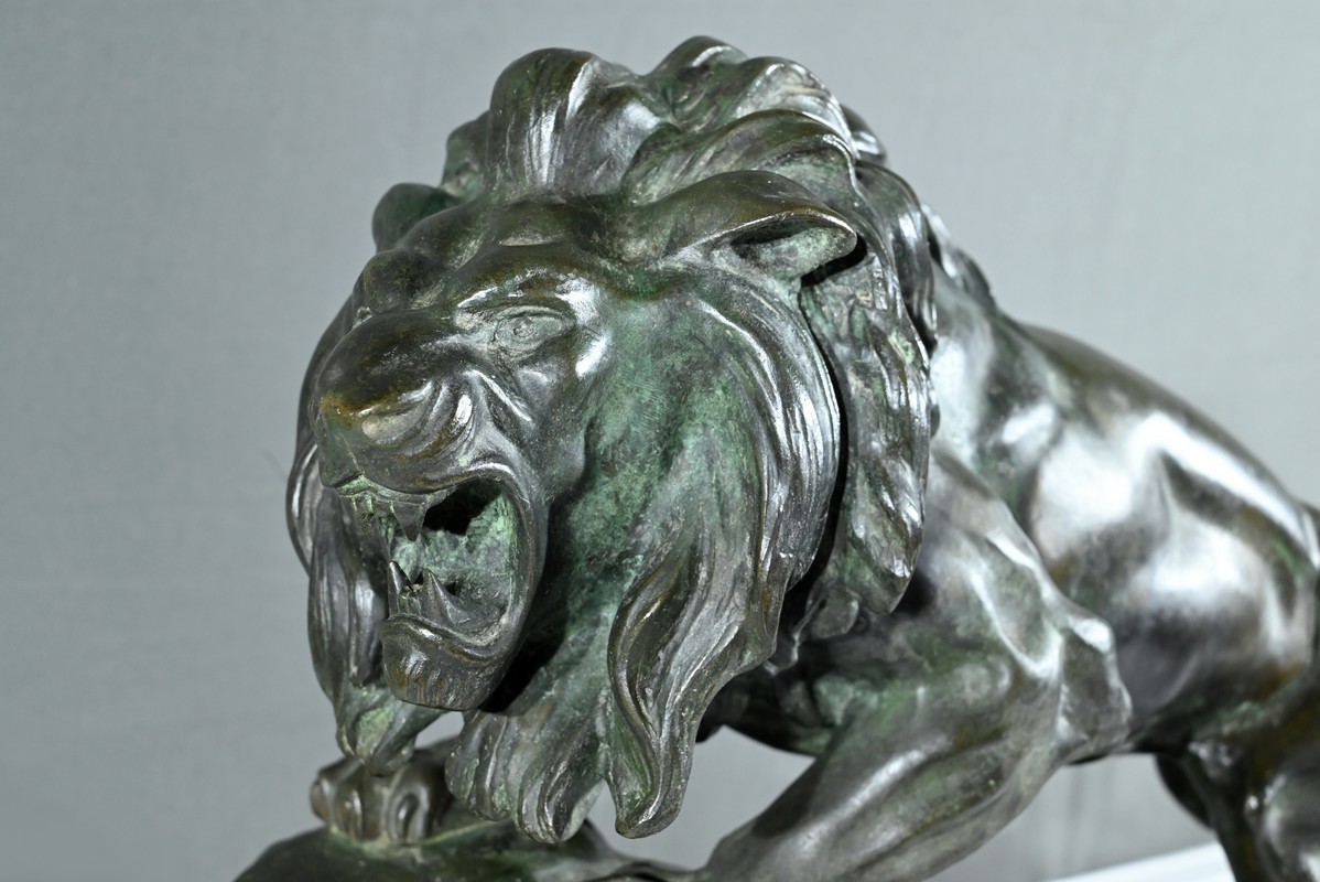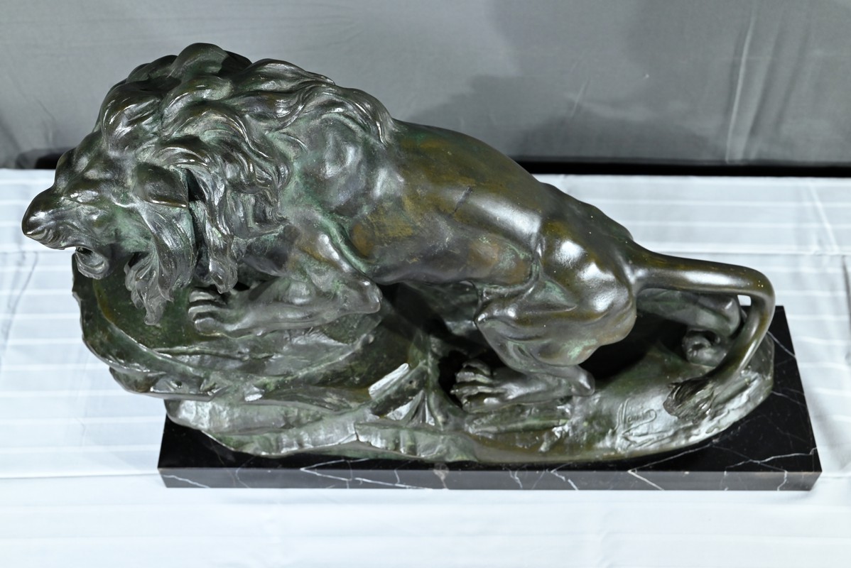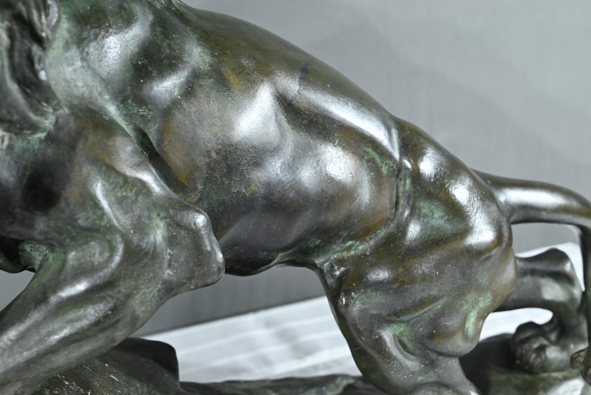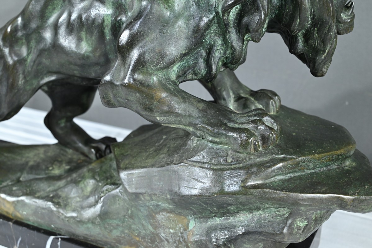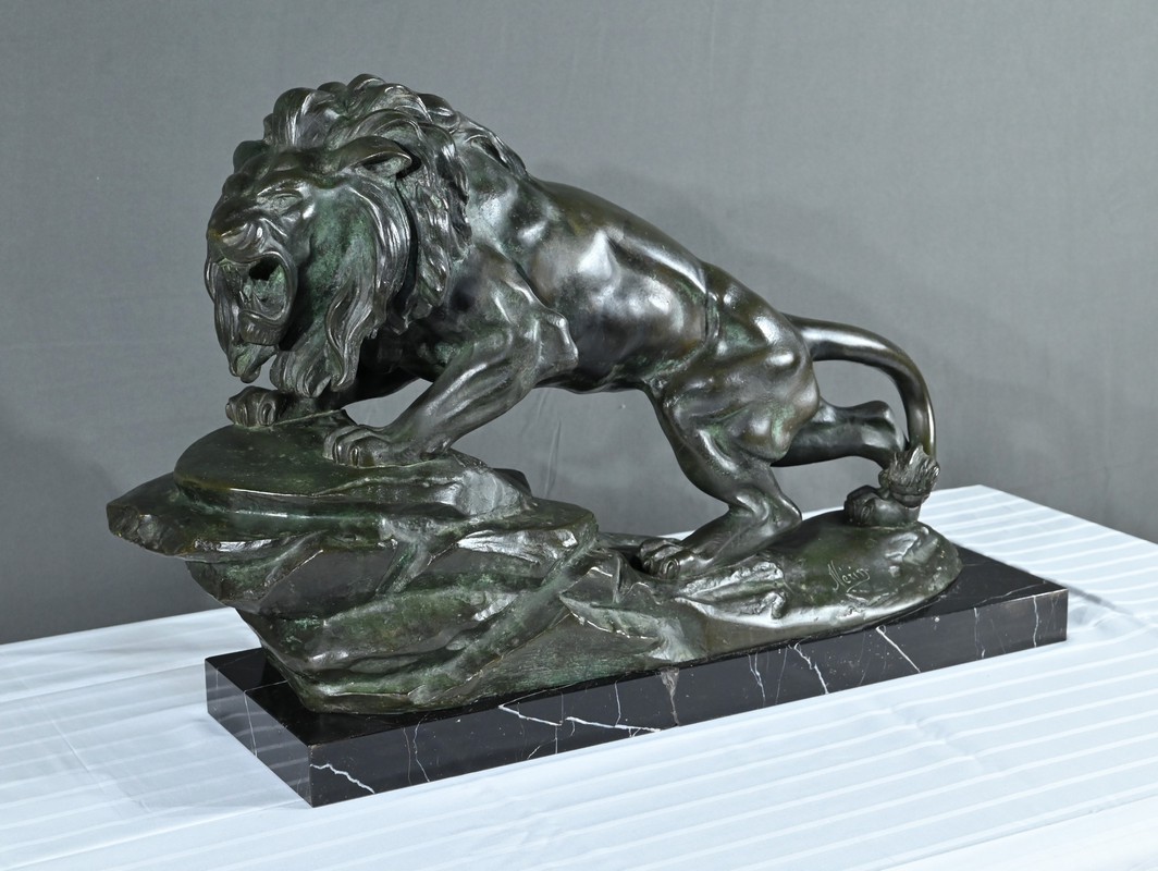 Cette sculpture se distingue par la qualité de sa réalisation, capturant l’essence du mouvement et de la force du lion, ainsi que par la signature de l’artiste, qui ajoute de la valeur à la pièce.