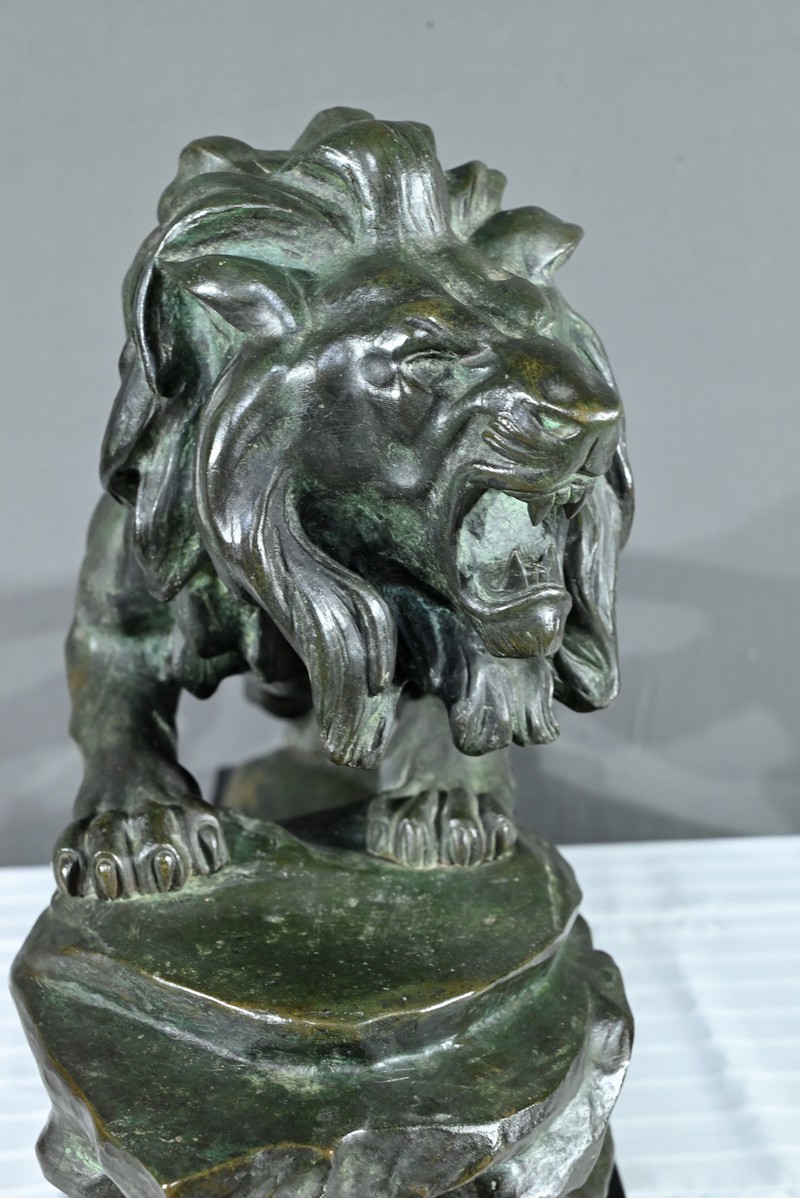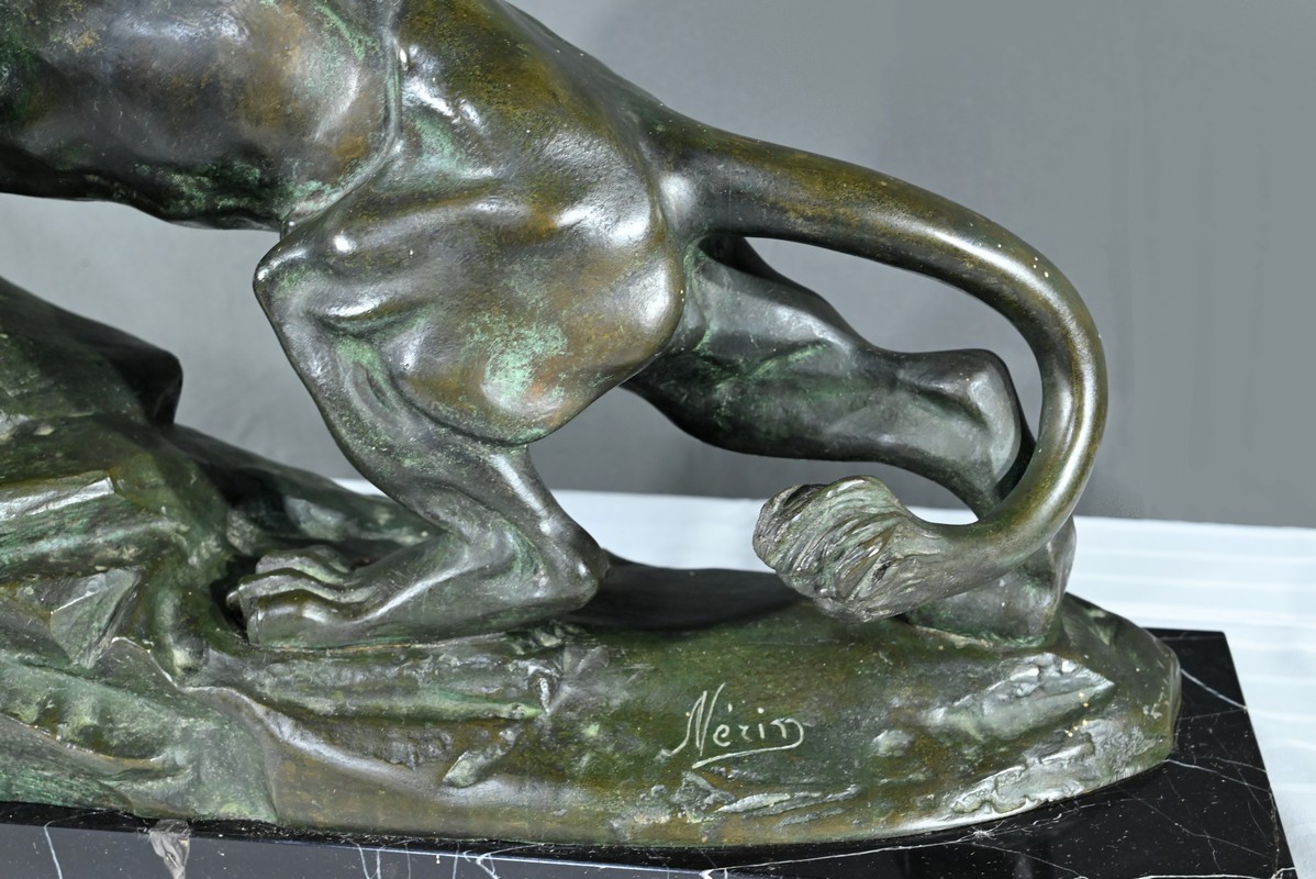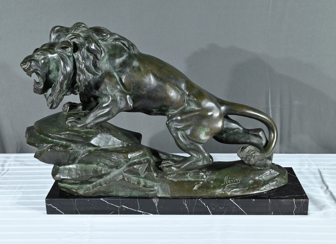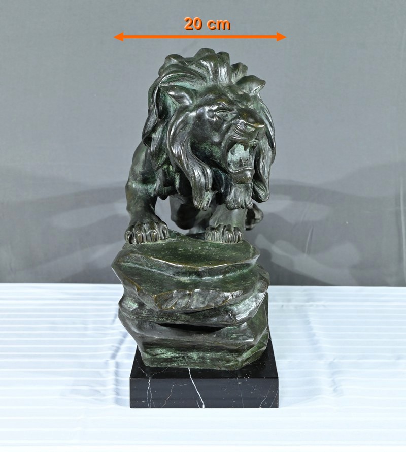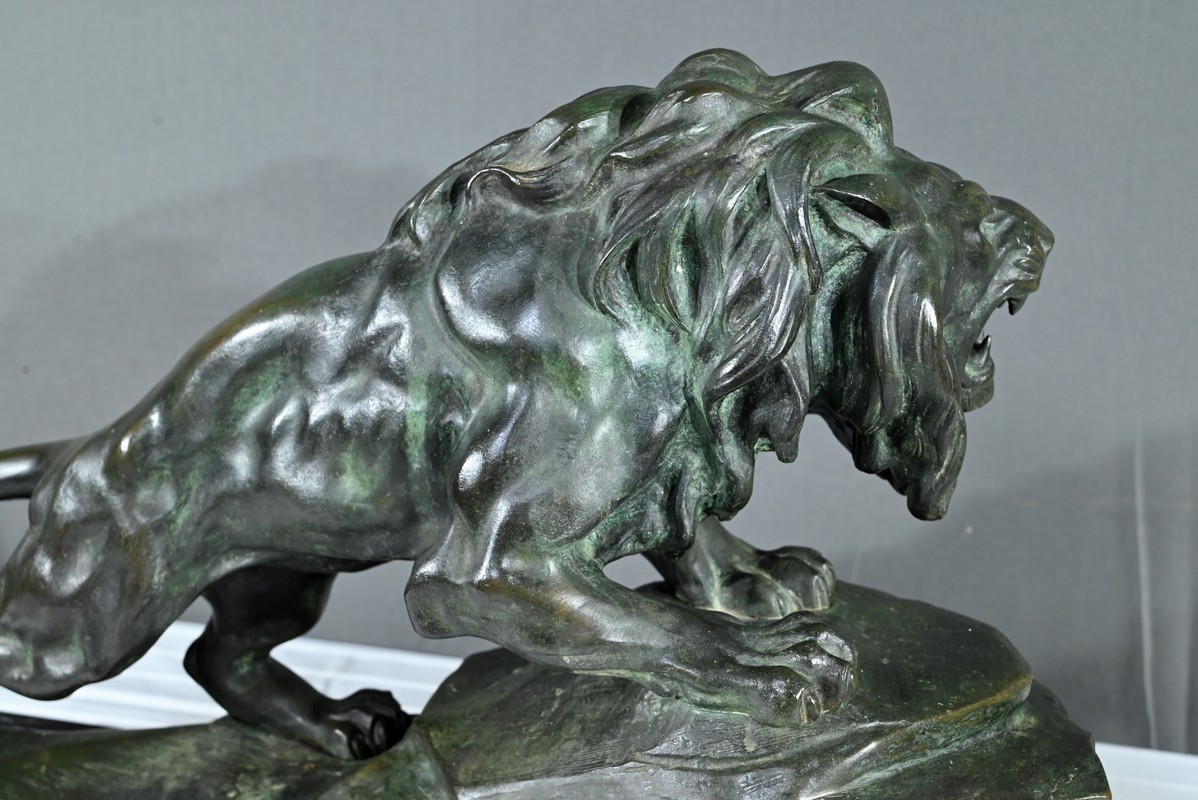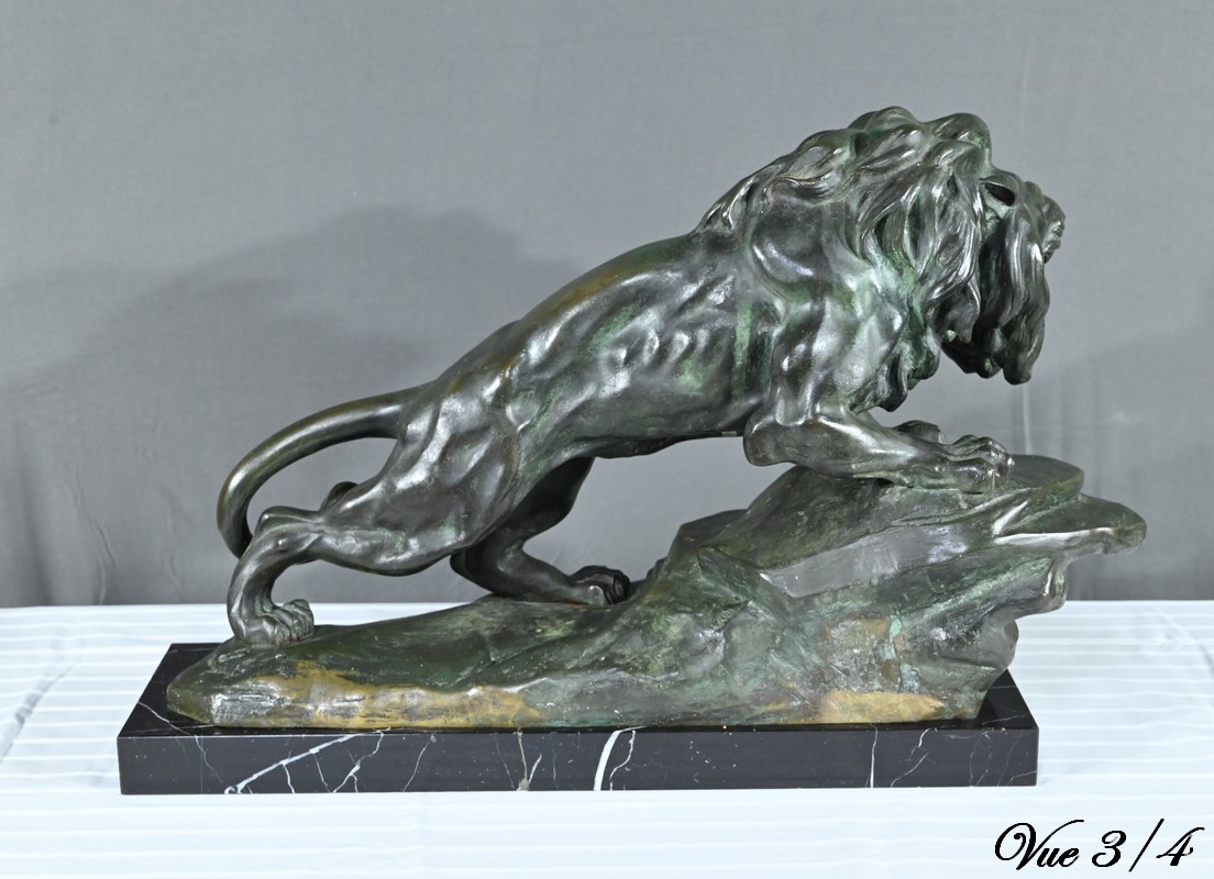 Cette sculpture se distingue par la qualité de sa réalisation, capturant l’essence du mouvement et de la force du lion, ainsi que par la signature de l’artiste, qui ajoute de la valeur à la pièce.