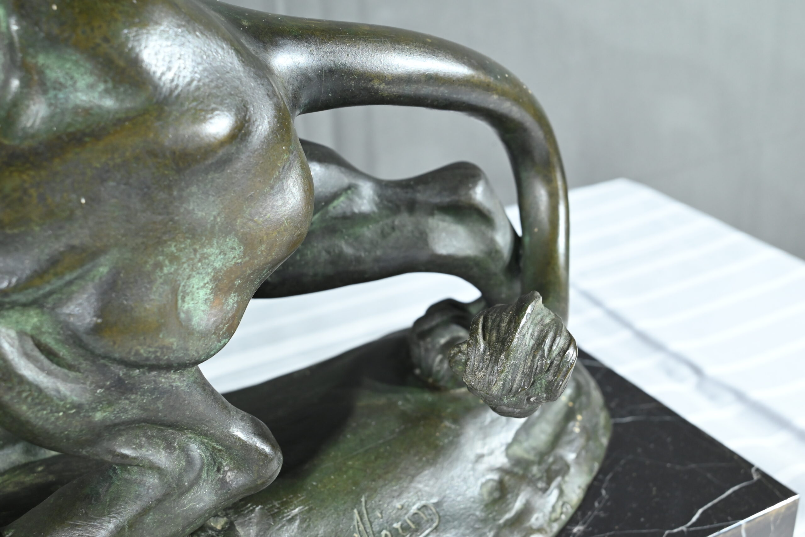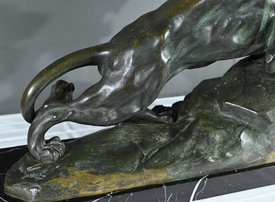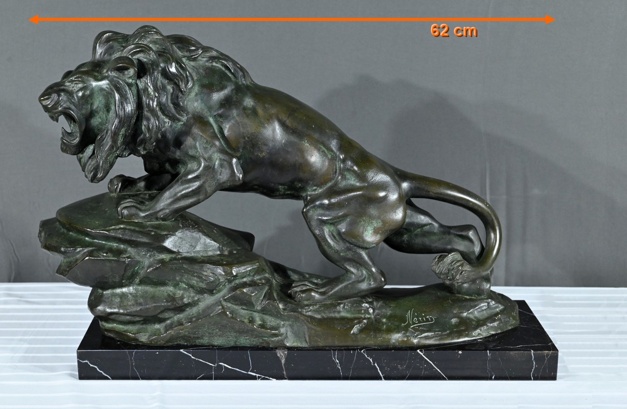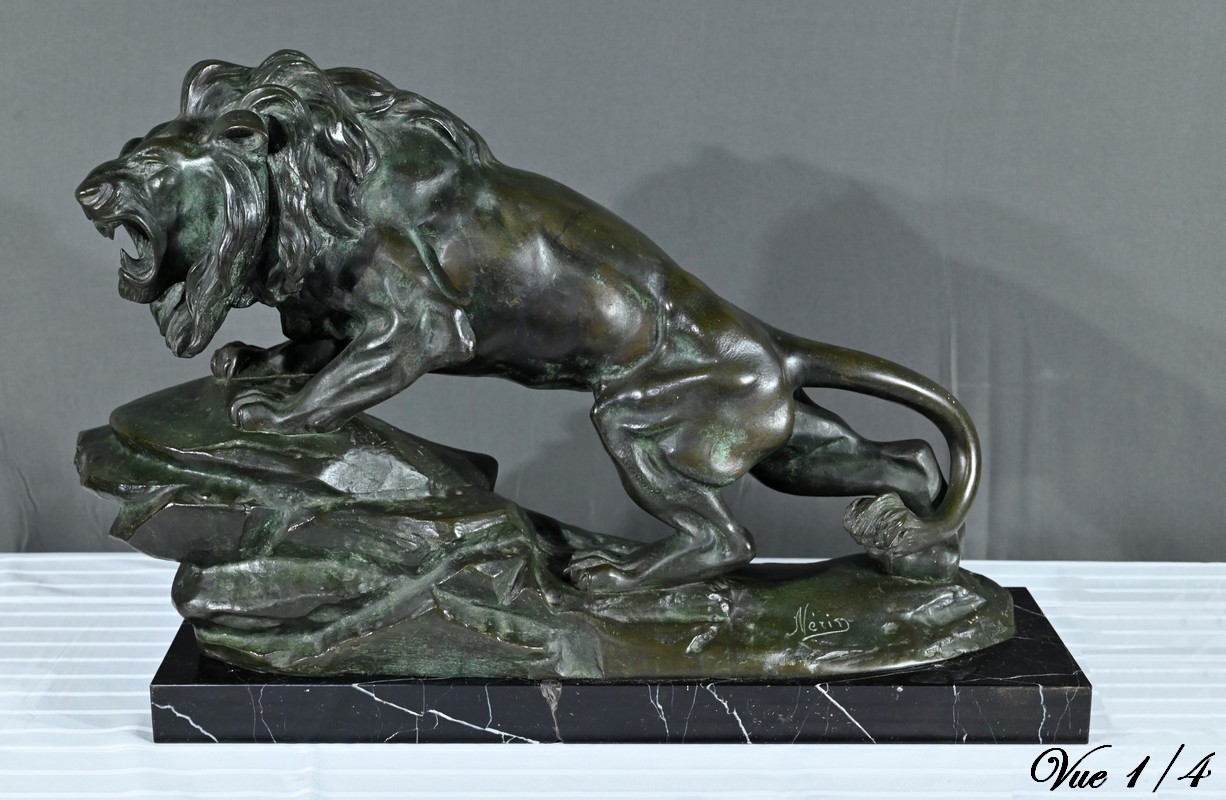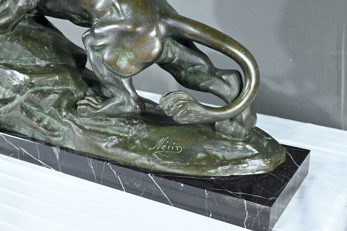 Cette sculpture se distingue par la qualité de sa réalisation, capturant l’essence du mouvement et de la force du lion, ainsi que par la signature de l’artiste, qui ajoute de la valeur à la pièce.