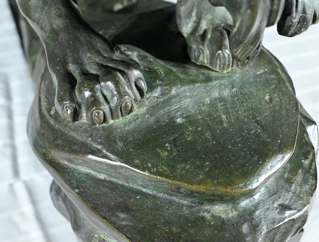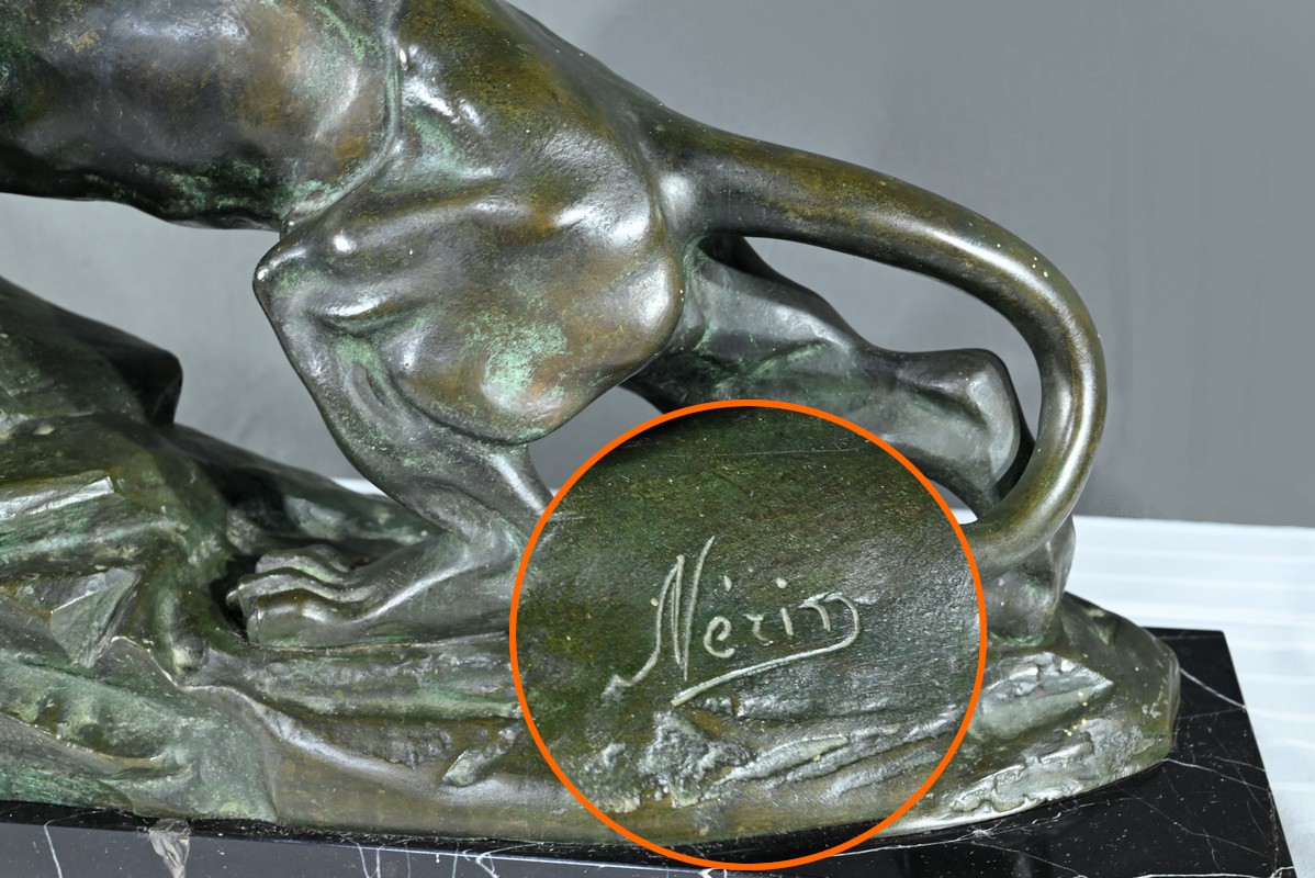 Sculpture en bronze, à double patine verte et brune, signée Nérin sur la terrasse.