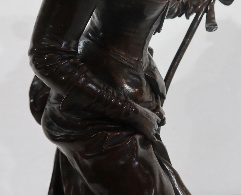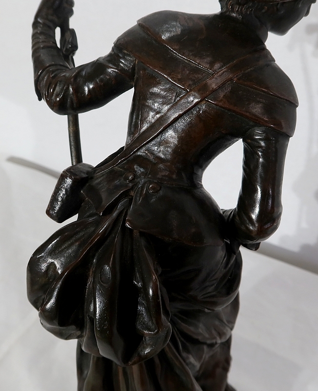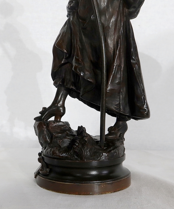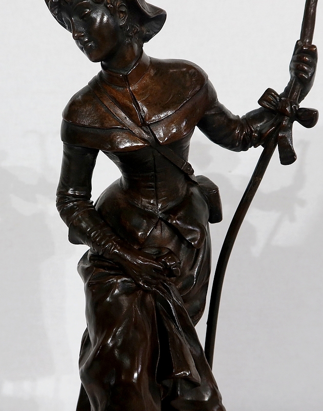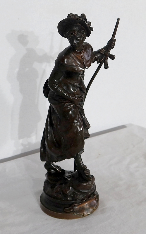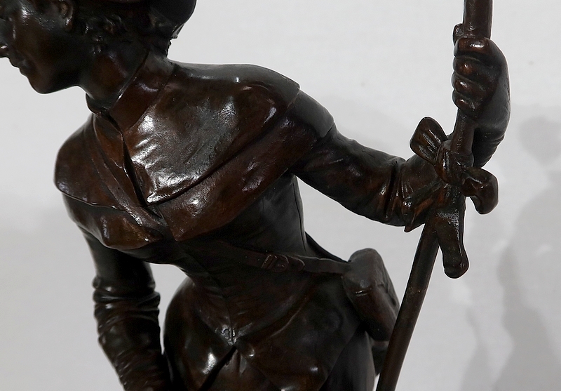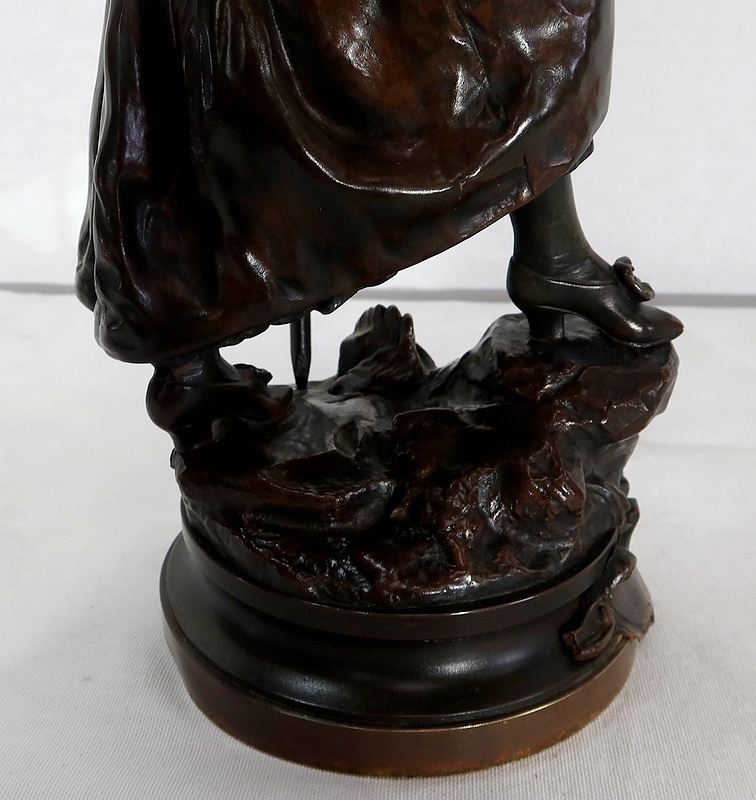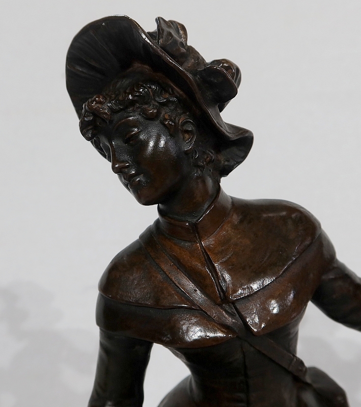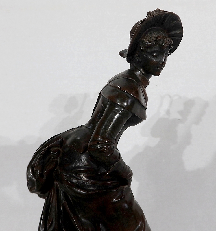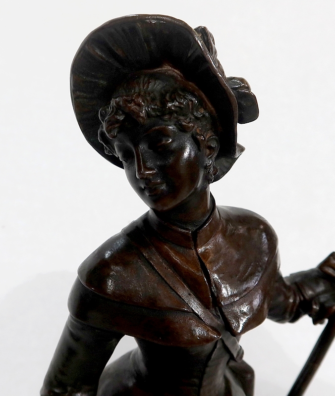 Belle et grande épreuve à patine brune d’Adrien Etienne Gaudez (1845-1902) représentant Miss Helyett parcourant un sentier de montagne.