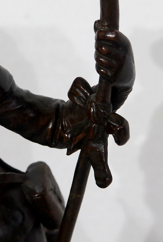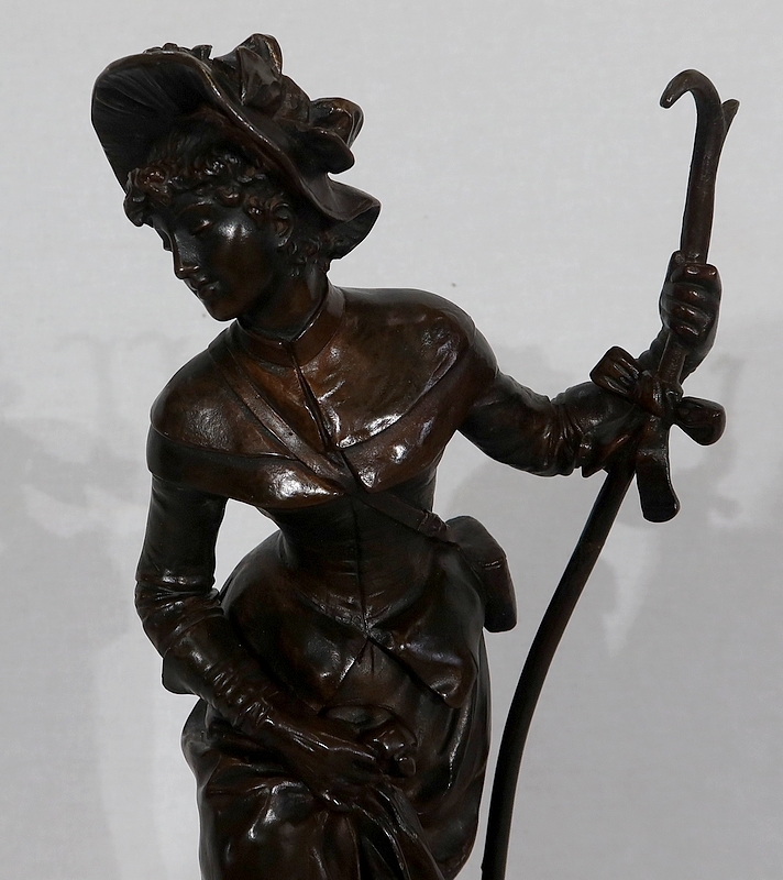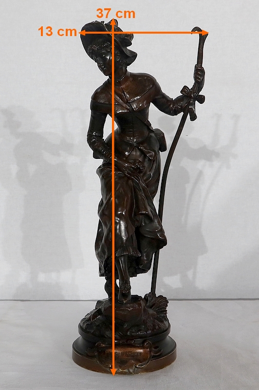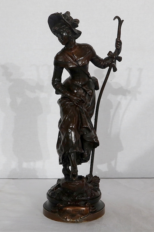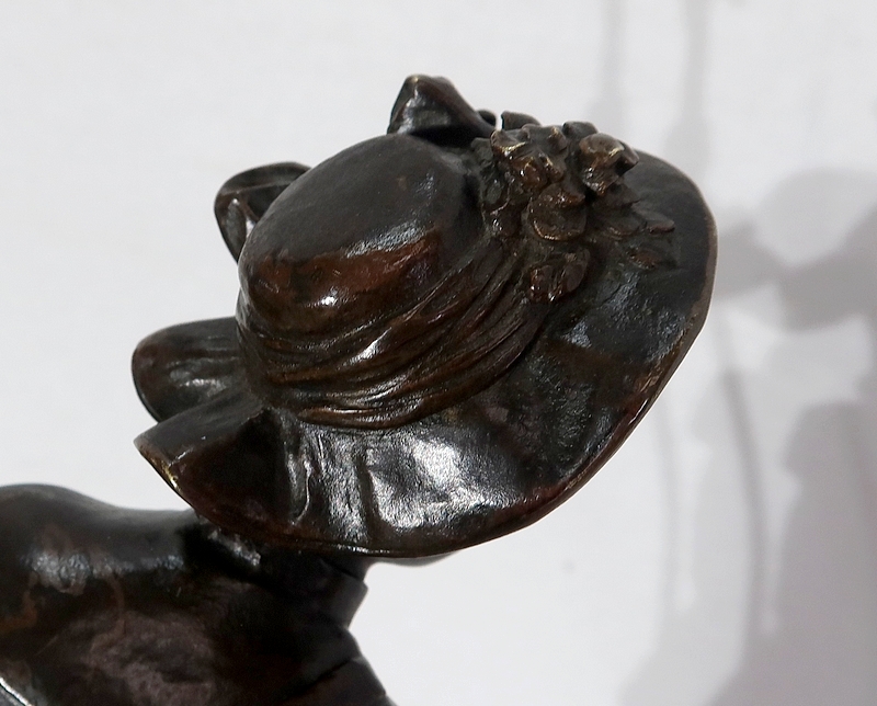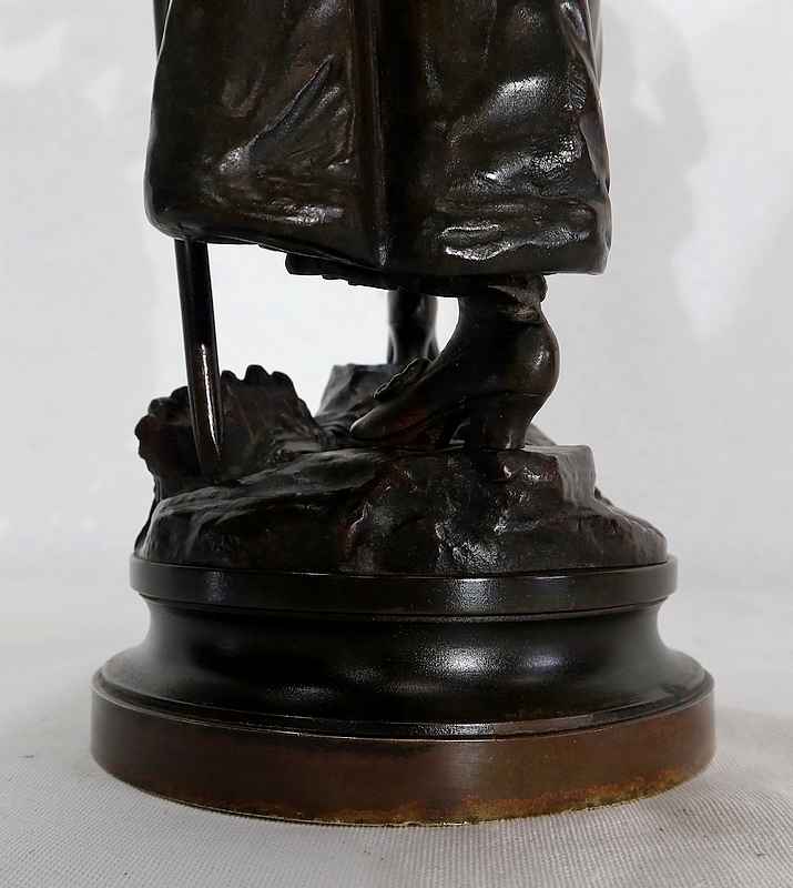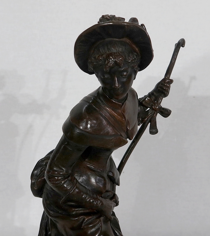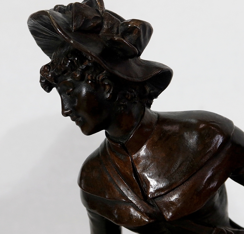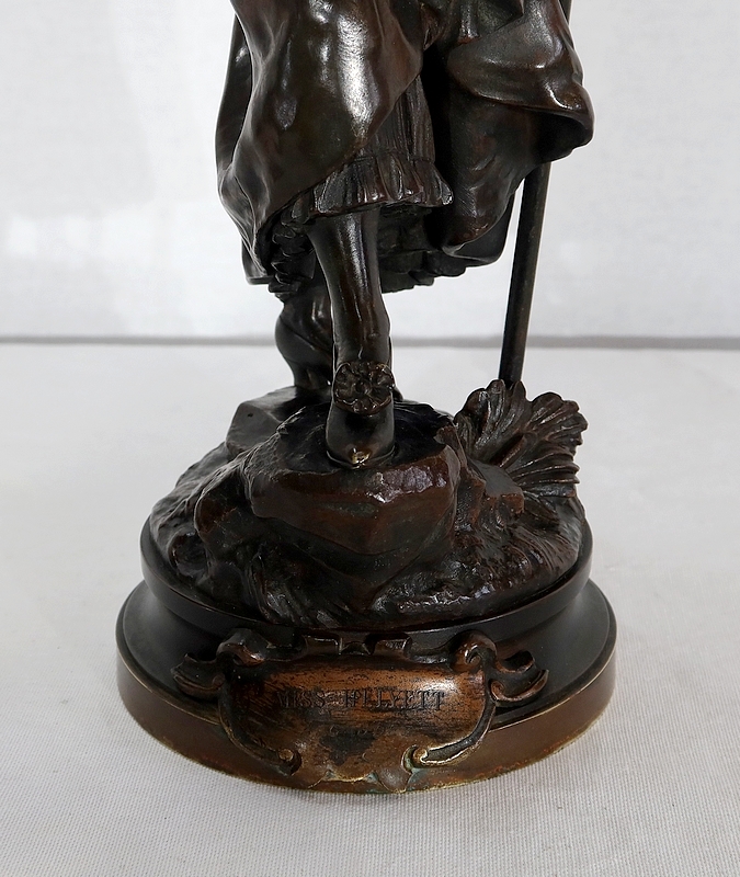 Belle et grande épreuve à patine brune d’Adrien Etienne Gaudez (1845-1902) représentant Miss Helyett parcourant un sentier de montagne.