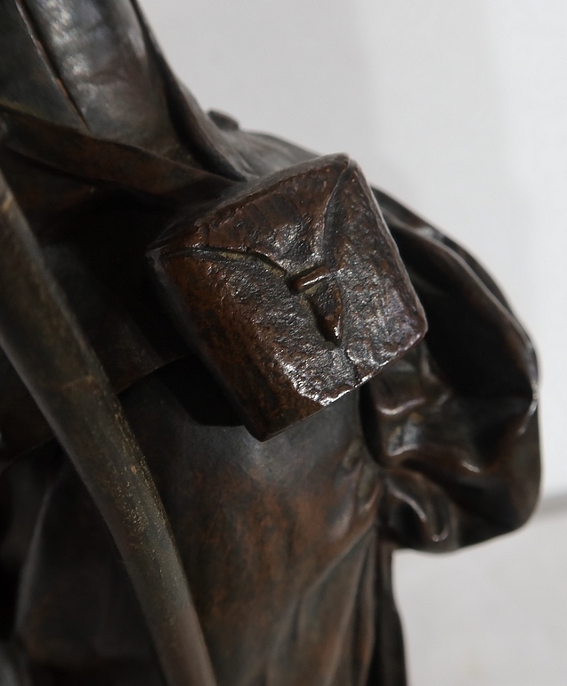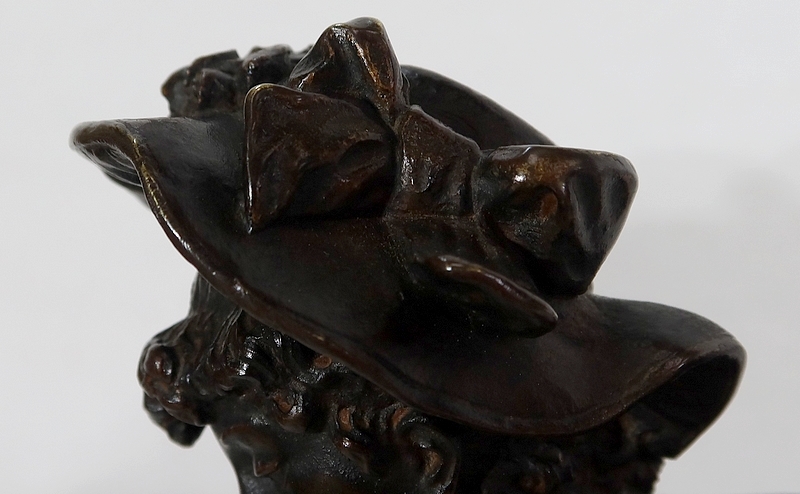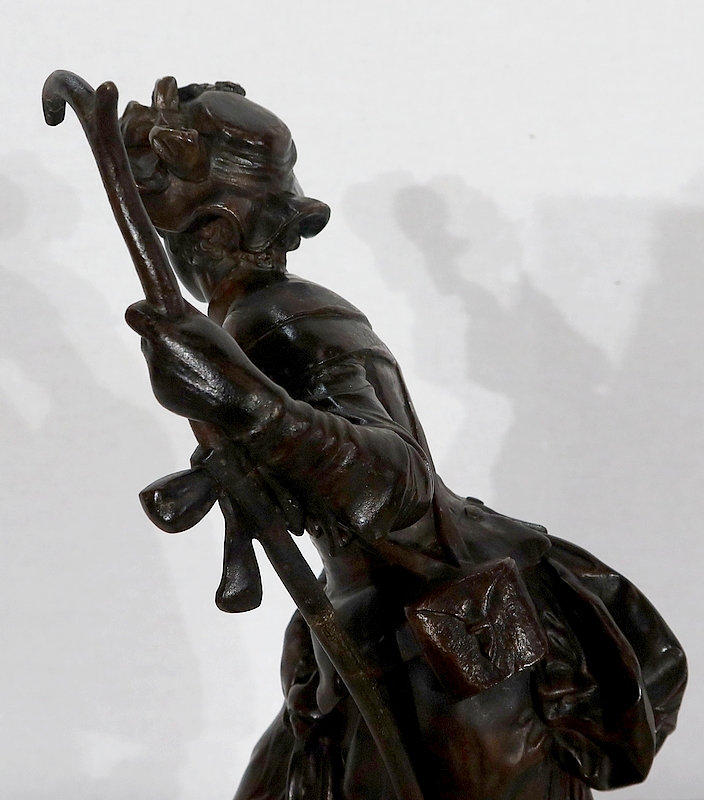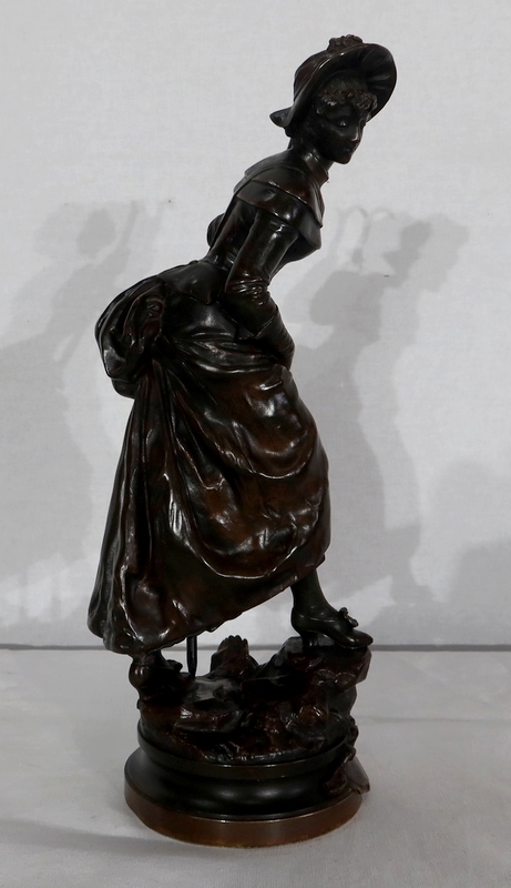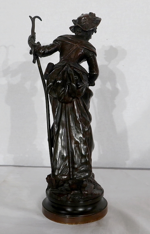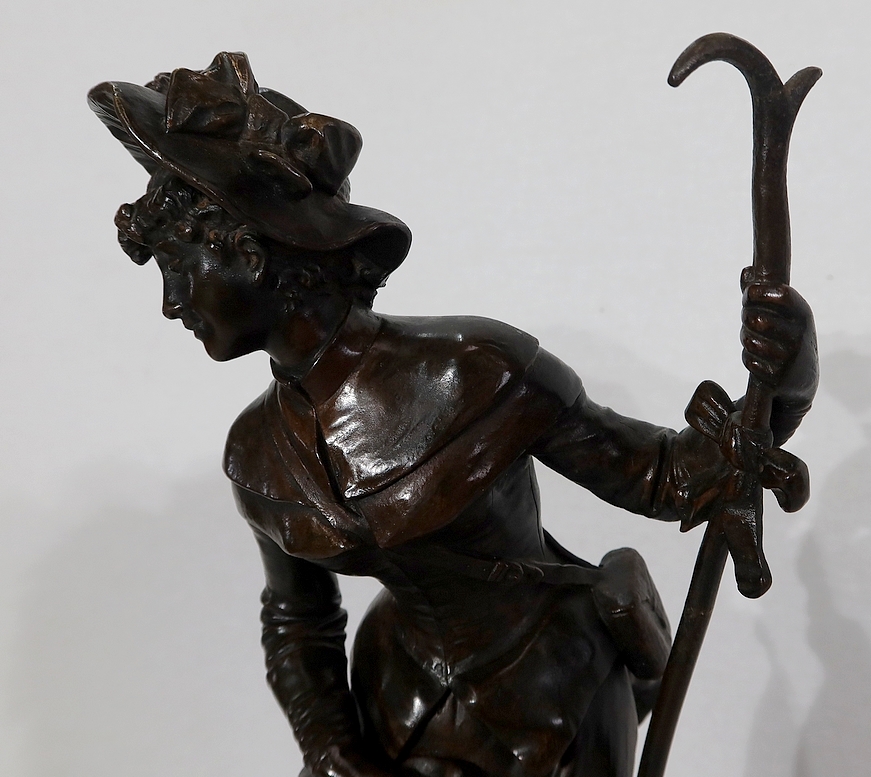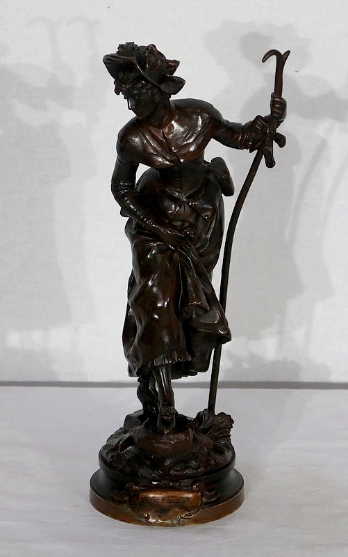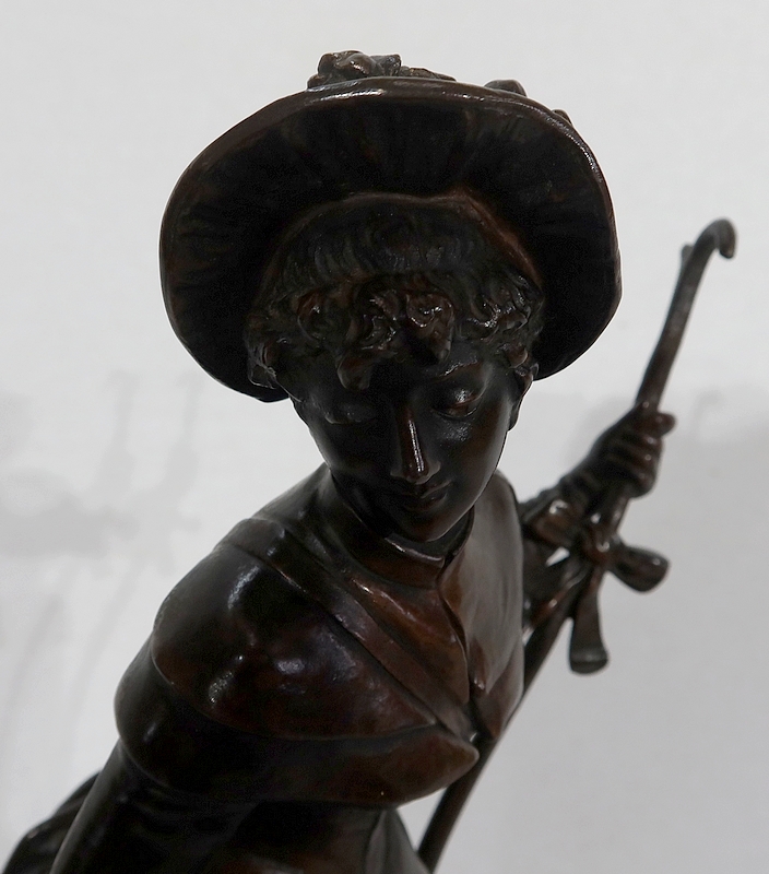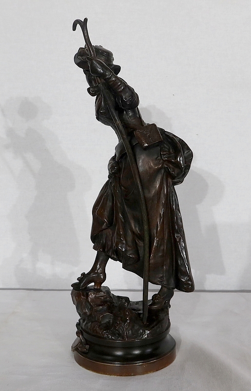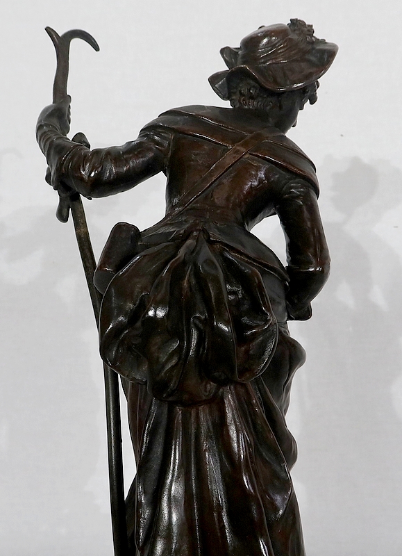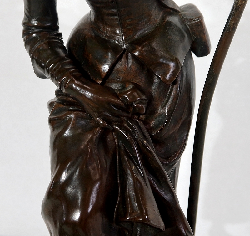 Belle et grande épreuve à patine brune d’Adrien Etienne Gaudez (1845-1902) représentant Miss Helyett parcourant un sentier de montagne.