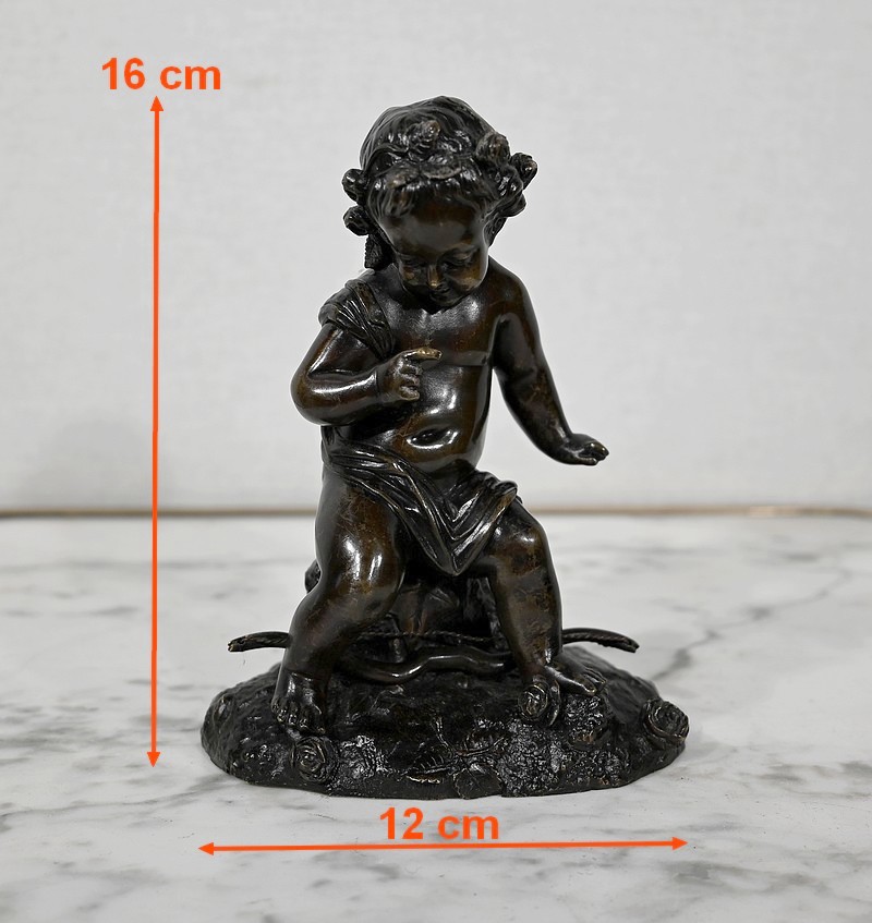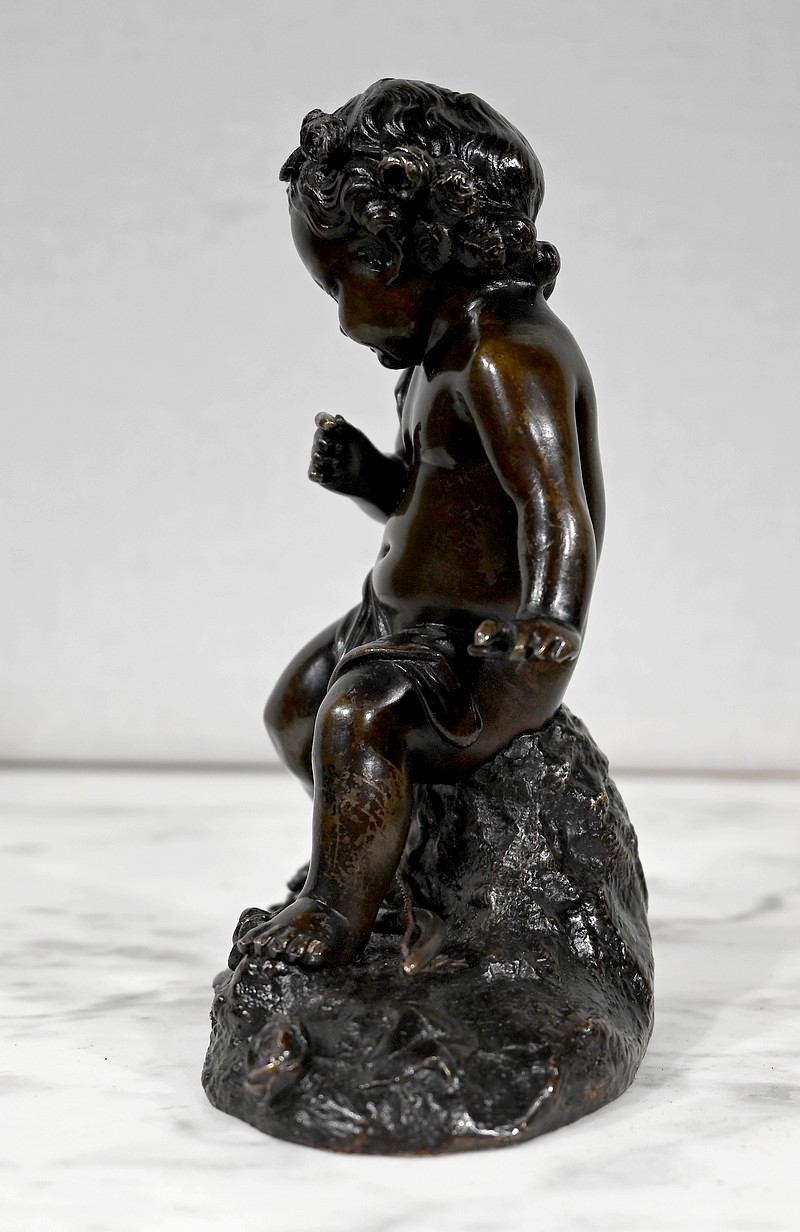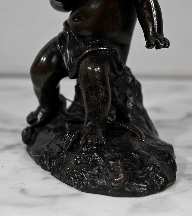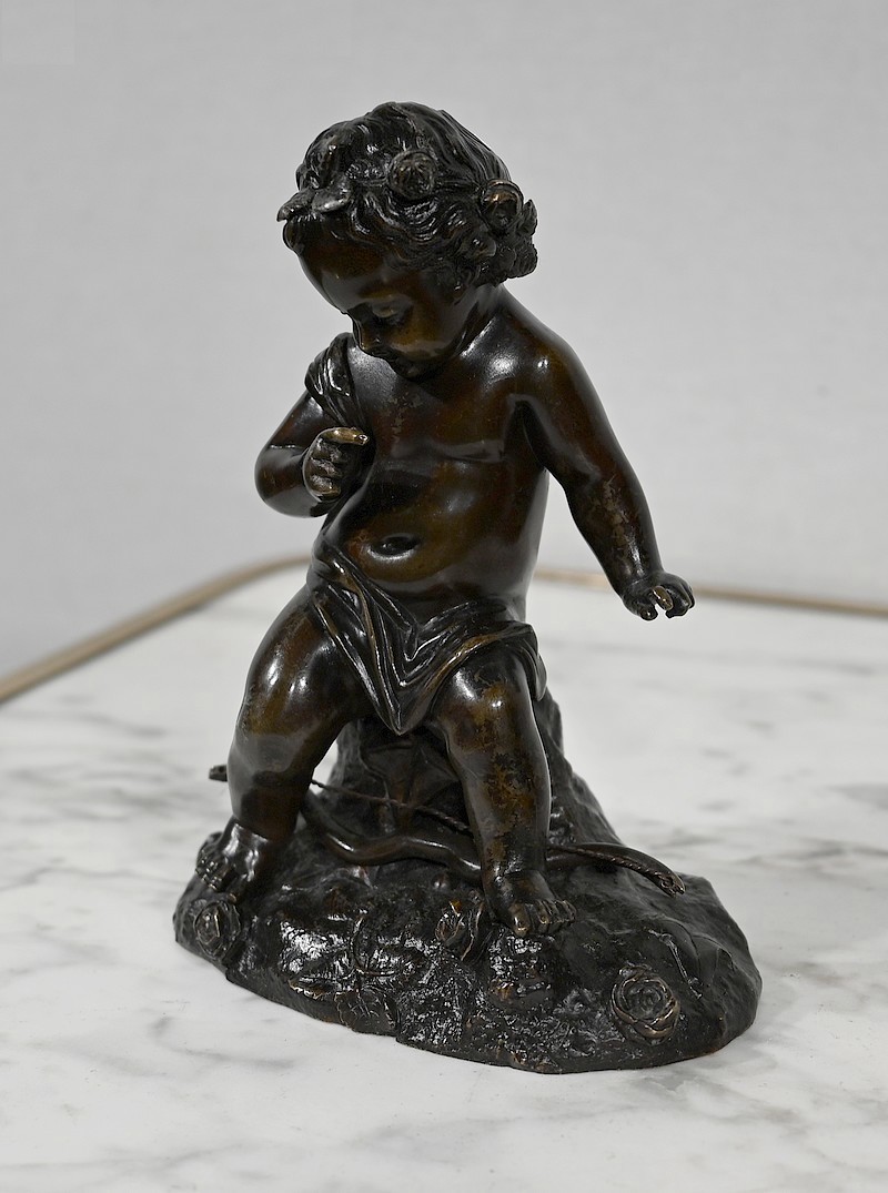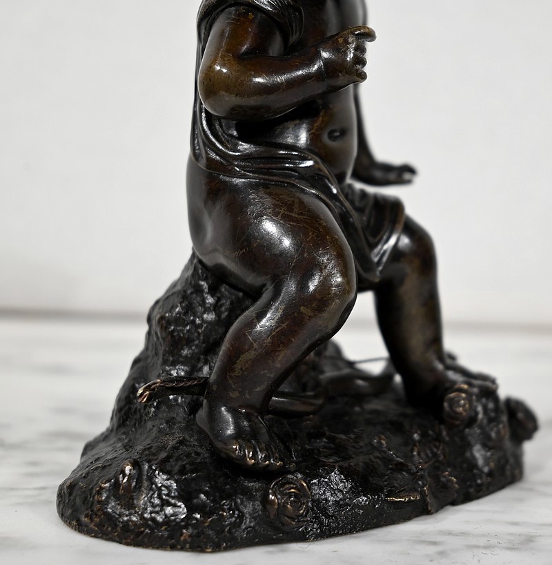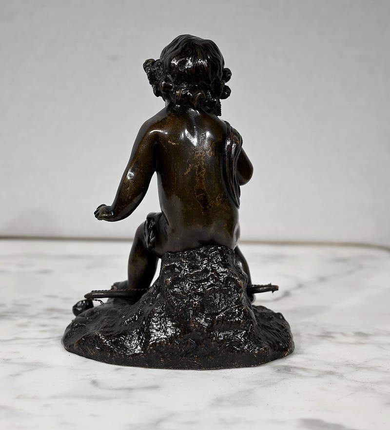 Charmante épreuve du XIXe siècle, en bronze à patine brune figurant un Cupidon muni d’un arc posé à ses pieds.