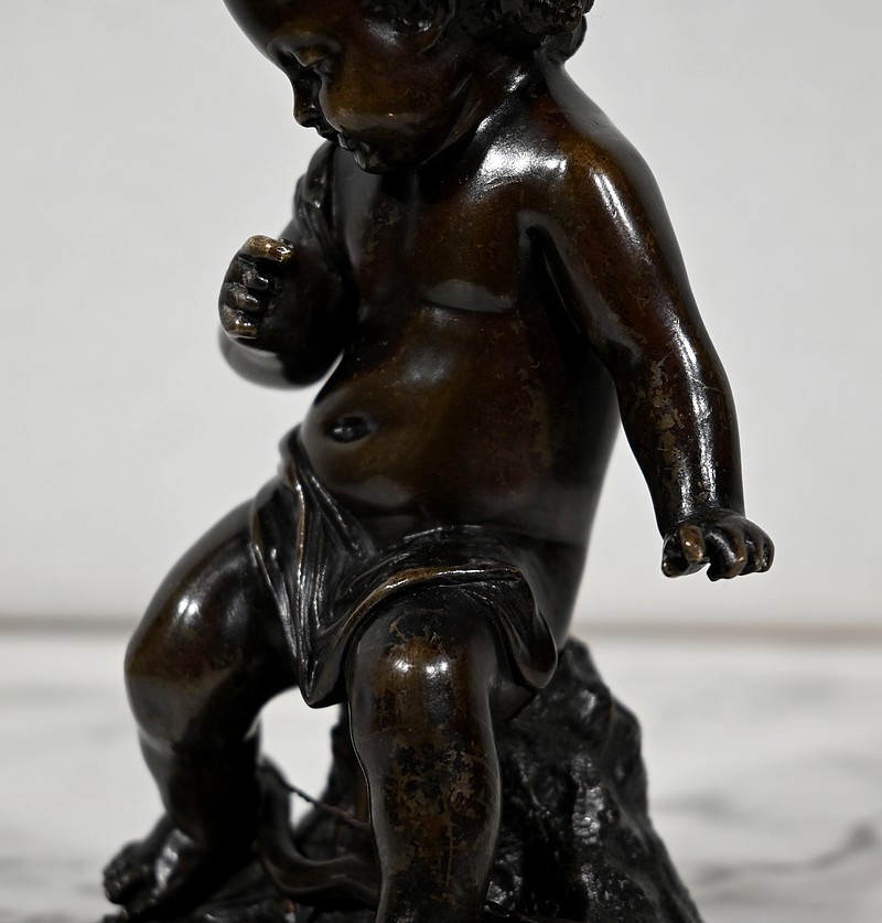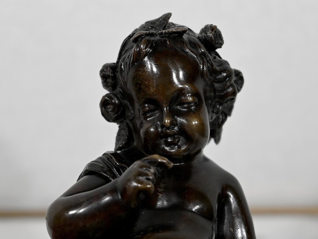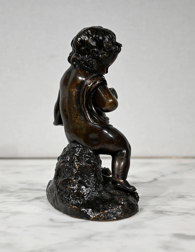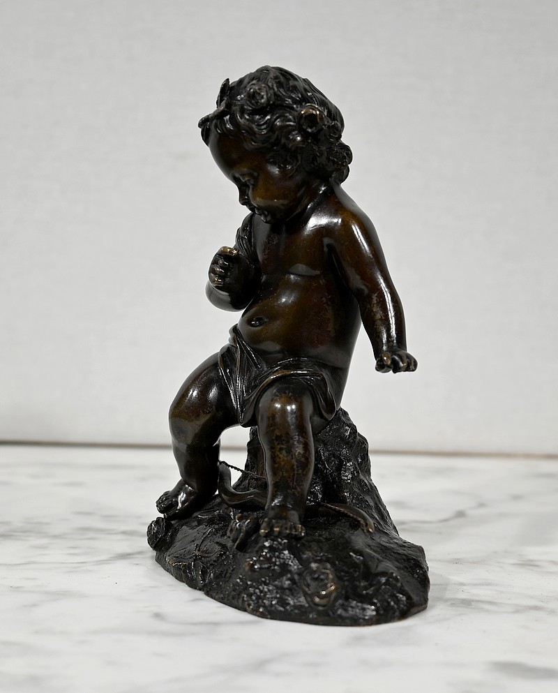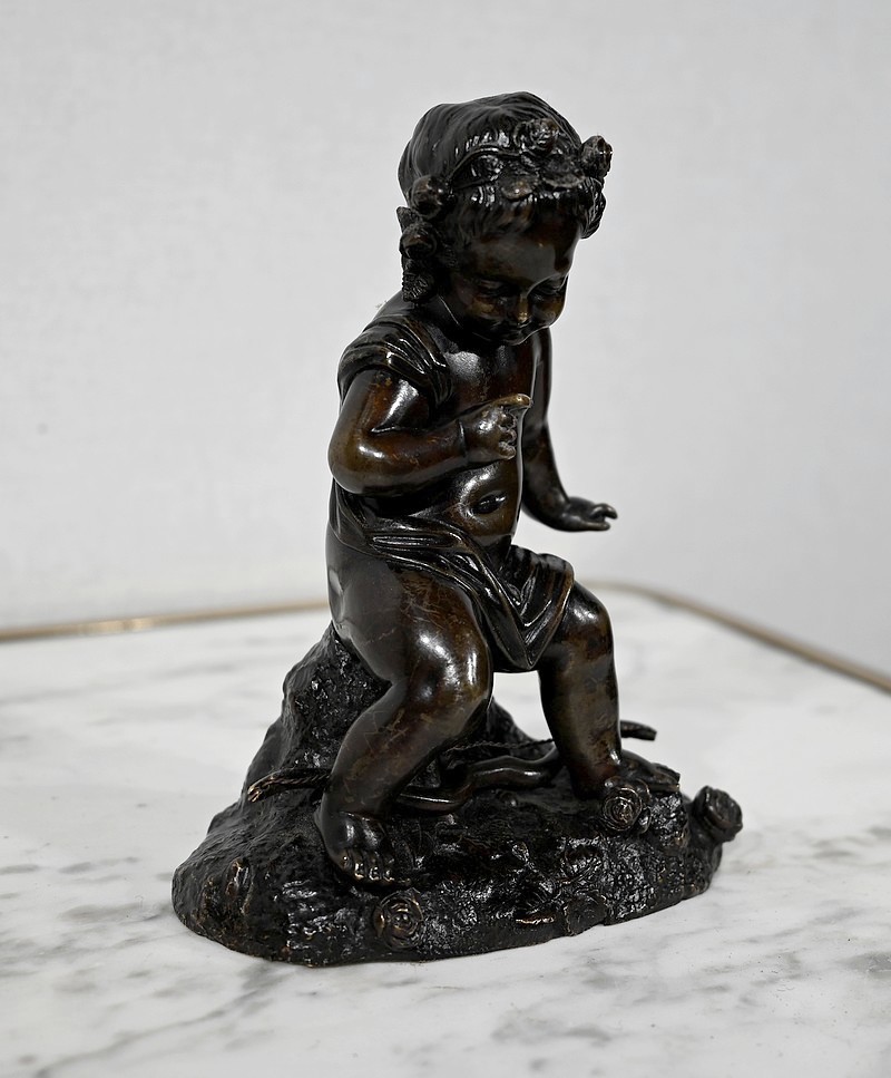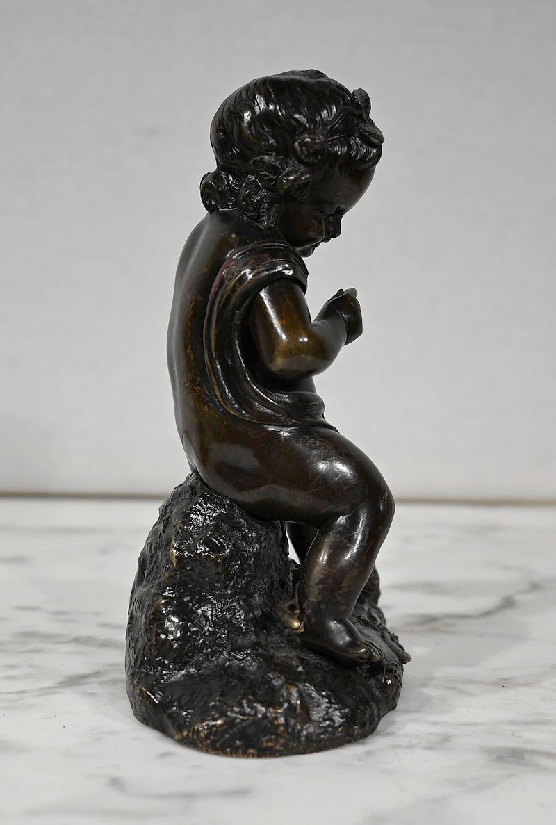 Charmante épreuve du XIXe siècle, en bronze à patine brune figurant un Cupidon muni d’un arc posé à ses pieds.