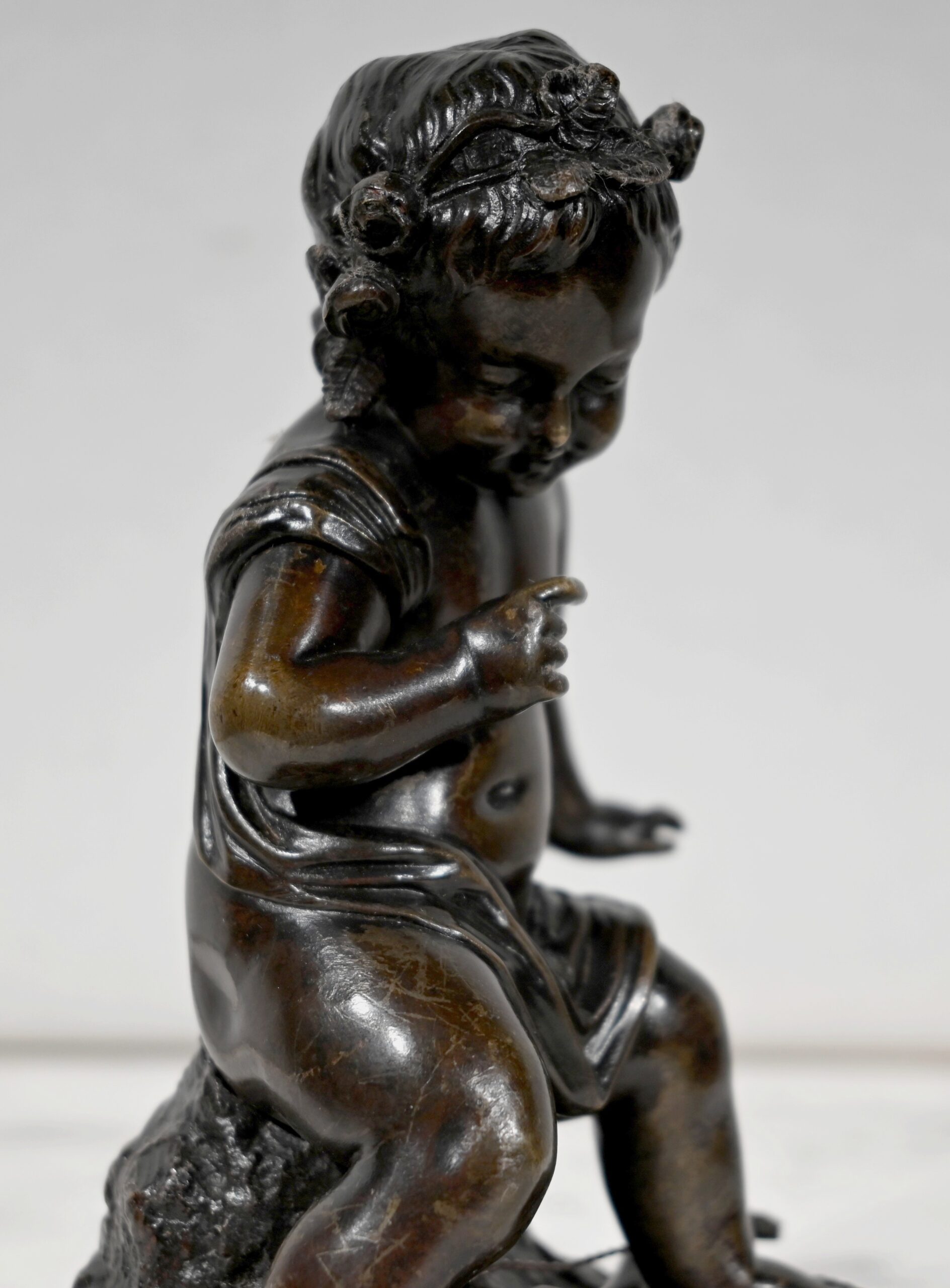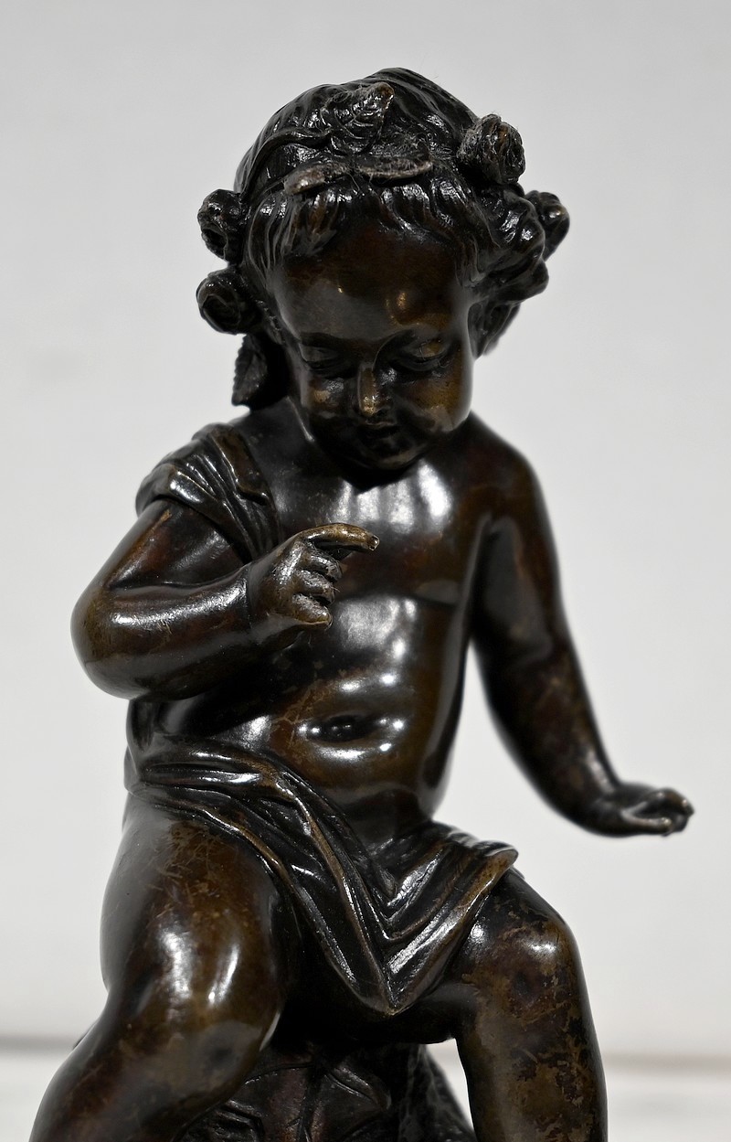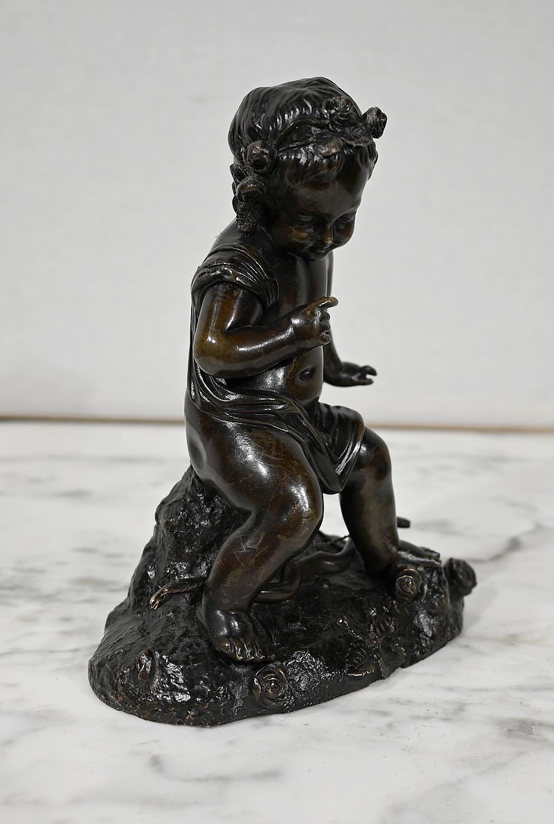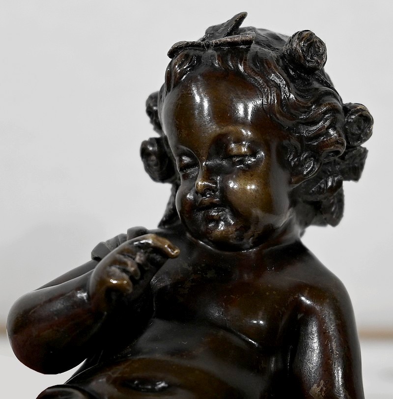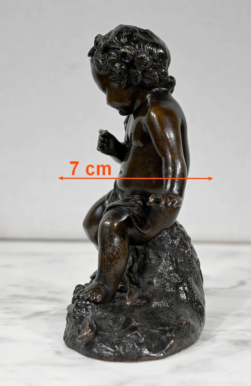 Charmante épreuve du XIXe siècle, en bronze à patine brune figurant un Cupidon muni d’un arc posé à ses pieds.