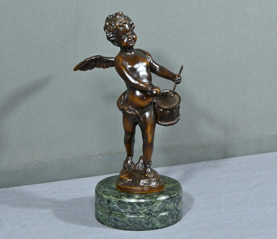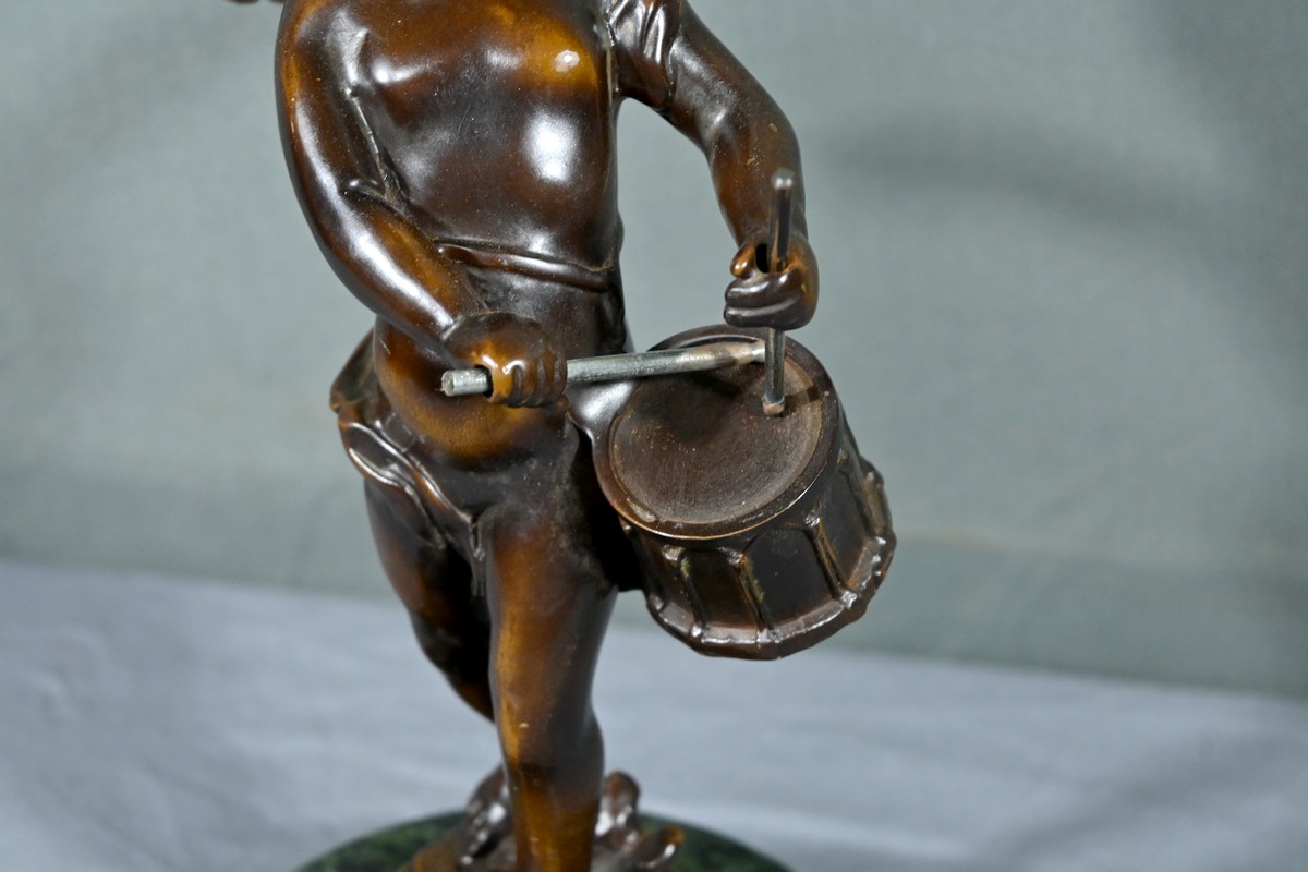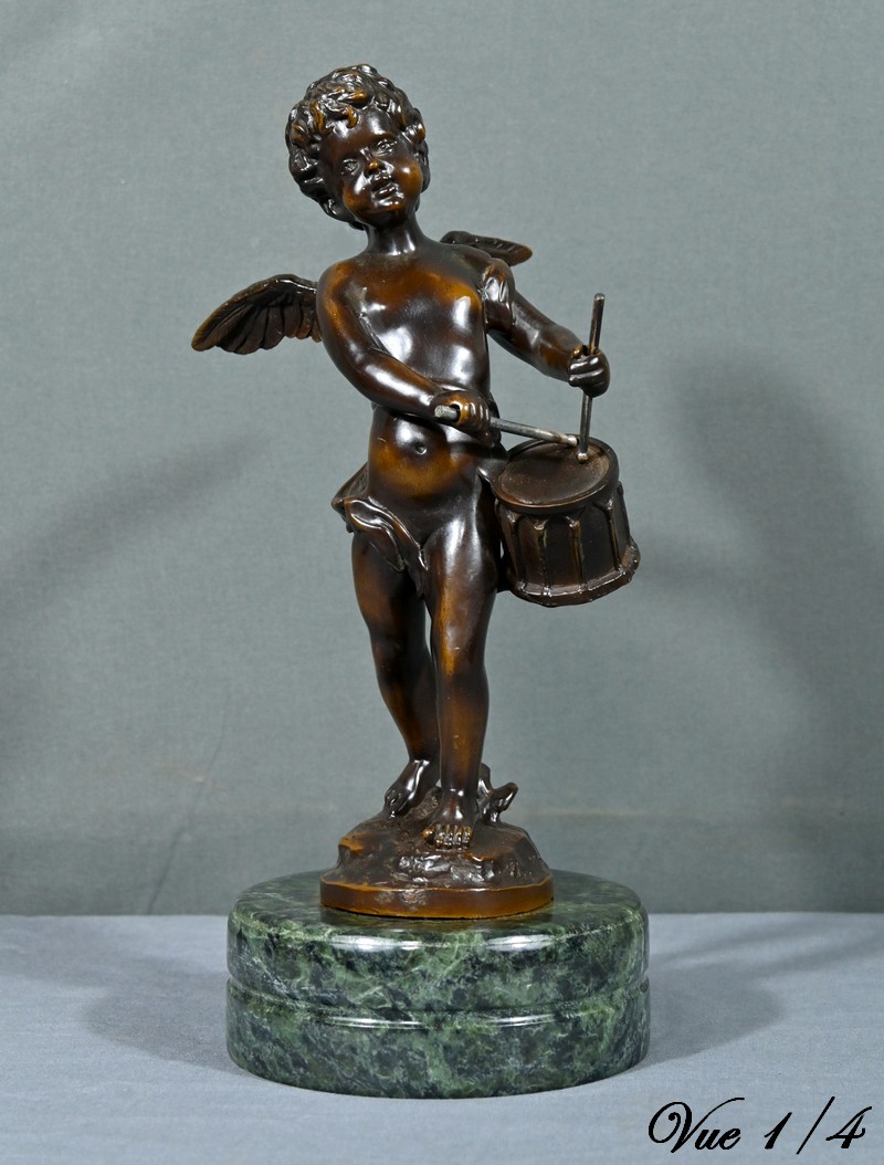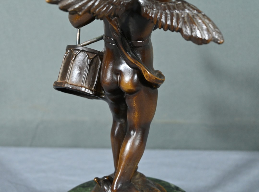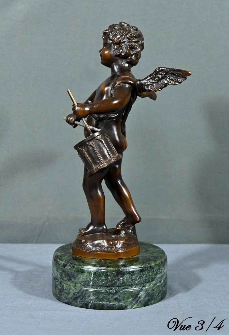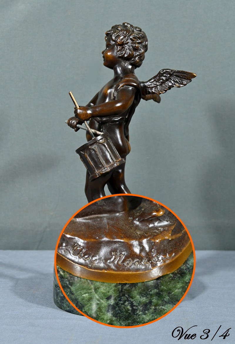 La sculpture en bronze signée Auguste Moreau (1834-1917) représente un putto au tambourin.