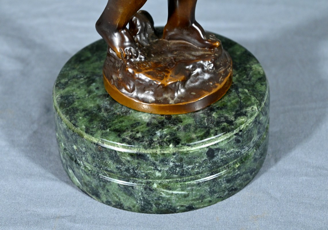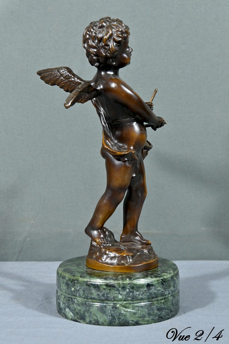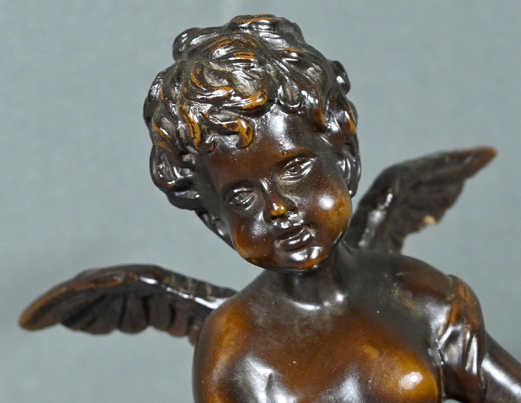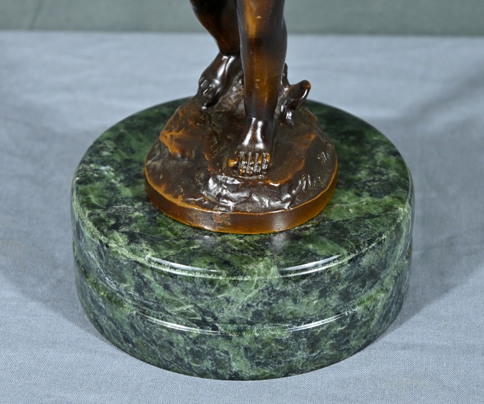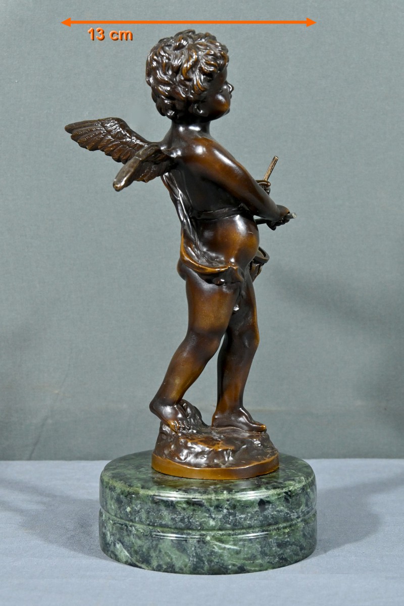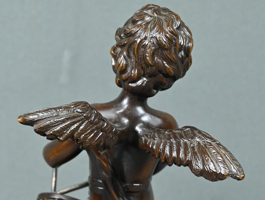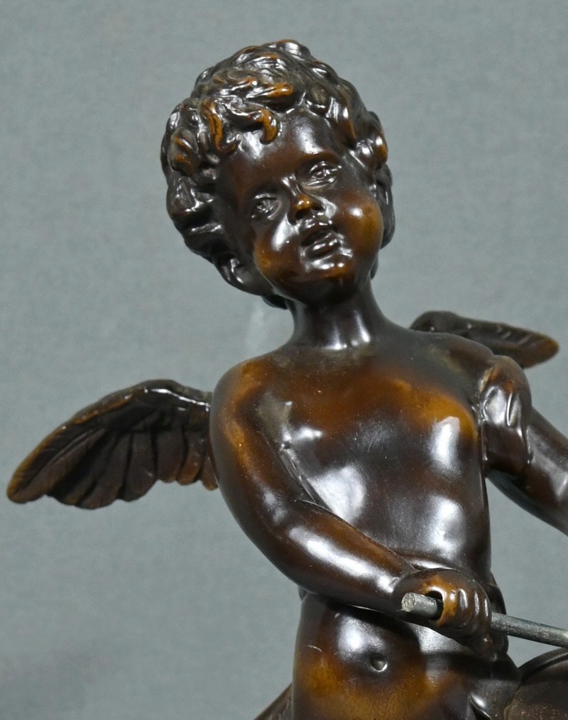 La sculpture en bronze signée Auguste Moreau (1834-1917) représente un putto au tambourin.
