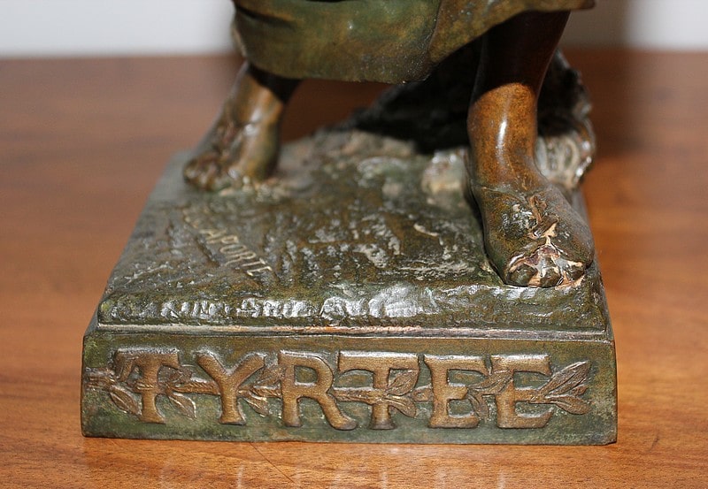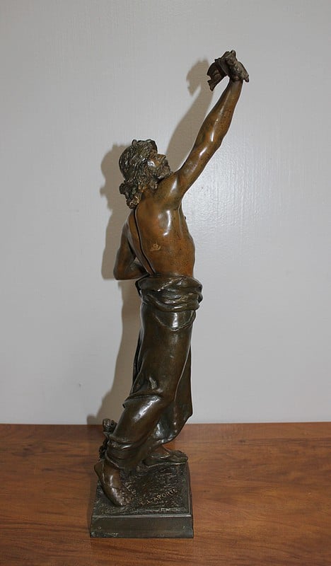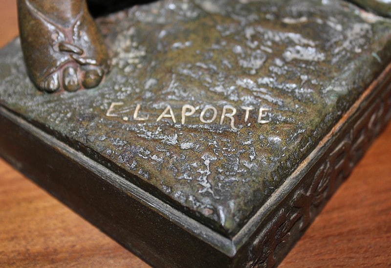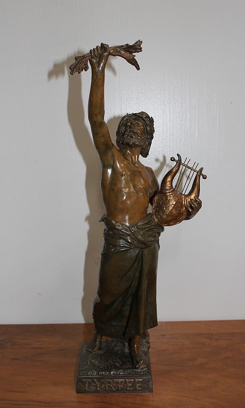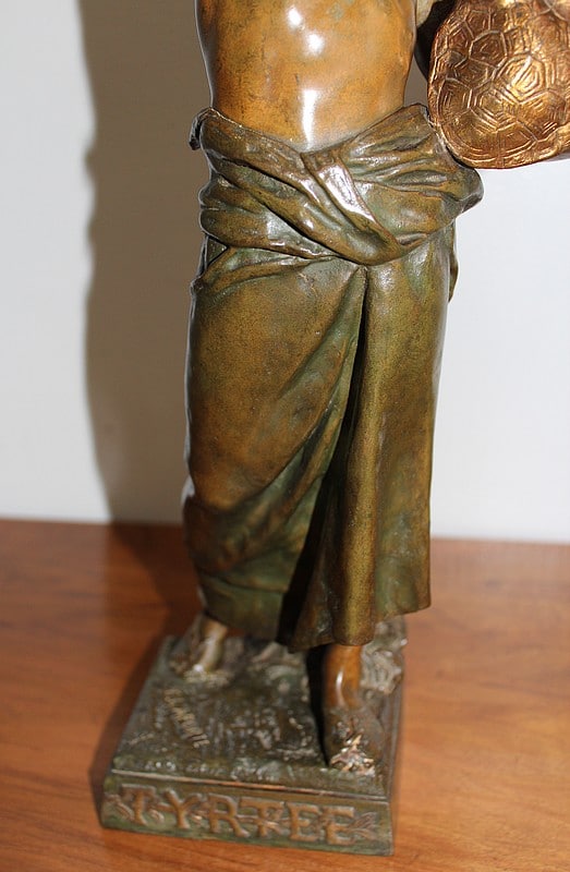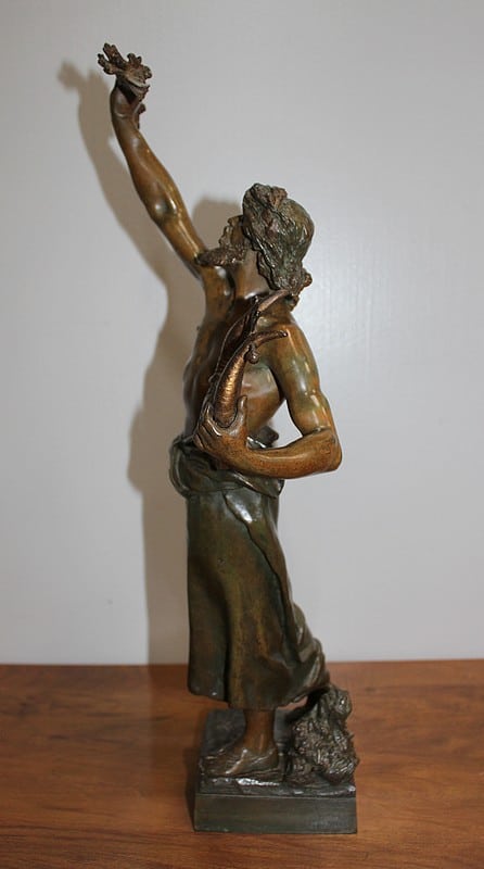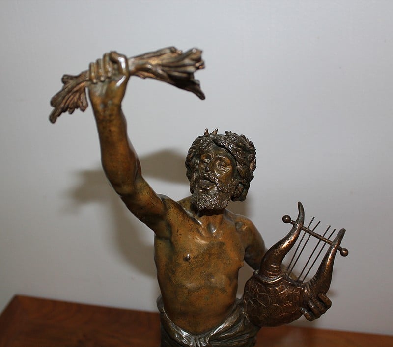 Statue en bronze à patine verte et ocre, représentant un ‘joueur de lyre’. Elle est signée E. LAPORTE (Emile LAPORTE, Sculpteur 1858/1907).