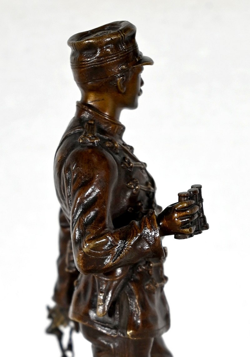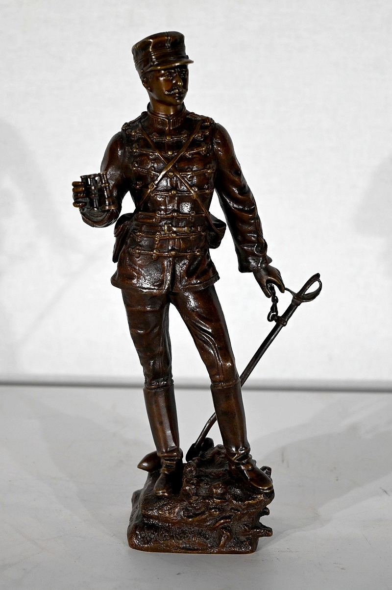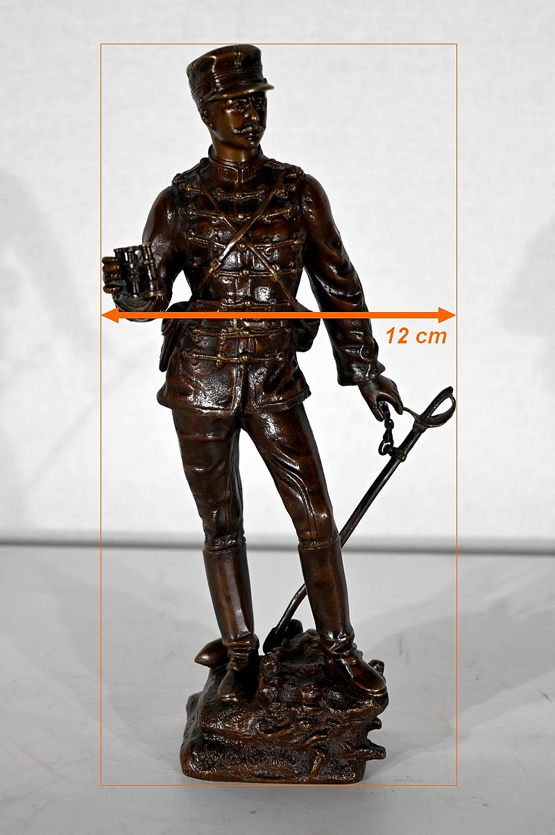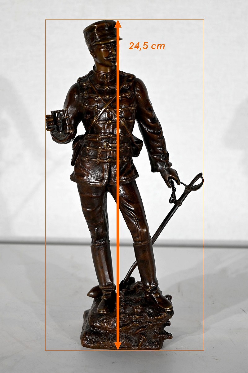 Le fringuant officier est debout, sur le bord d’une tranchée, un obus à ses pieds, les jumelles à la main et son épée dans l’autre. Il scrute avec attention les lignes ennemies.