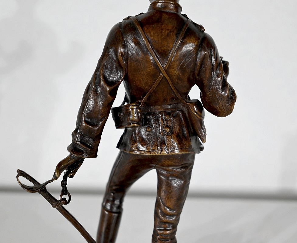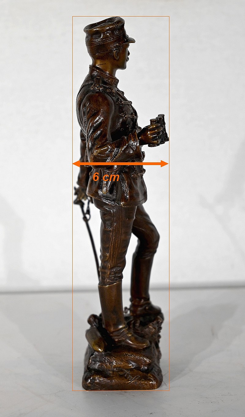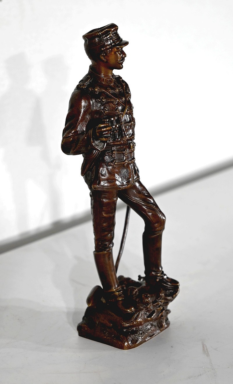 Le fringuant officier est debout, sur le bord d’une tranchée, un obus à ses pieds, les jumelles à la main et son épée dans l’autre. Il scrute avec attention les lignes ennemies.