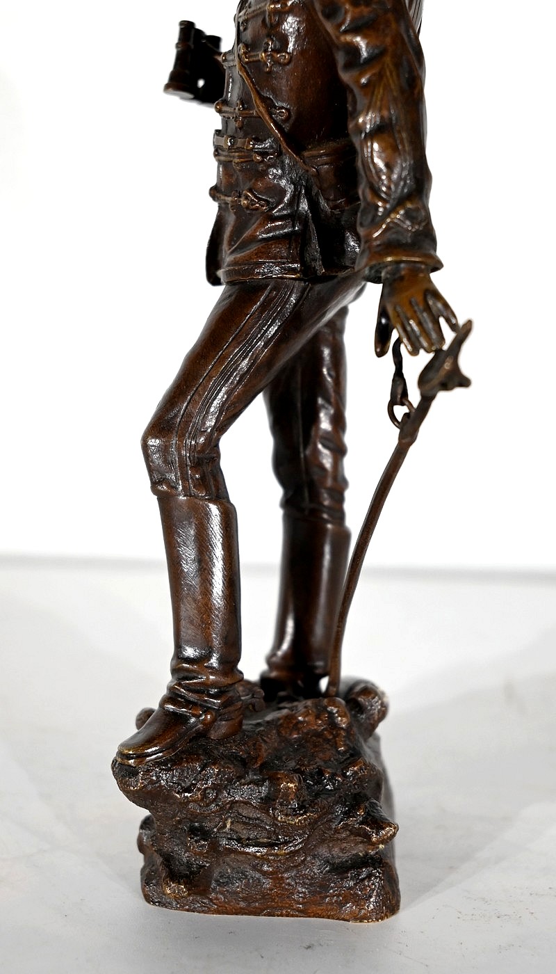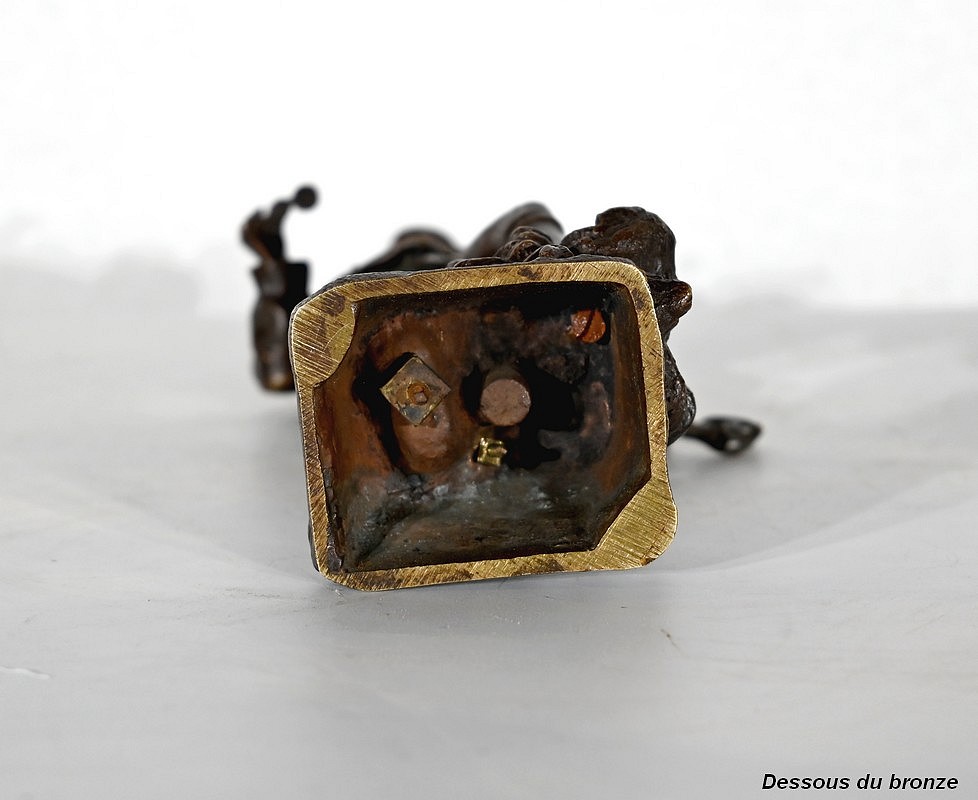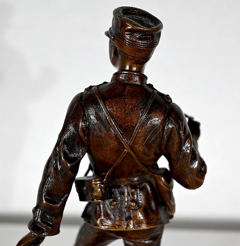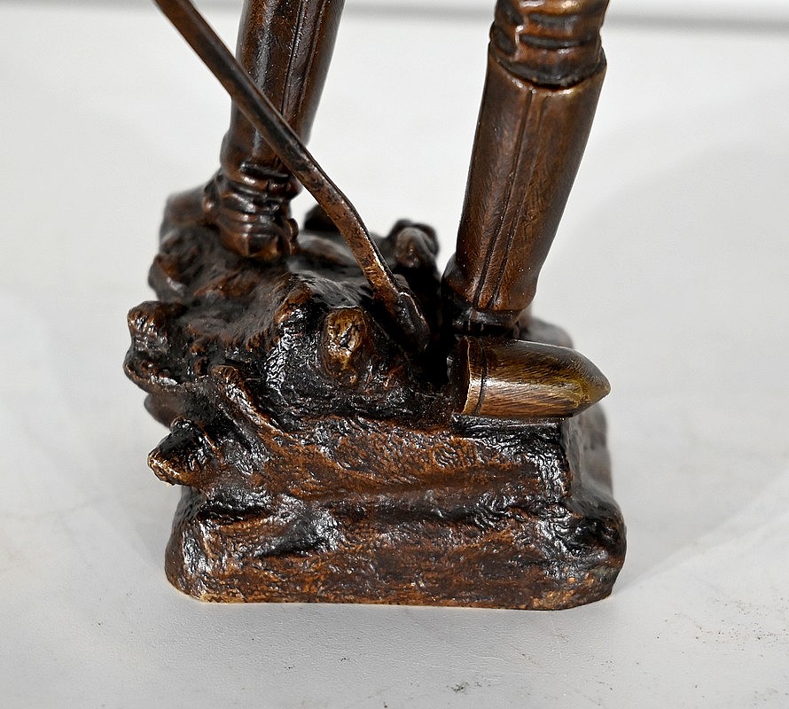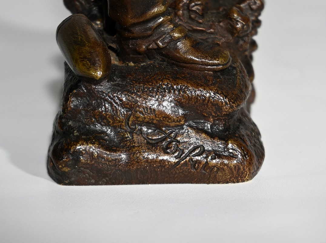 Bronze à patine brune, signé Charles Anfrie (1833-1905), sculpteur français connu pour ses nombreux bronzes faisant référence à des thèmes historiques, mythologiques et de la vie quotidienne.