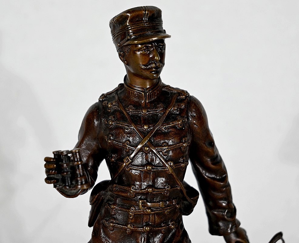 L’œuvre, titrée sur la terrasse ‘’Sur la Brèche’’, représente un lieutenant du 12e régiment de Hussards, bien reconnaissable à son uniforme orné de brandebourgs.