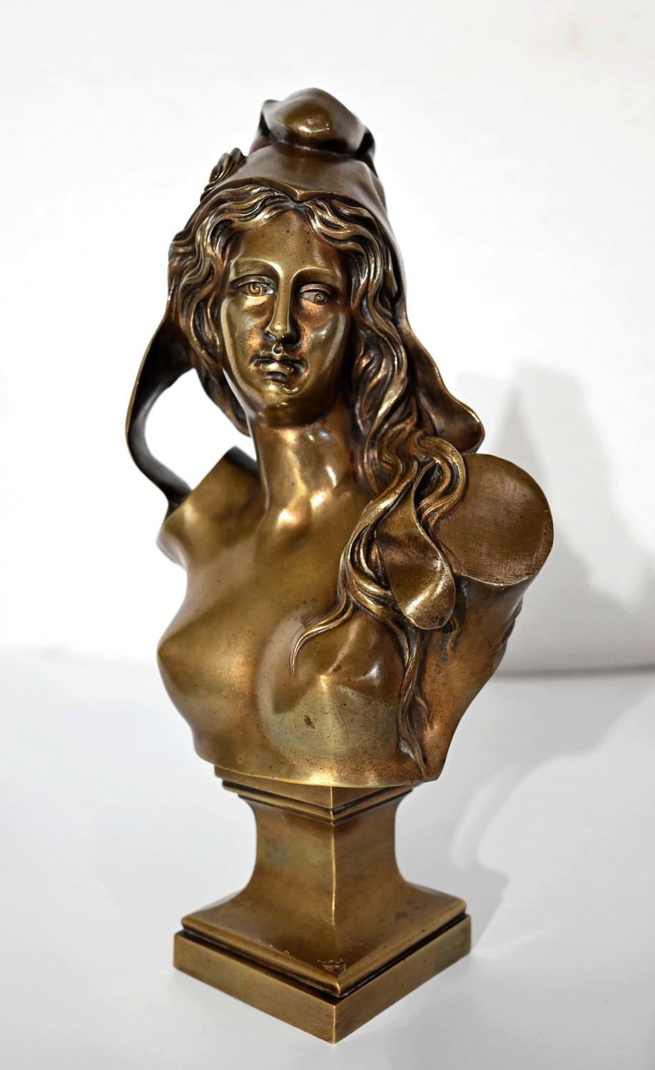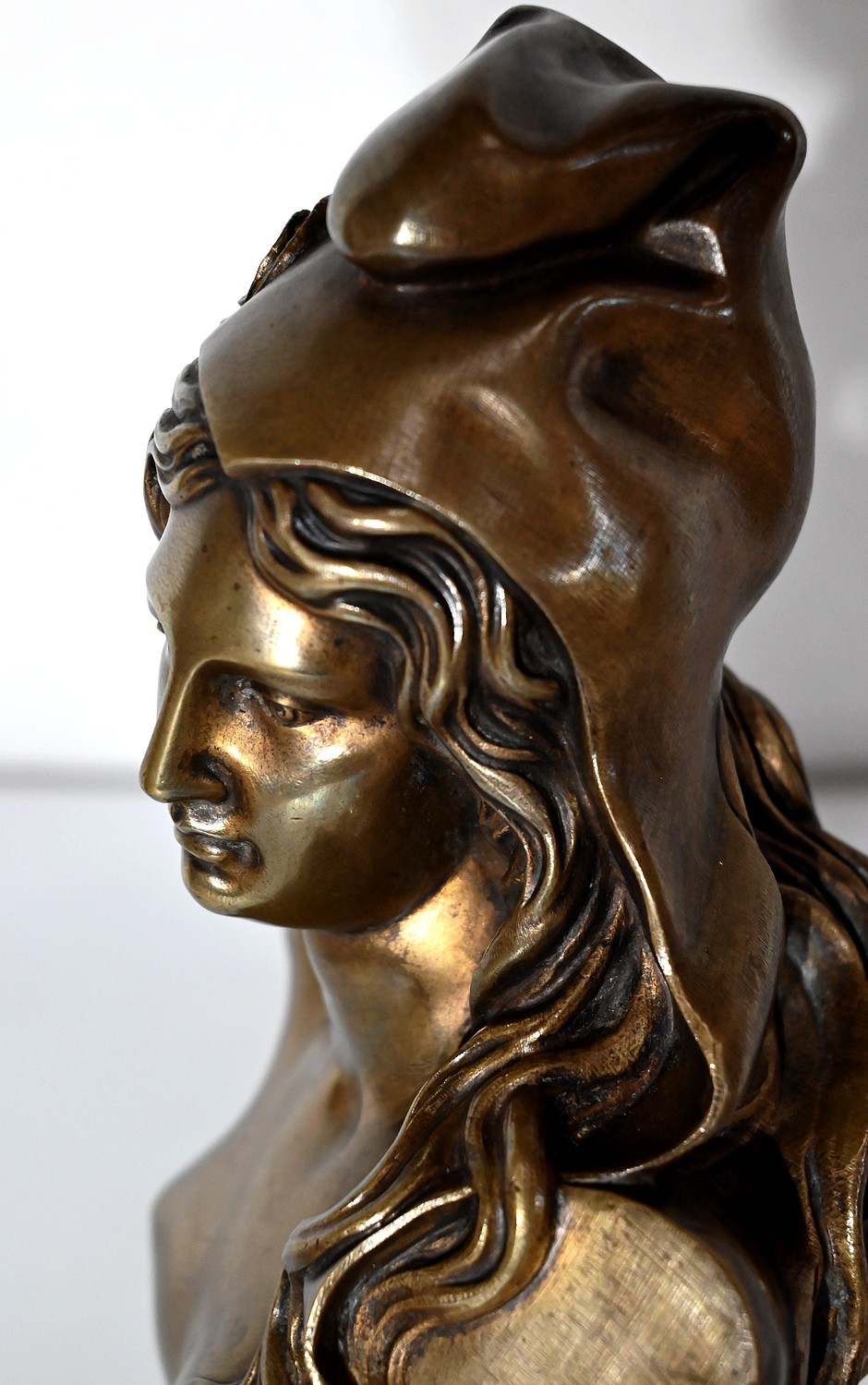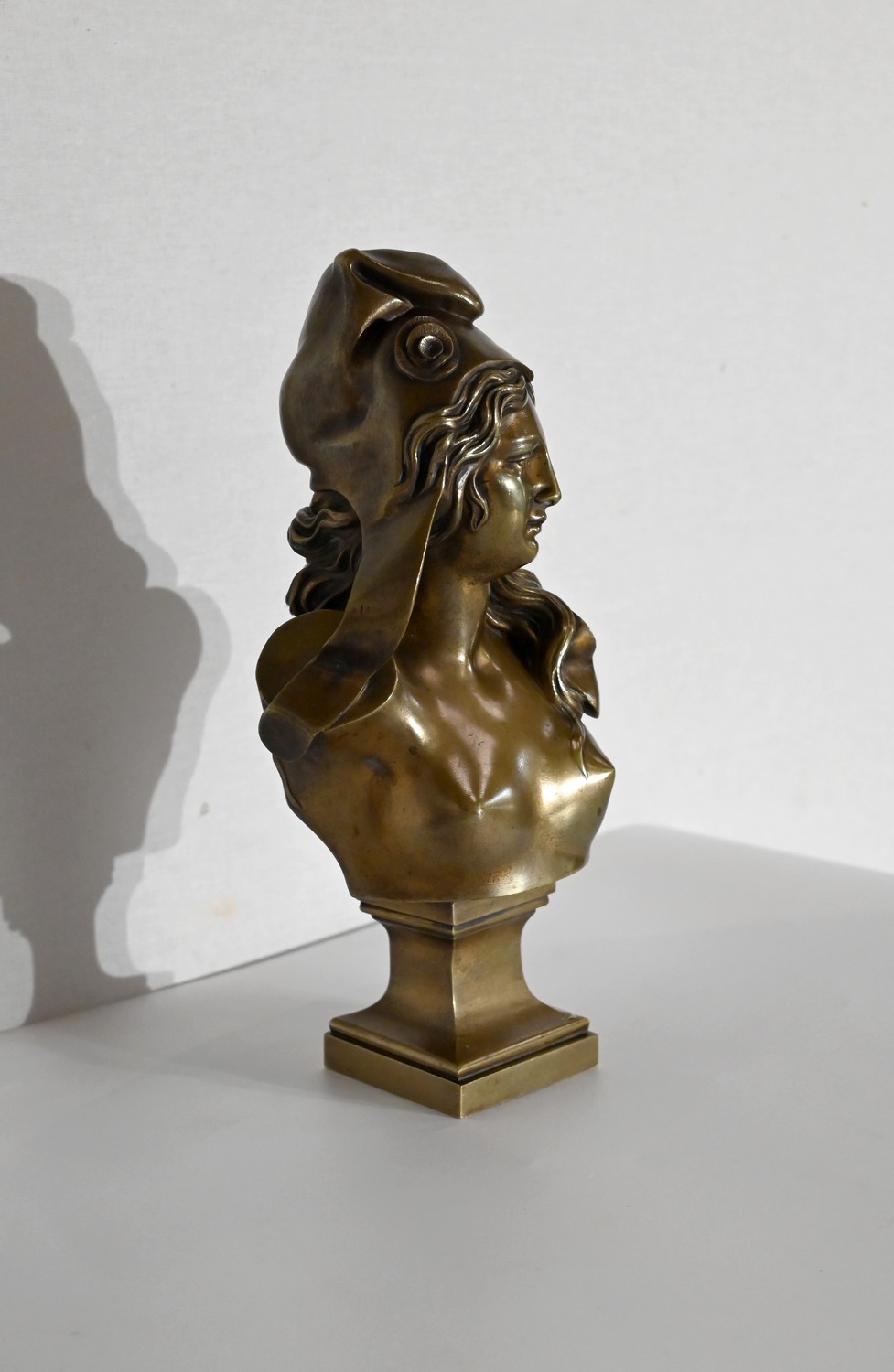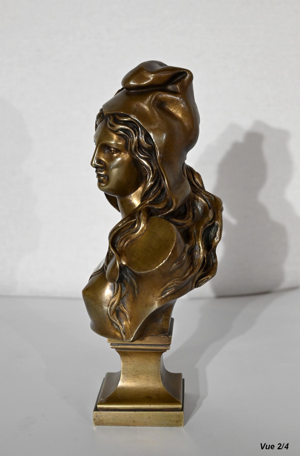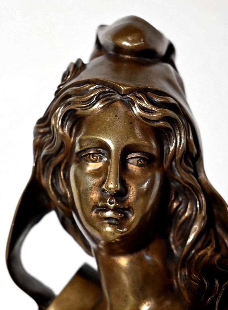 Buste à l’Antique de Marianne, en bronze doré, allégorie de la République Française, reposant sur un piédouche. Cette représentation est parée d’un bonnet phrygien aux longues oreilles, symbole de liberté, accessoire des esclaves affranchis.