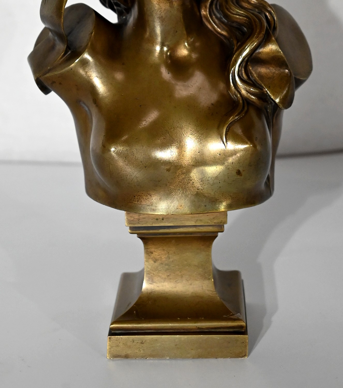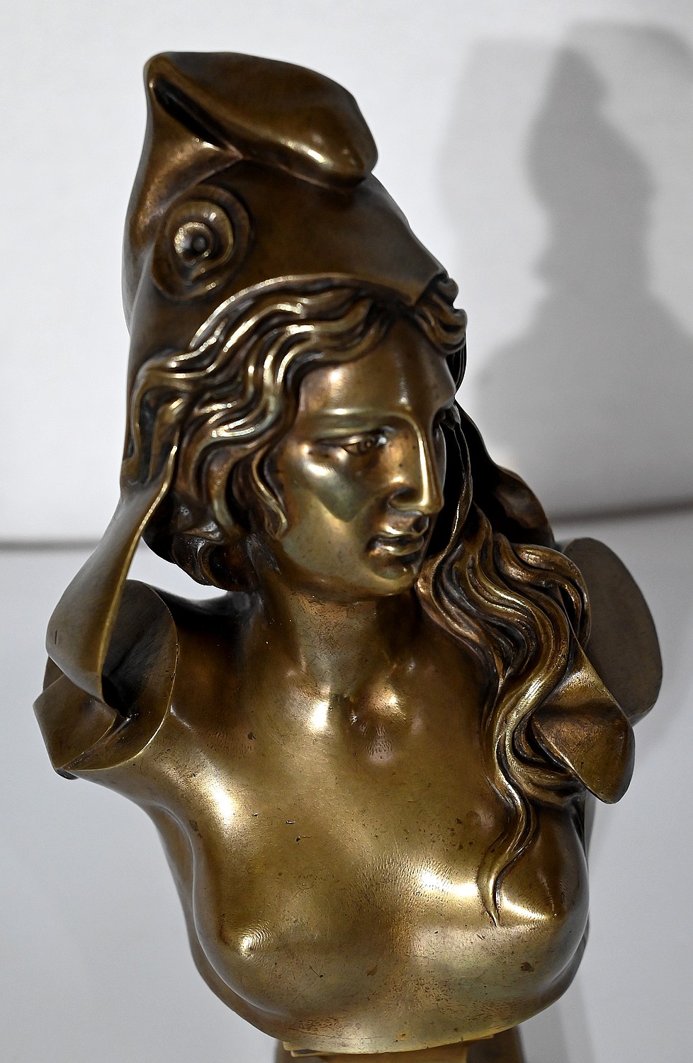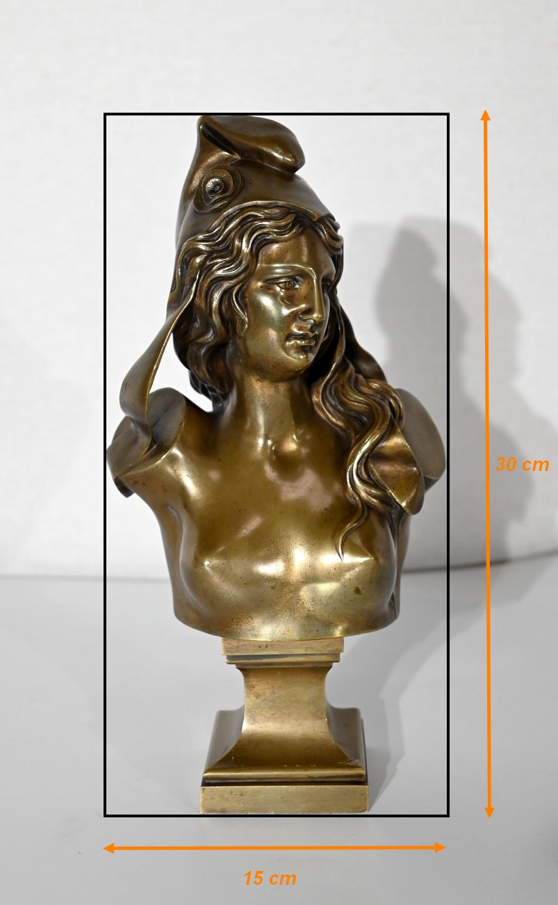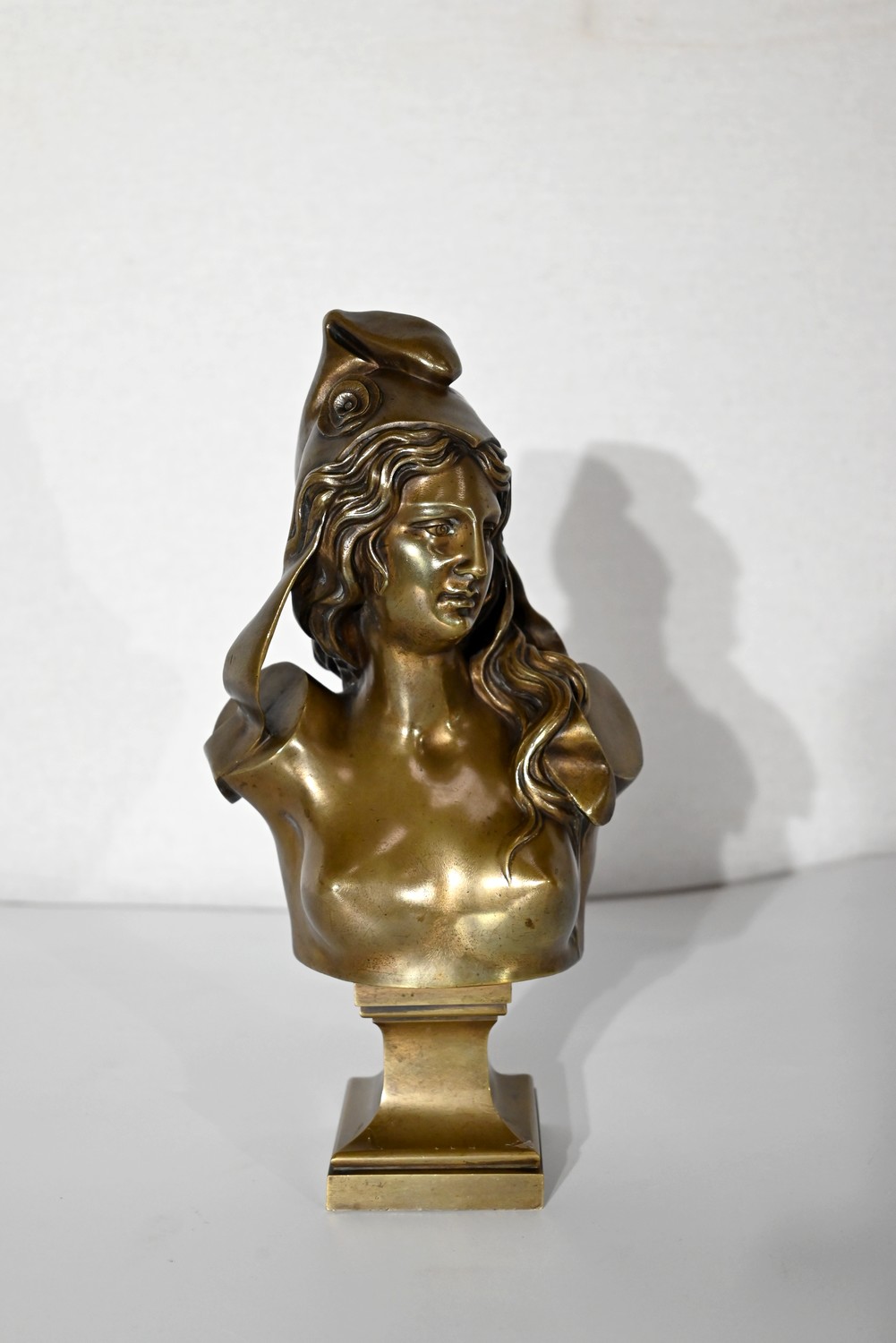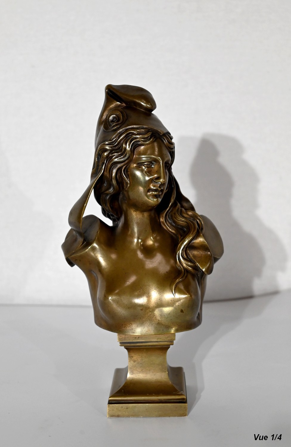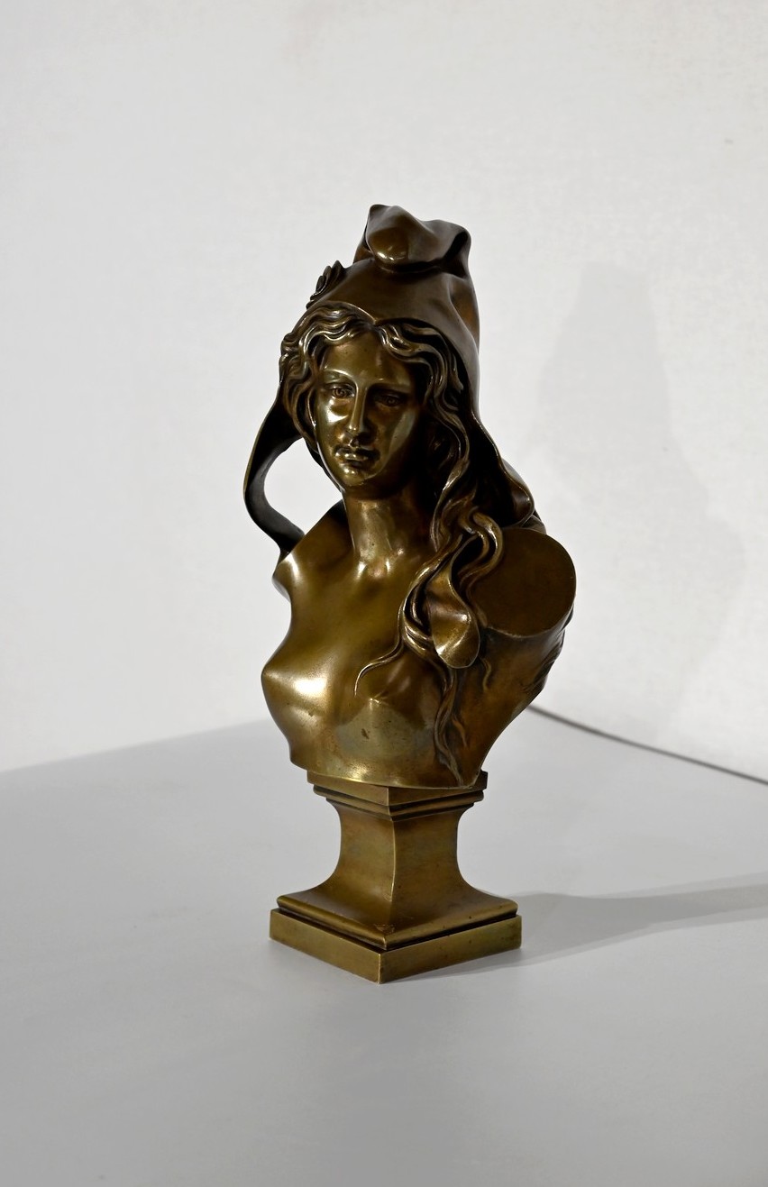 Buste à l’Antique de Marianne, en bronze doré, allégorie de la République Française, reposant sur un piédouche. Cette représentation est parée d’un bonnet phrygien aux longues oreilles, symbole de liberté, accessoire des esclaves affranchis.