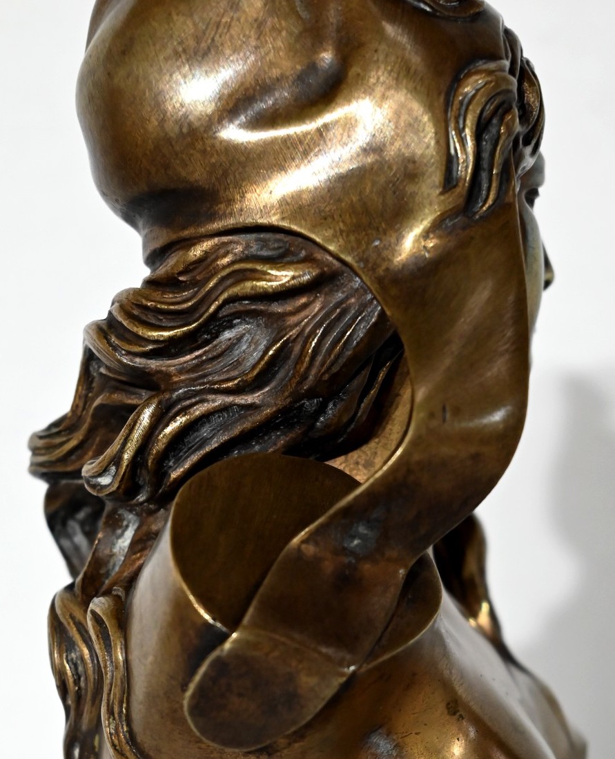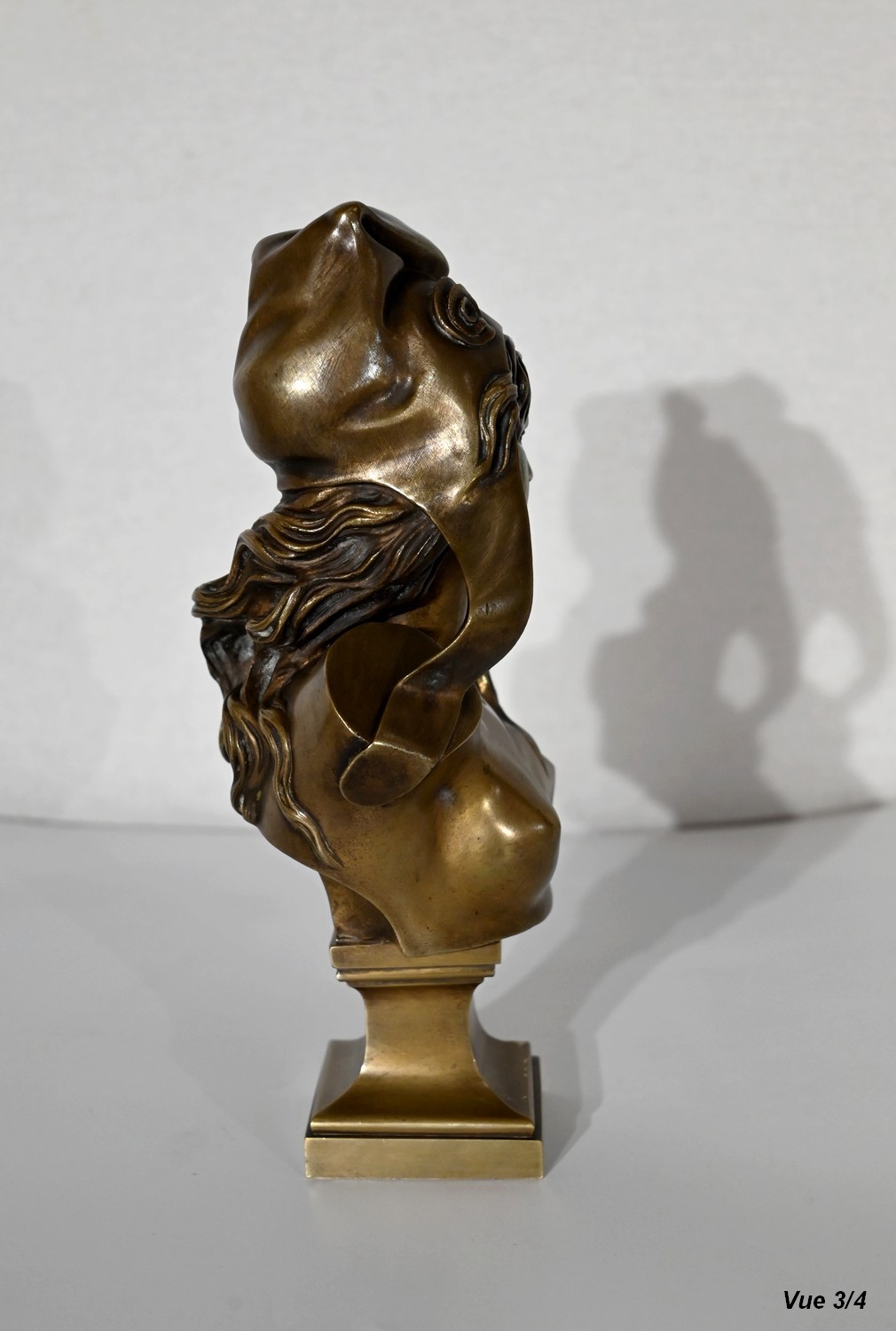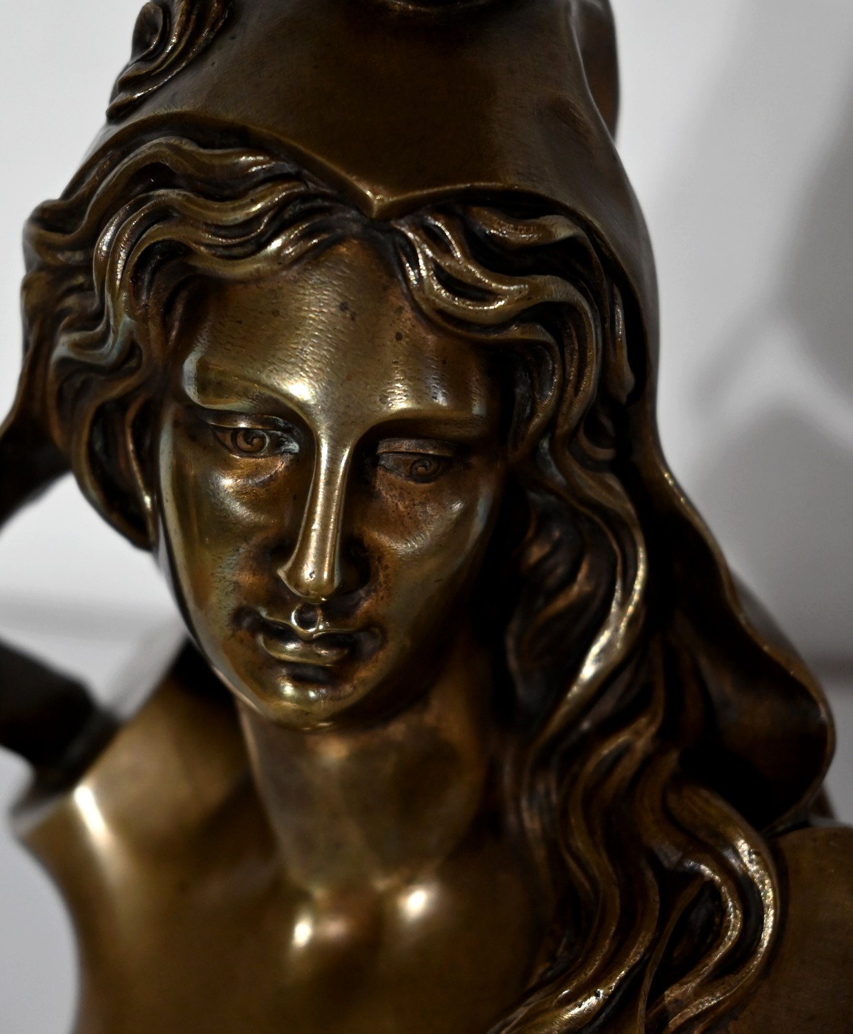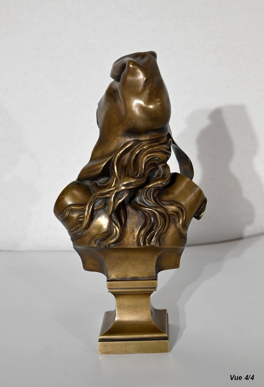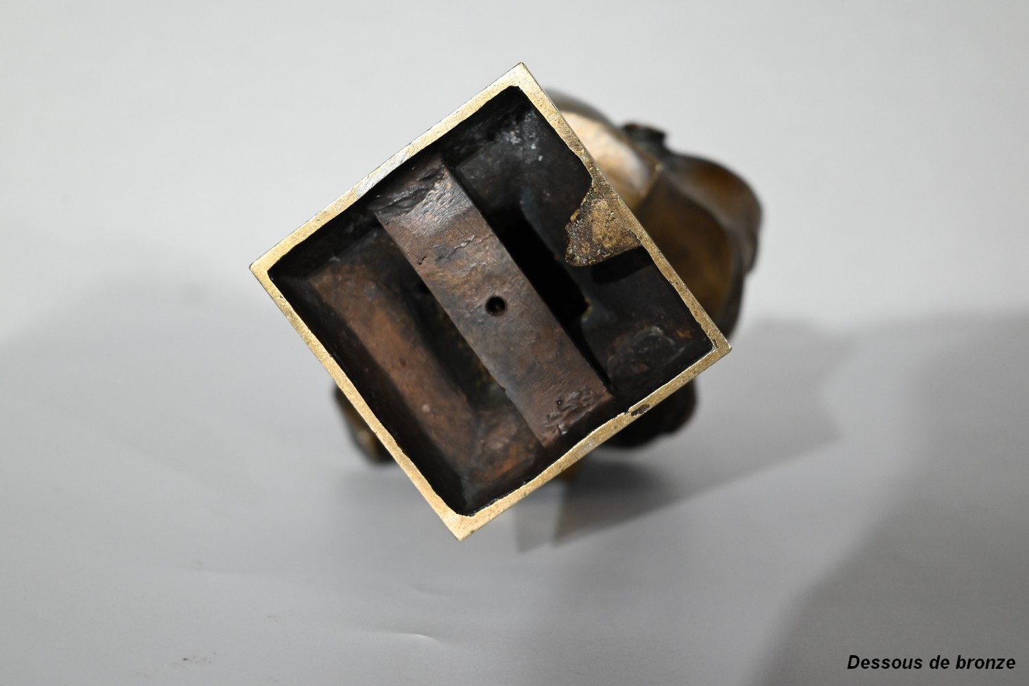 Buste à l’Antique de Marianne, en bronze doré, allégorie de la République Française, reposant sur un piédouche. Cette représentation est parée d’un bonnet phrygien aux longues oreilles, symbole de liberté, accessoire des esclaves affranchis.