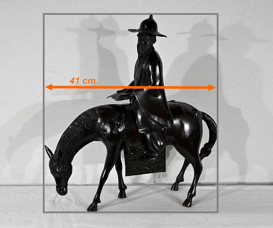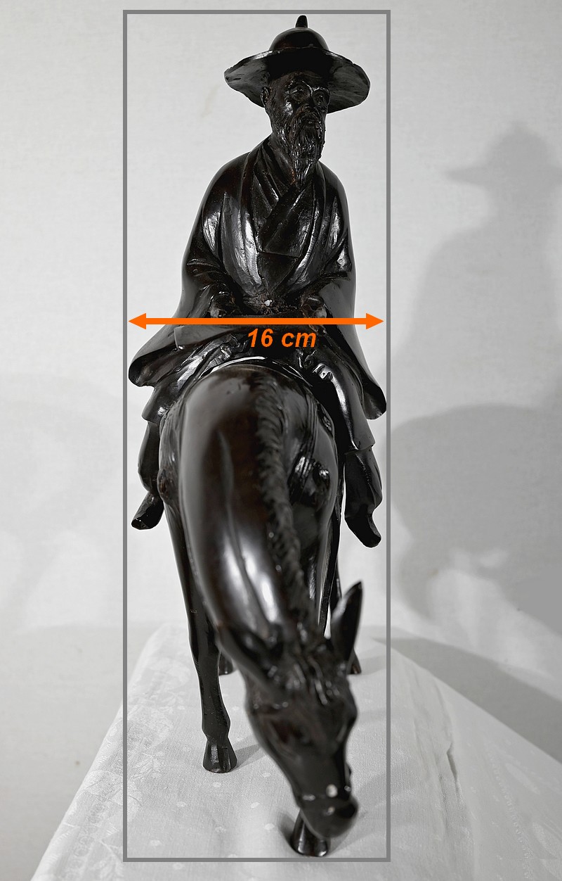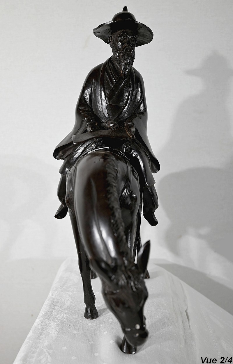 Cette œuvre représente un homme d’âge mûr à la longue barbe, vêtu d’un kimono sous une longue cape et portant un chapeau de paille, en selle sur son cheval.
