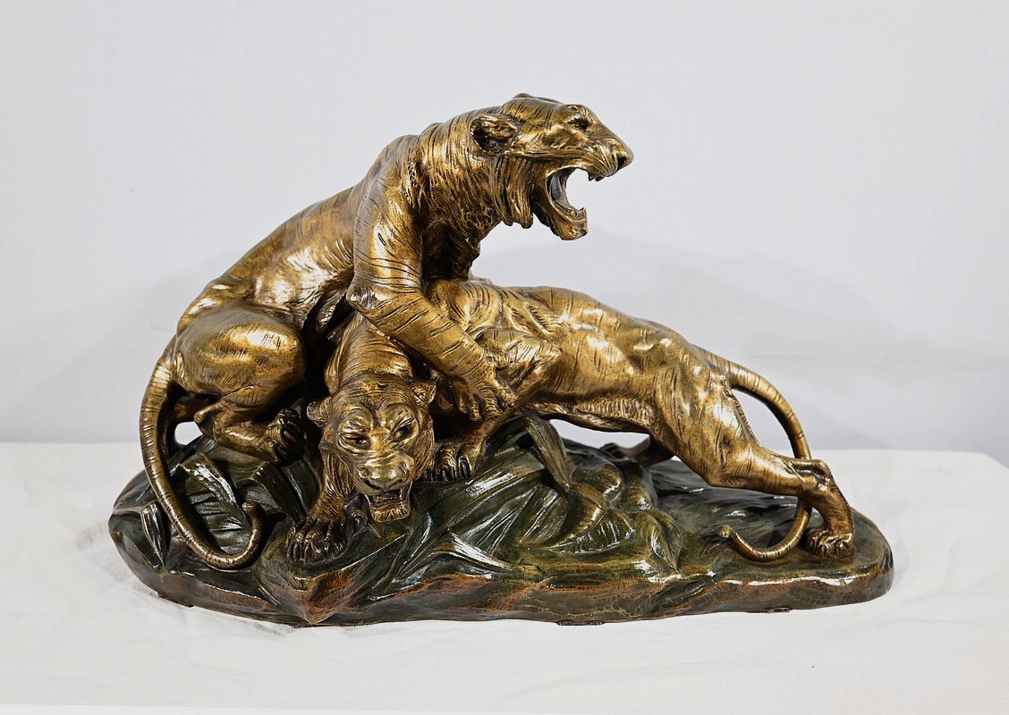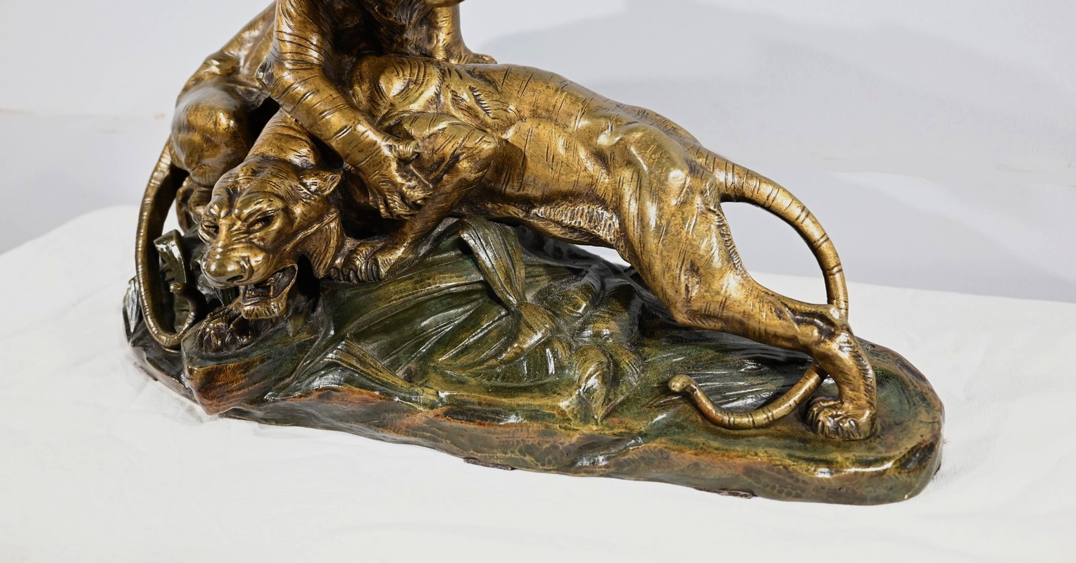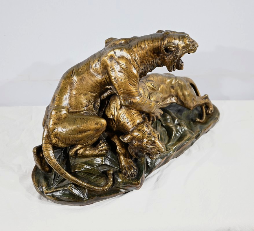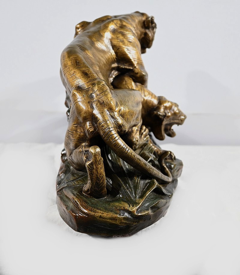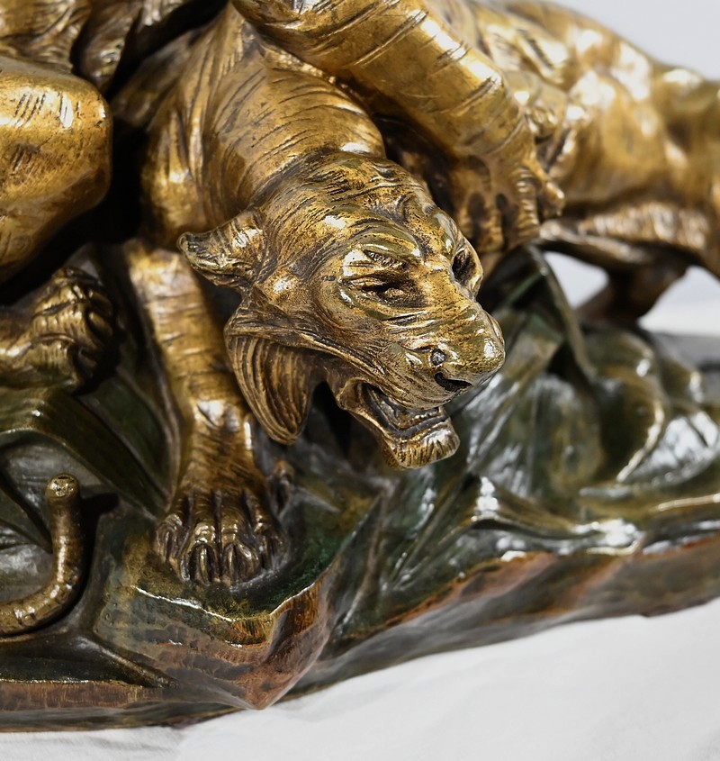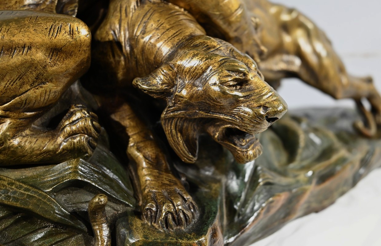« Combat de Tigres» est une œuvre inspirée de la nature sauvage. Deux tigres sur la défensive rugissent durant leur combat. Leurs corps musculeux révèlent la beauté de l’animal et leur posture offensive. Cet important bronze d’Édouard Drouot vous ravira par son charisme et sa belle patine. Il est signé sur la terrasse.