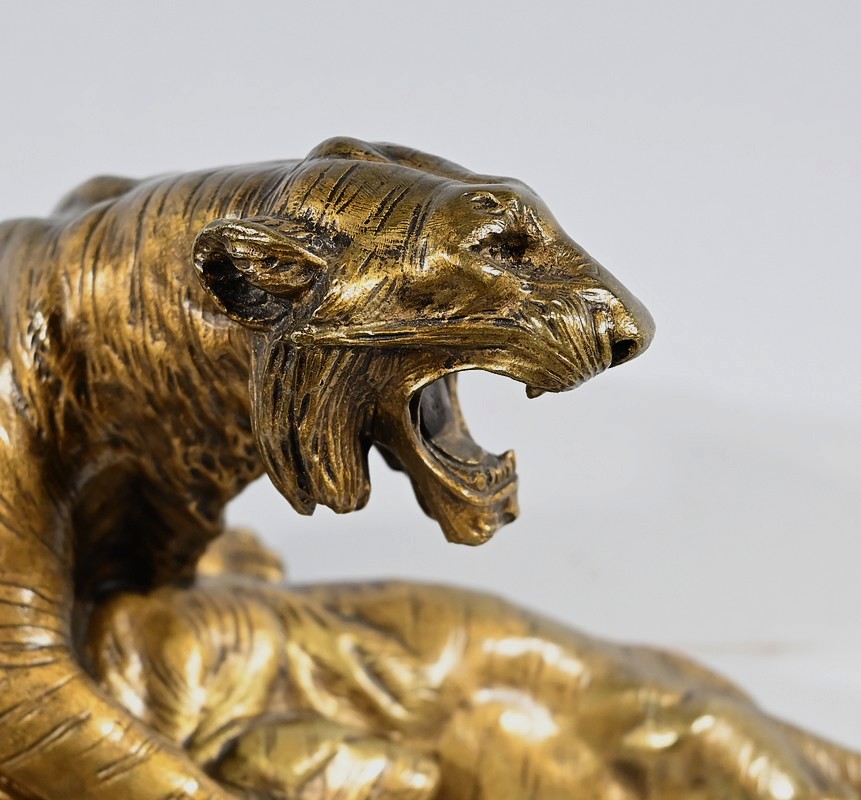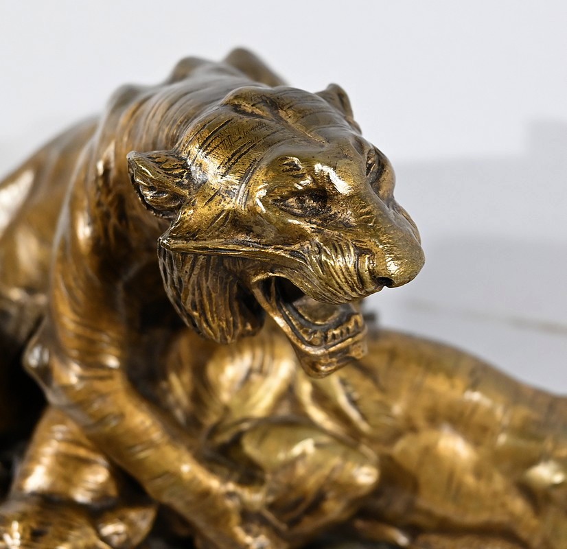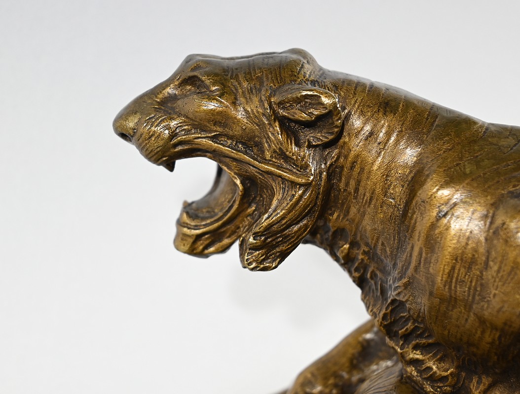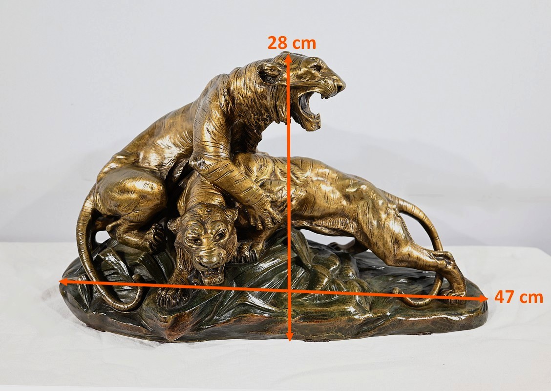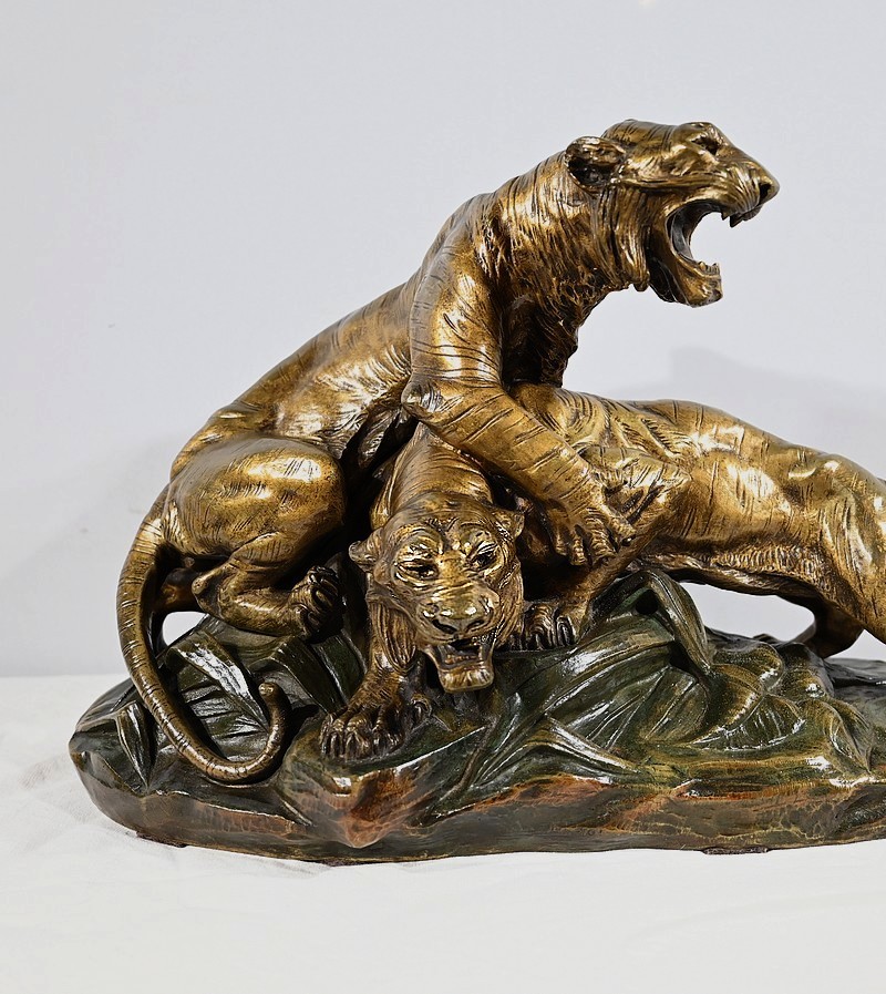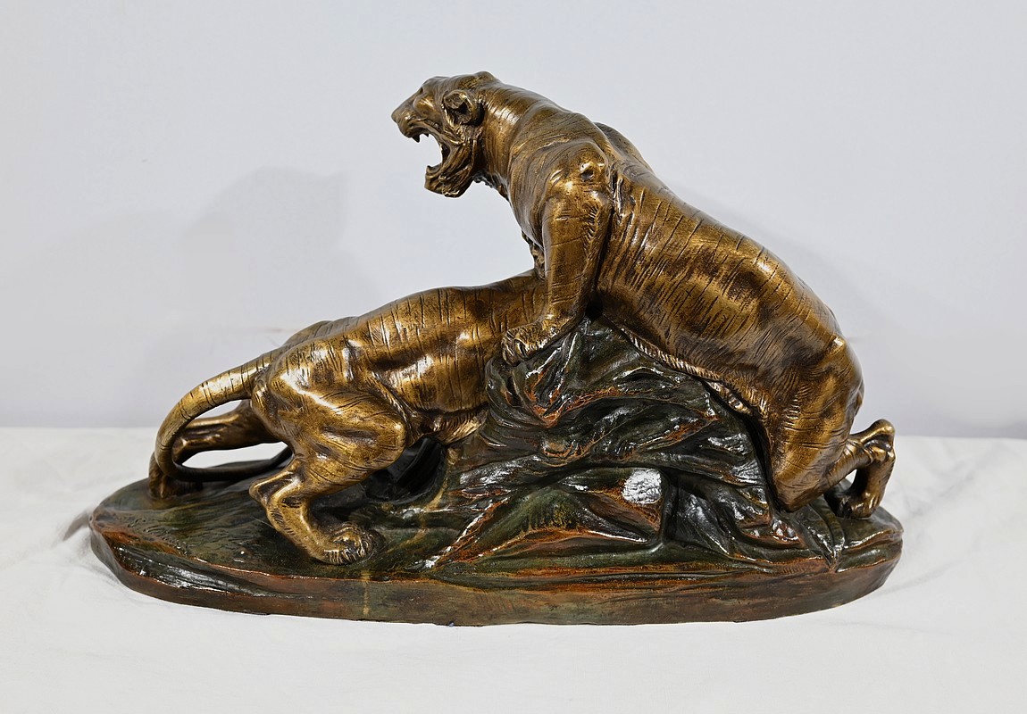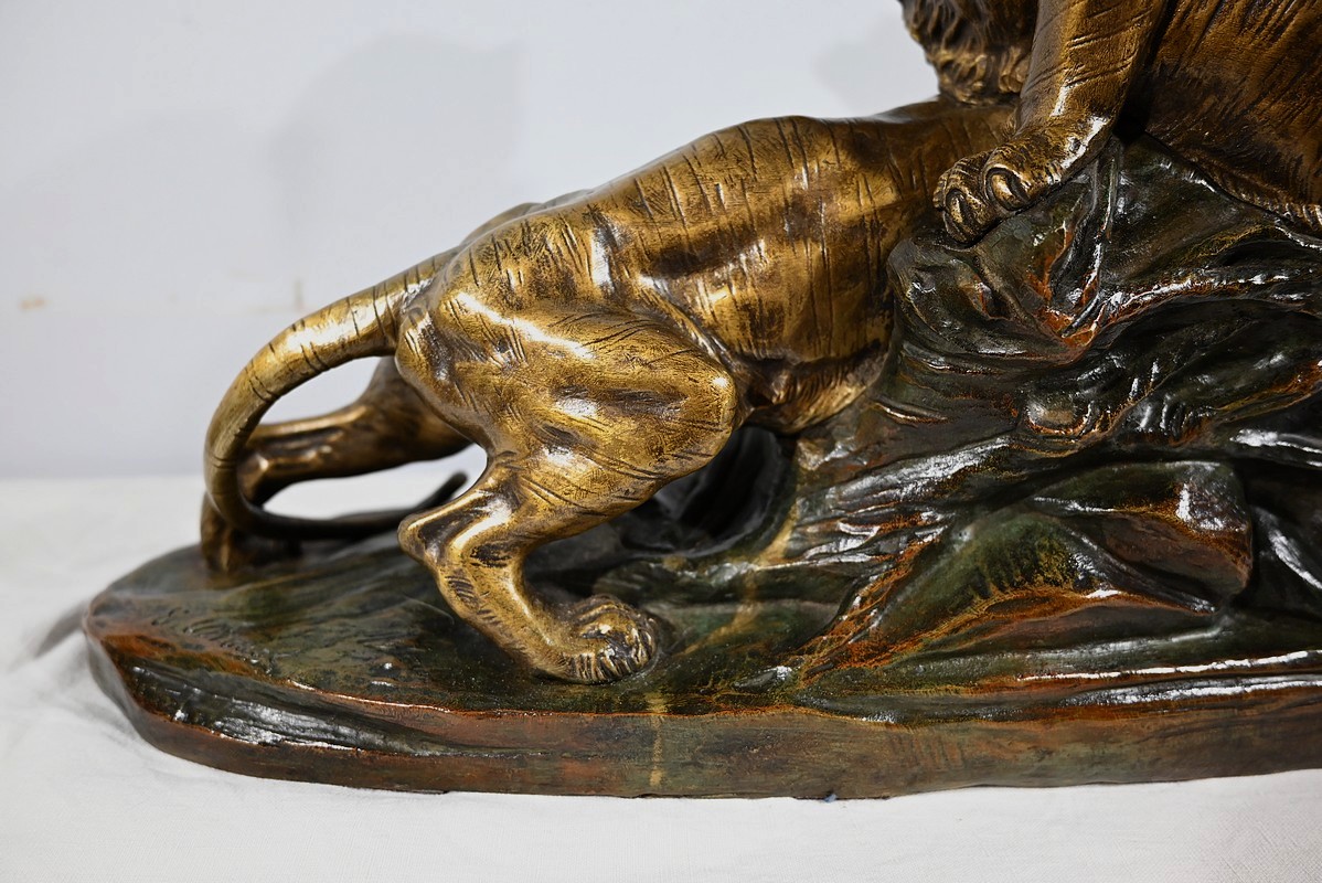 « Combat de Tigres» est une œuvre inspirée de la nature sauvage. Deux tigres sur la défensive rugissent durant leur combat. Leurs corps musculeux révèlent la beauté de l’animal et leur posture offensive. Cet important bronze d’Édouard Drouot vous ravira par son charisme et sa belle patine. Il est signé sur la terrasse.