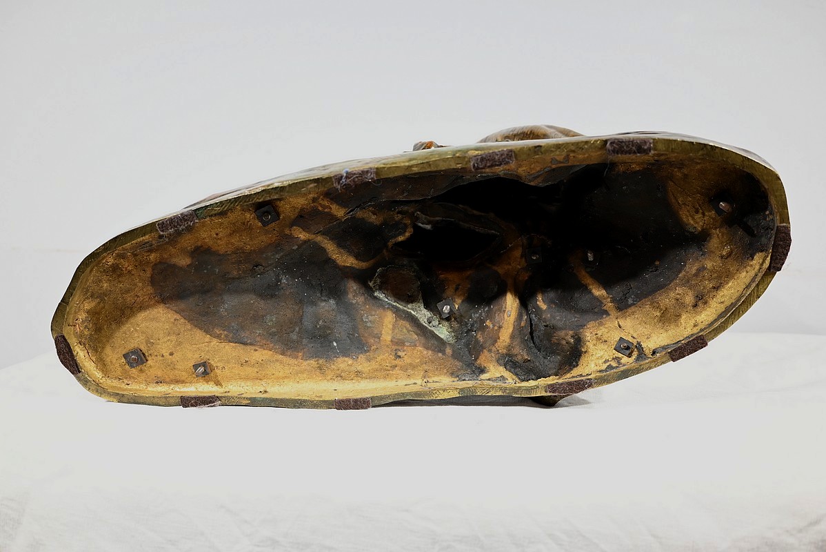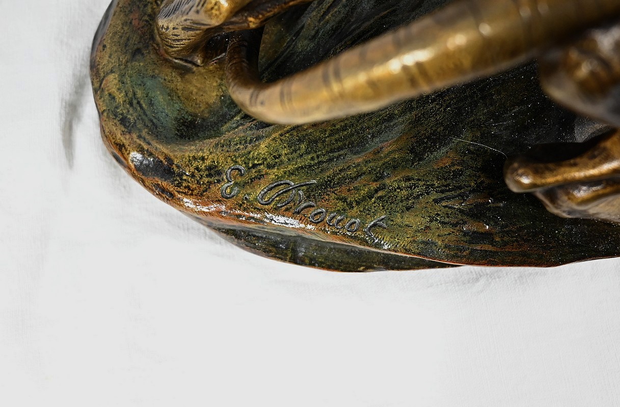 Grand Bronze à patine brune et dorée, signé sur la terrasse Edouard Drouot (1859-1945). Ce sculpteur français est connu pour ses sculptures de scènes mythiques qui se caractérisent par un sens du mouvement et une touche expressive impressionnante.