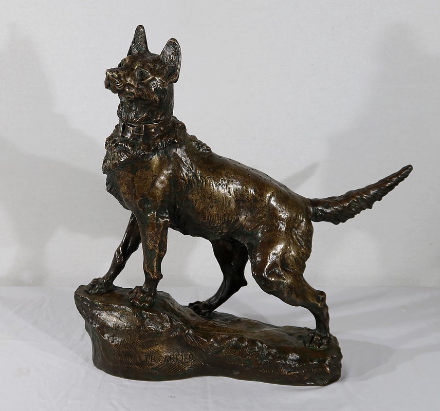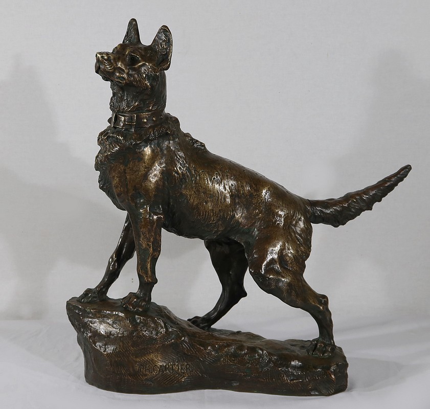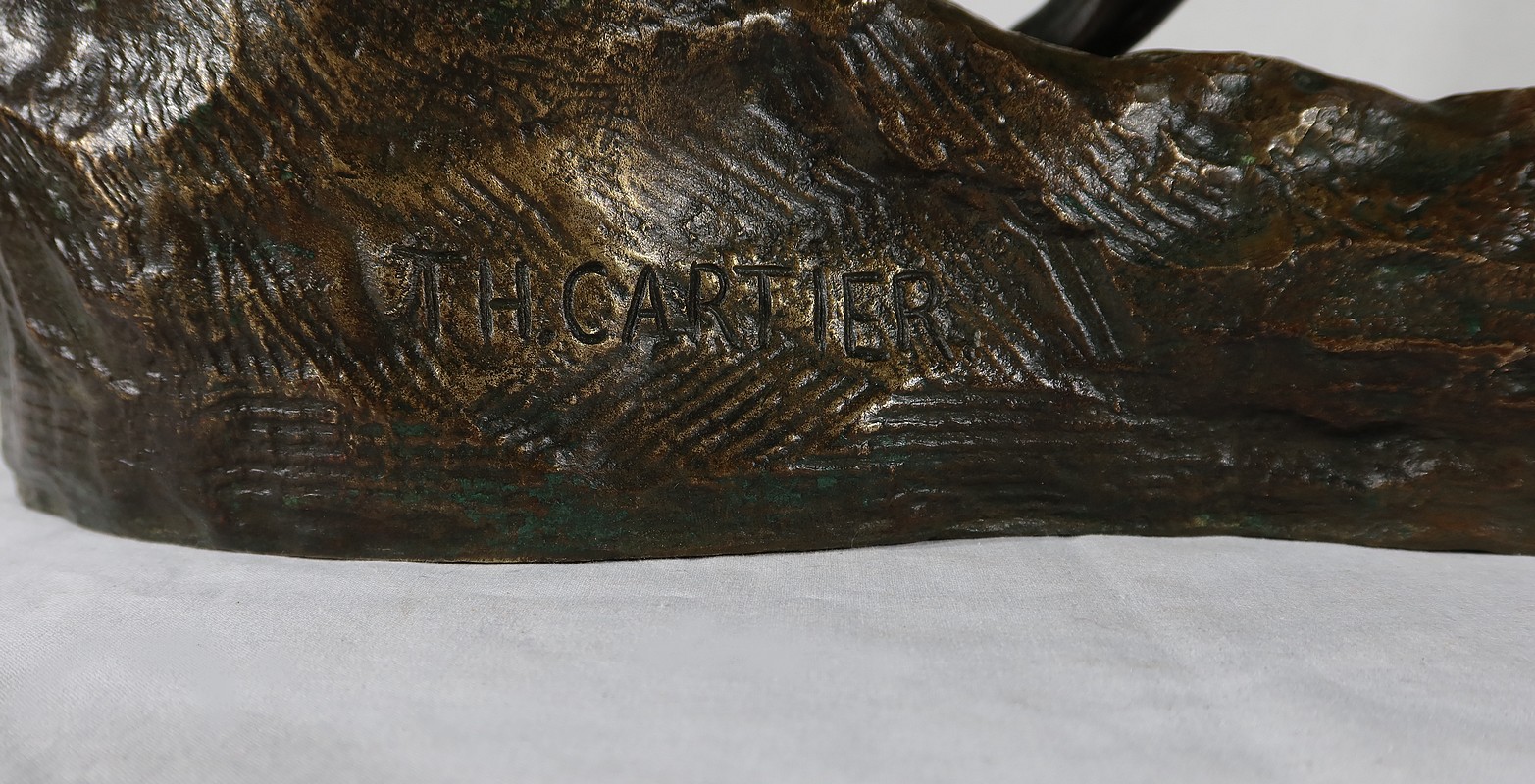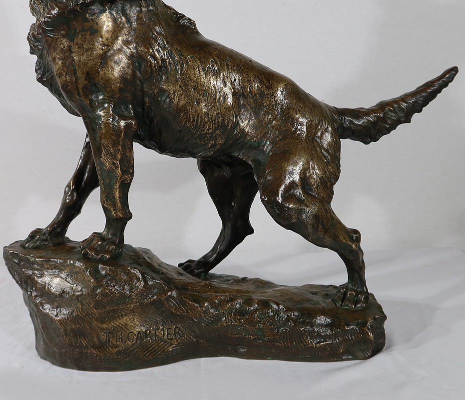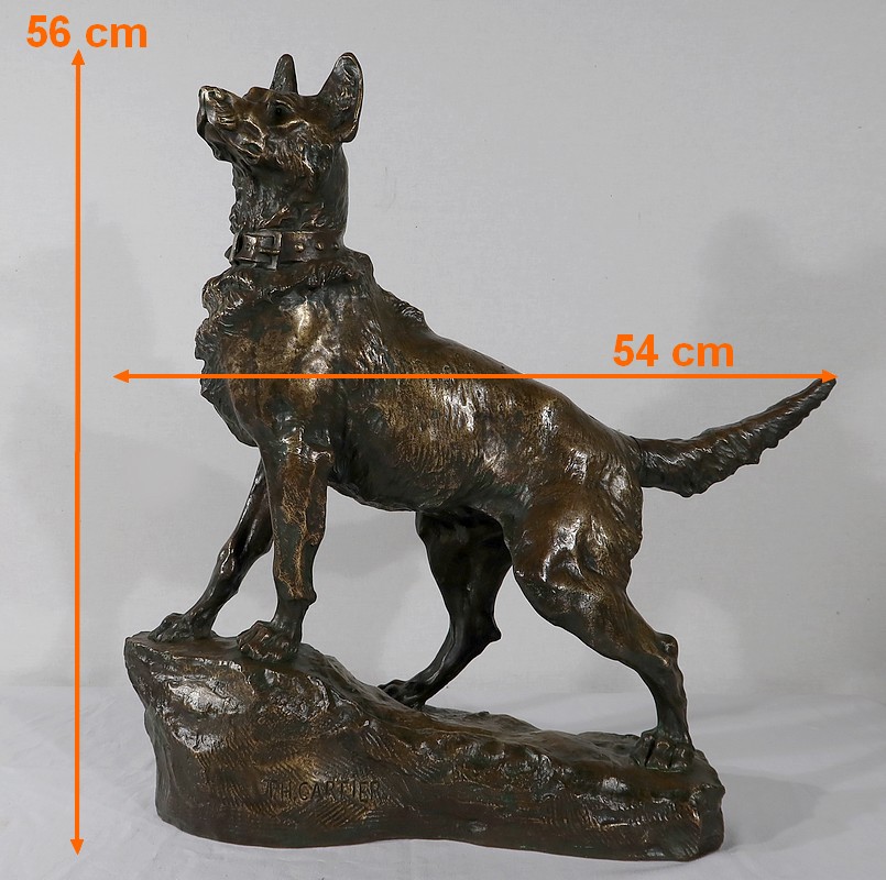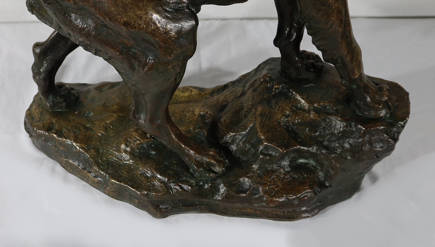 Grande et belle épreuve en bronze à patine mordorée signée Thomas François Cartier (1879 – 1943), sculpteur animalier français connu pour sa passion des chiens qu’il représenta à de nombreuses reprises.