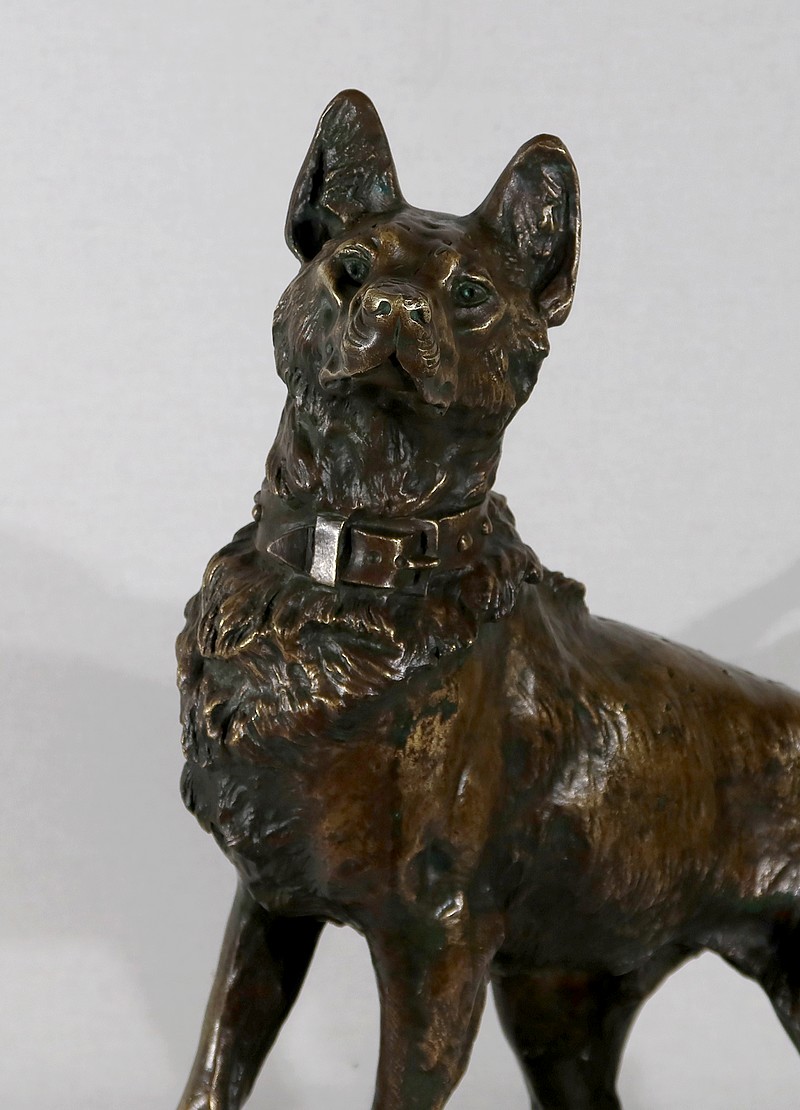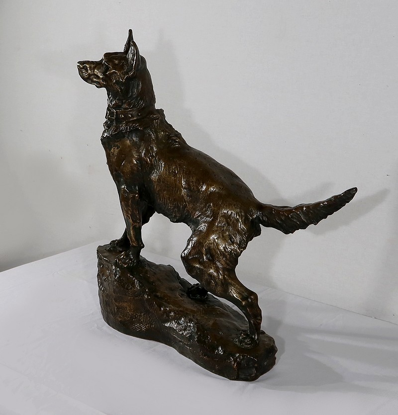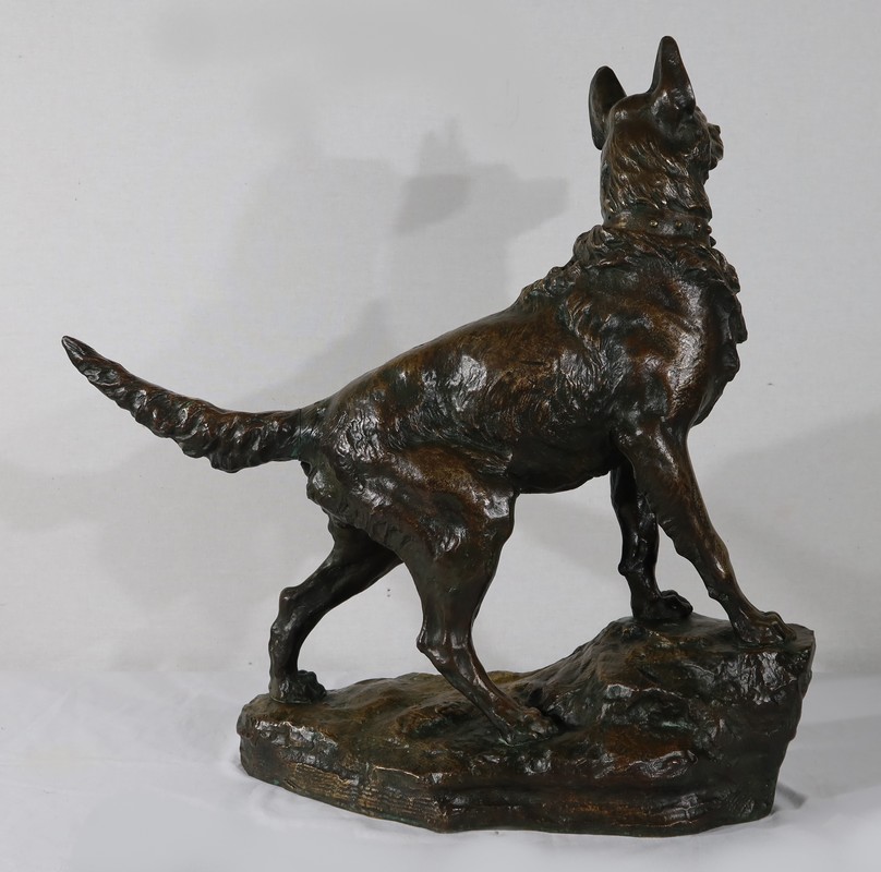 Cette œuvre figure un berger allemand à l’arrêt, grimpé sur un rocher. Oreilles dressées, le chien agile et élégant, porte un large collier que l’on imagine en cuir clouté. Sa posture est élancée et sa fourrure brillante.