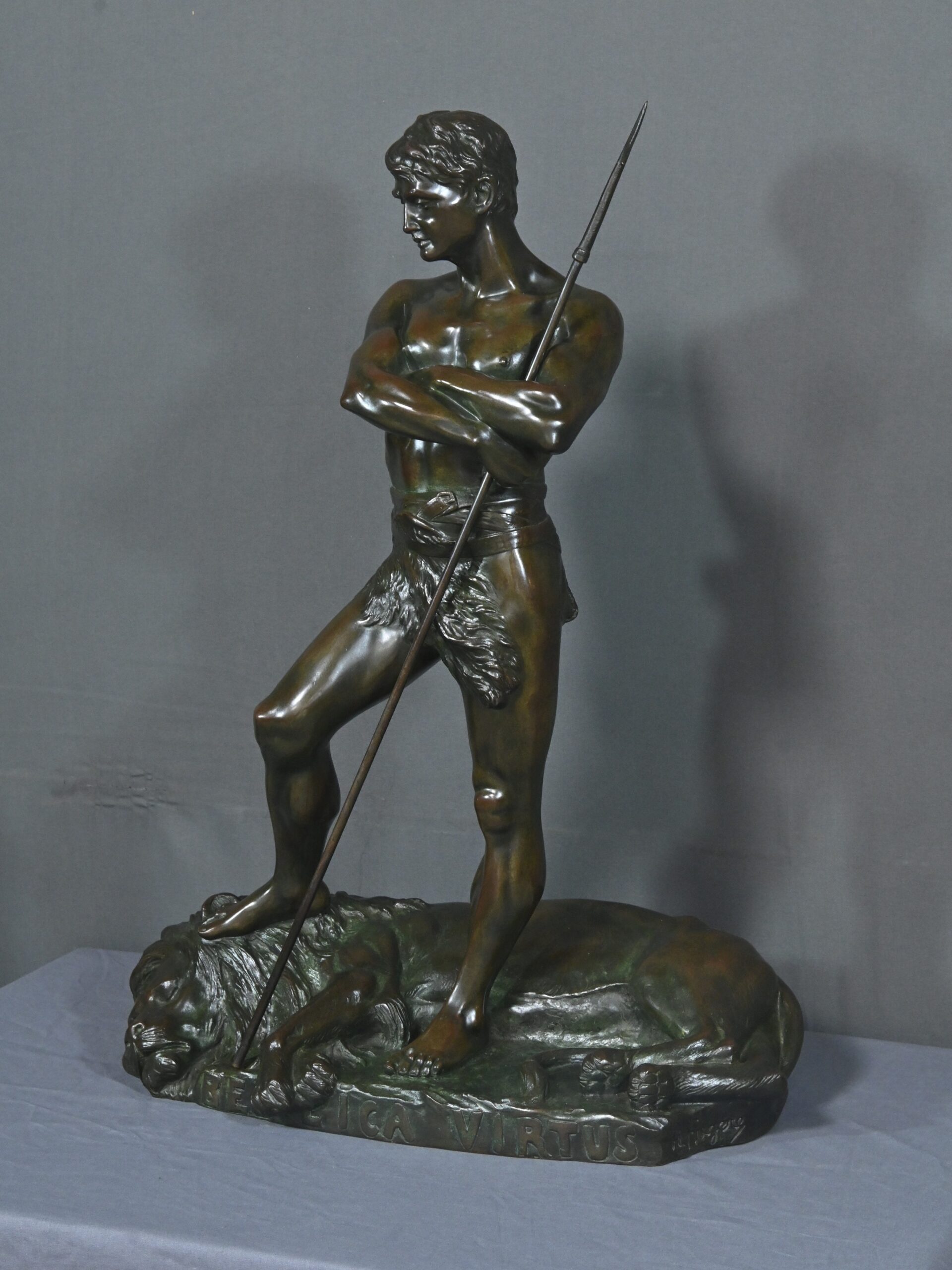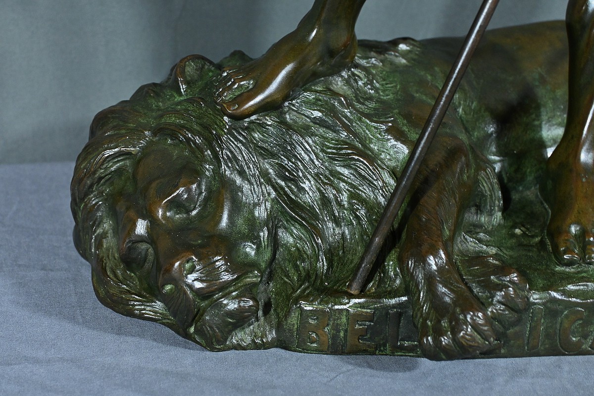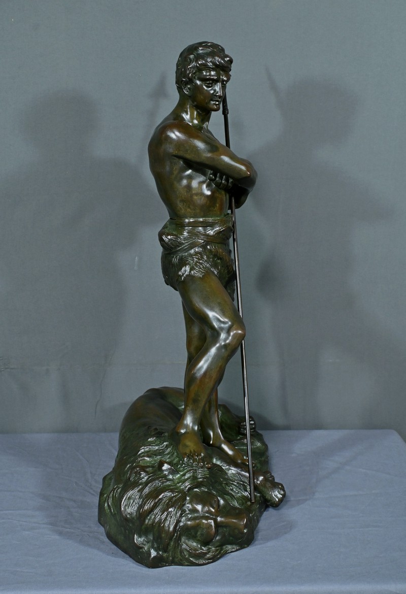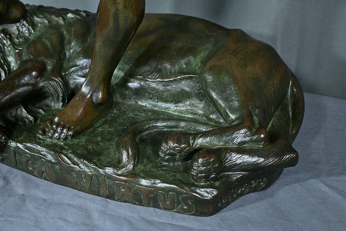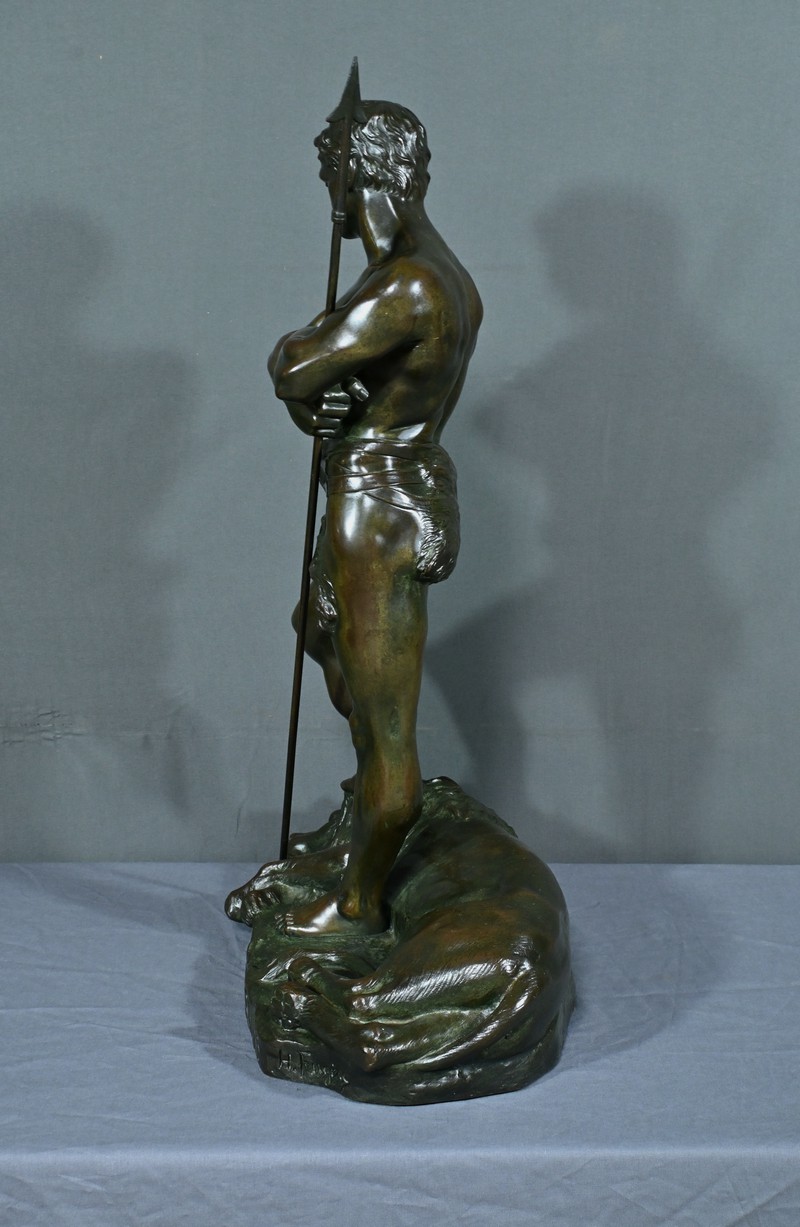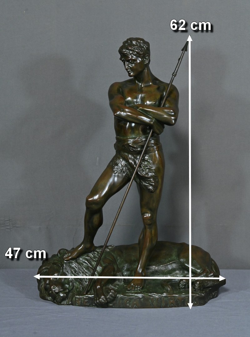 Remarquable Bronze d’Henry Fugère (1872-1944) intitulé « Bellica Virtus » ou « le Chasseur de Lion ». Cette œuvre d’art captivante mesure 62 cm de hauteur et dépeint un chasseur triomphant, debout avec fierté sur un lion abattu. Le chasseur, vêtu d’un pagne, affiche une posture déterminée et tient fermement une lance, témoignant de son courage. La terrasse de la sculpture porte l’inscription « BELLICA VIRTUS » et la signature de l’artiste. Ce bronze à patine brune et verte est un exemple remarquable de la maîtrise technique d’Henry Fugère et de la symbolique puissante du guerrier. Cette pièce exceptionnelle séduira par sa force et son envergure.