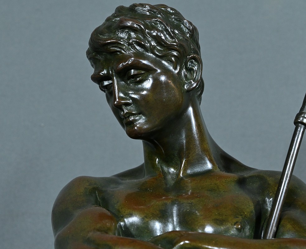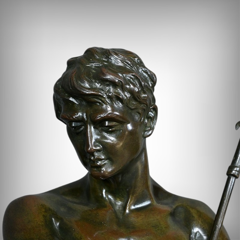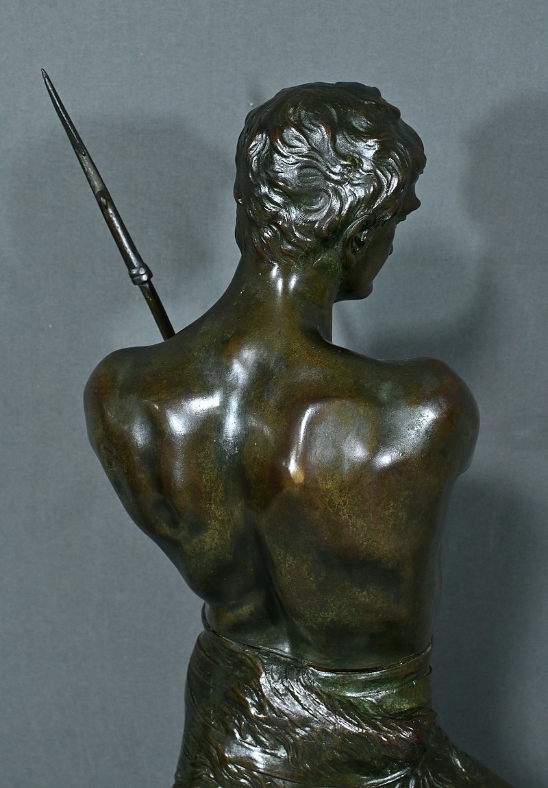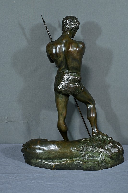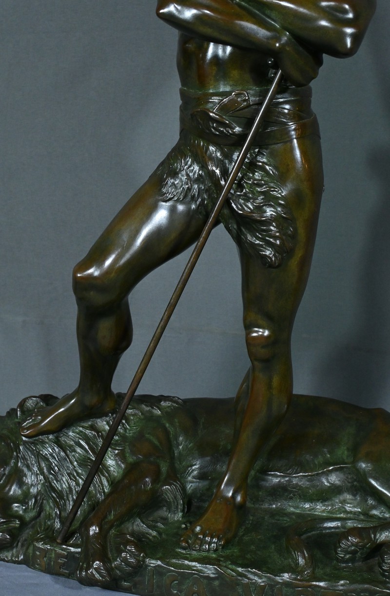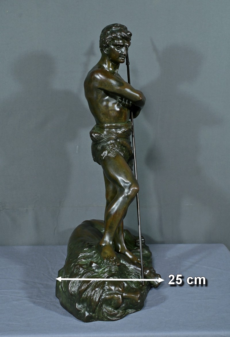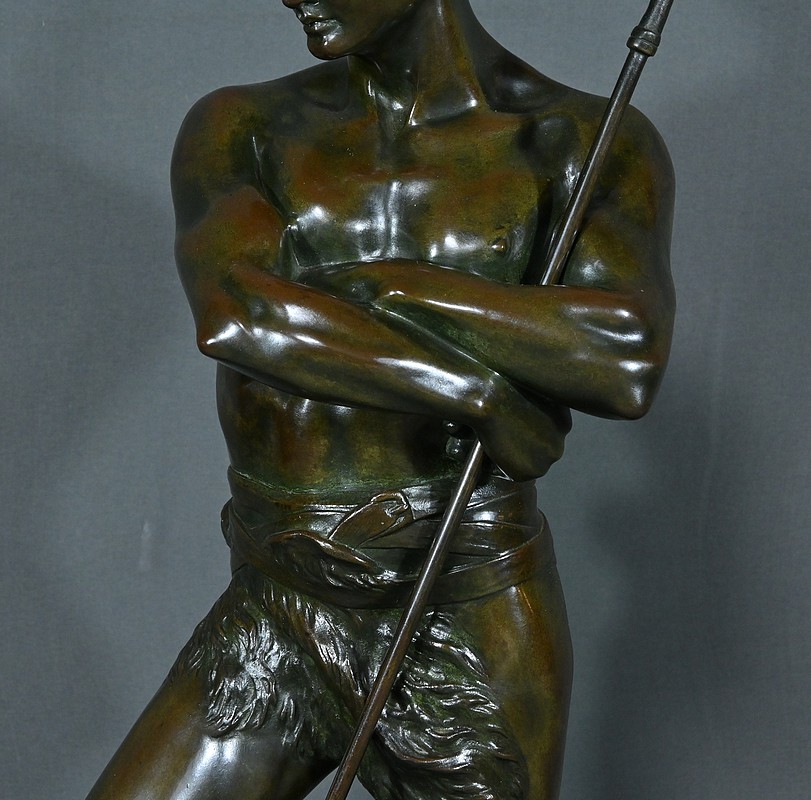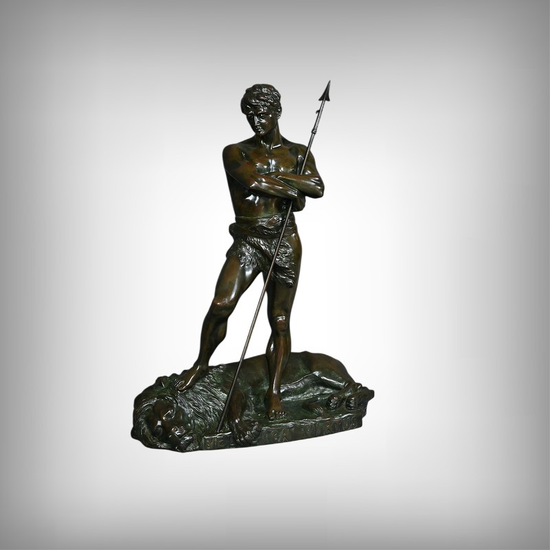 Remarquable Bronze d’Henry Fugère (1872-1944) intitulé « Bellica Virtus » ou « le Chasseur de Lion ». Cette œuvre d’art captivante mesure 62 cm de hauteur et dépeint un chasseur triomphant, debout avec fierté sur un lion abattu. Le chasseur, vêtu d’un pagne, affiche une posture déterminée et tient fermement une lance, témoignant de son courage. La terrasse de la sculpture porte l’inscription « BELLICA VIRTUS » et la signature de l’artiste. Ce bronze à patine brune et verte est un exemple remarquable de la maîtrise technique d’Henry Fugère et de la symbolique puissante du guerrier. Cette pièce exceptionnelle séduira par sa force et son envergure.