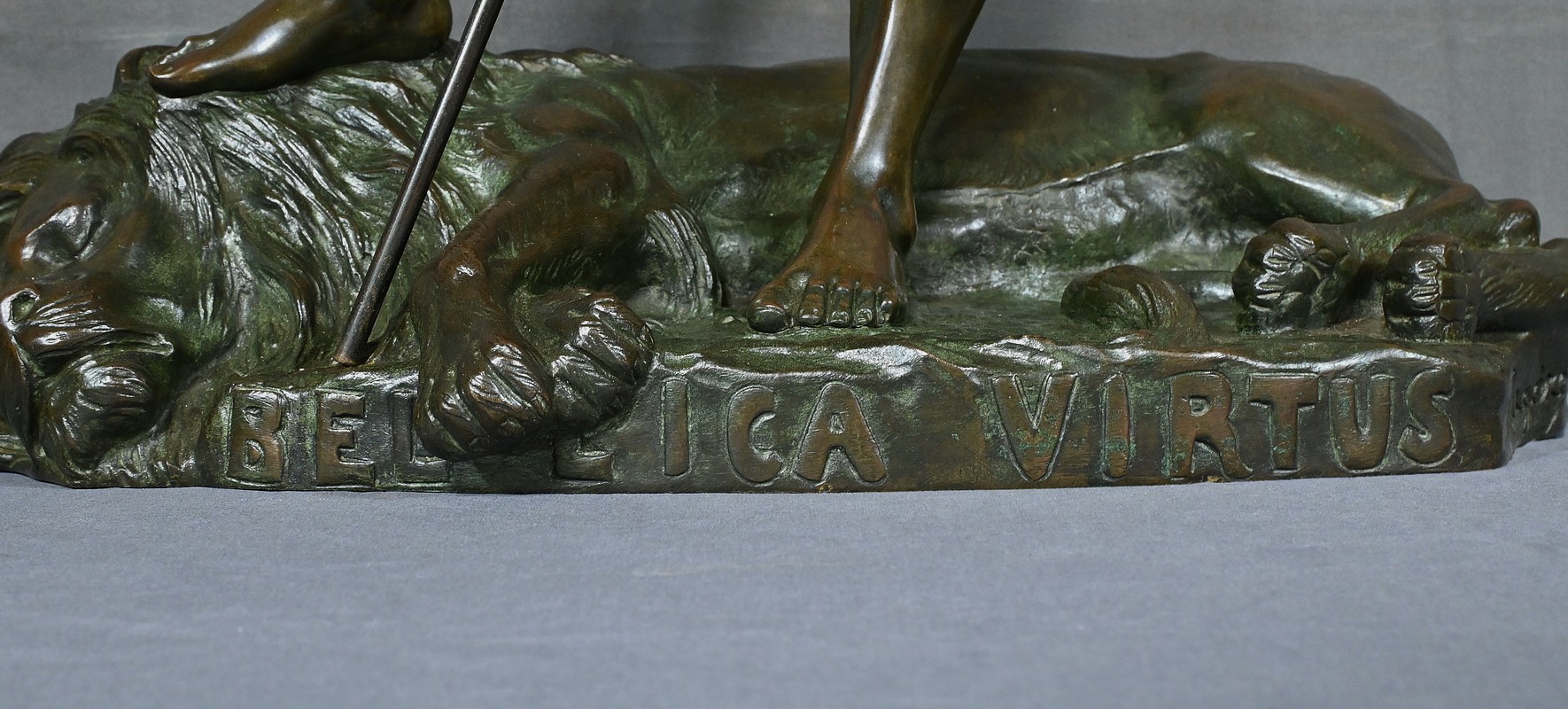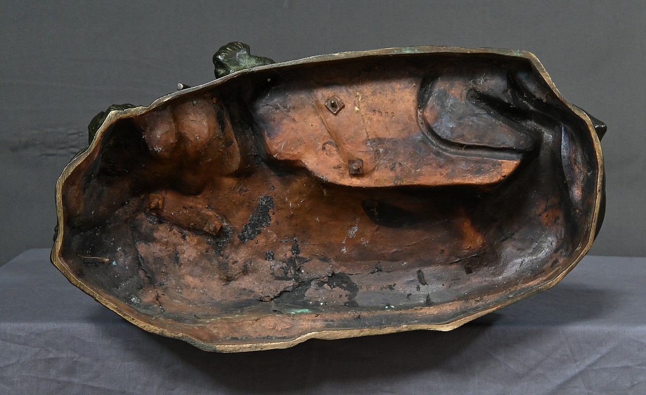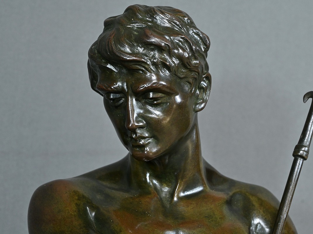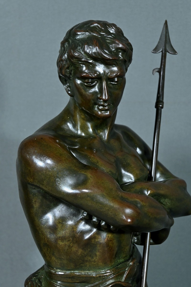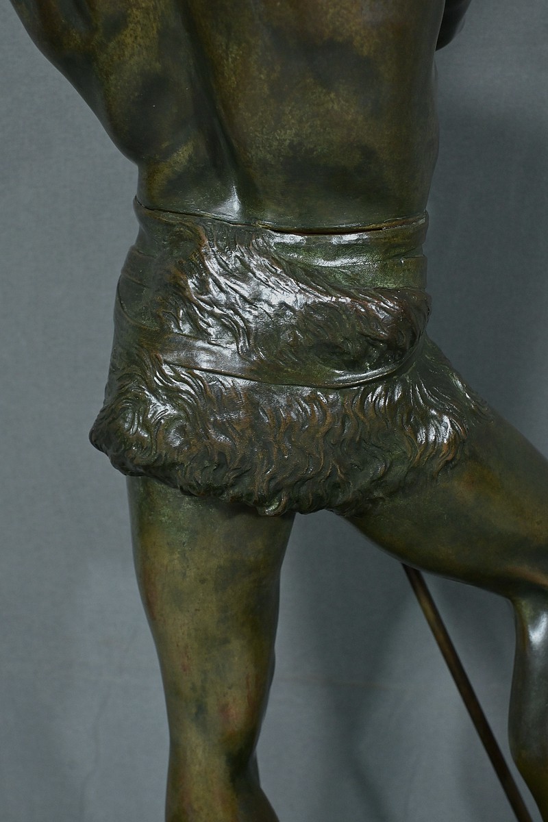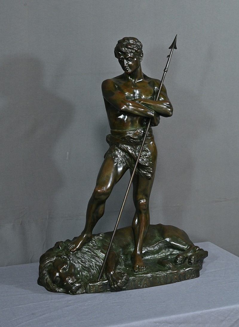 Remarquable Bronze d’Henry Fugère (1872-1944) intitulé « Bellica Virtus » ou « le Chasseur de Lion ». Cette œuvre d’art captivante mesure 62 cm de hauteur et dépeint un chasseur triomphant, debout avec fierté sur un lion abattu. Le chasseur, vêtu d’un pagne, affiche une posture déterminée et tient fermement une lance, témoignant de son courage. La terrasse de la sculpture porte l’inscription « BELLICA VIRTUS » et la signature de l’artiste. Ce bronze à patine brune et verte est un exemple remarquable de la maîtrise technique d’Henry Fugère et de la symbolique puissante du guerrier. Cette pièce exceptionnelle séduira par sa force et son envergure.