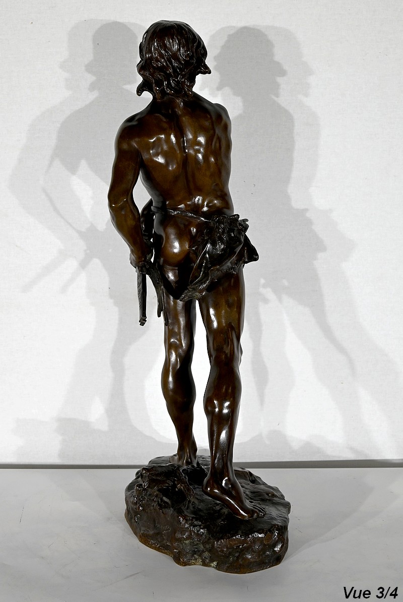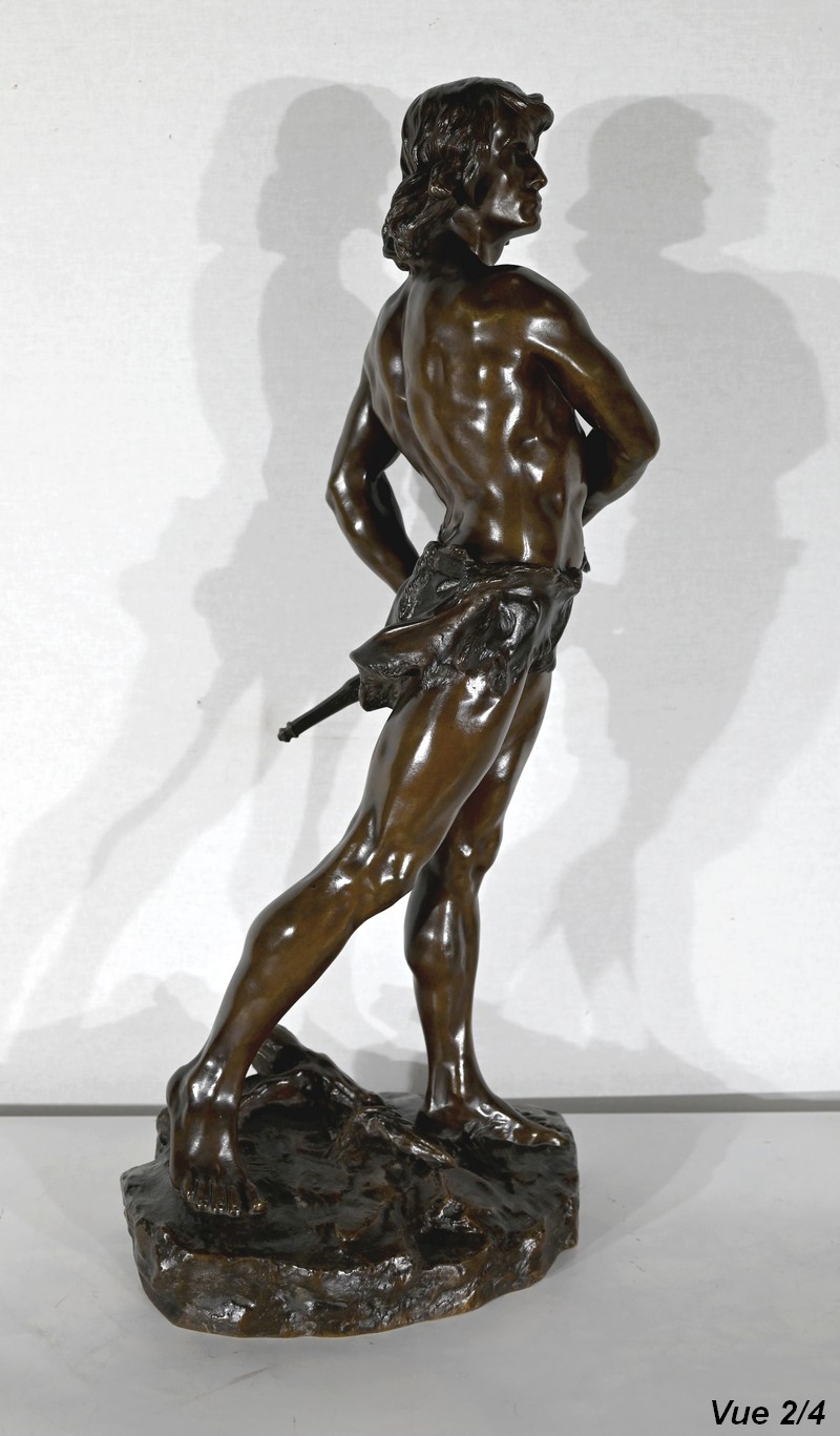 L’homme est légèrement vêtu, le torse musclé, une peau d’animal recouvre son entrejambe et une partie de son fessier.