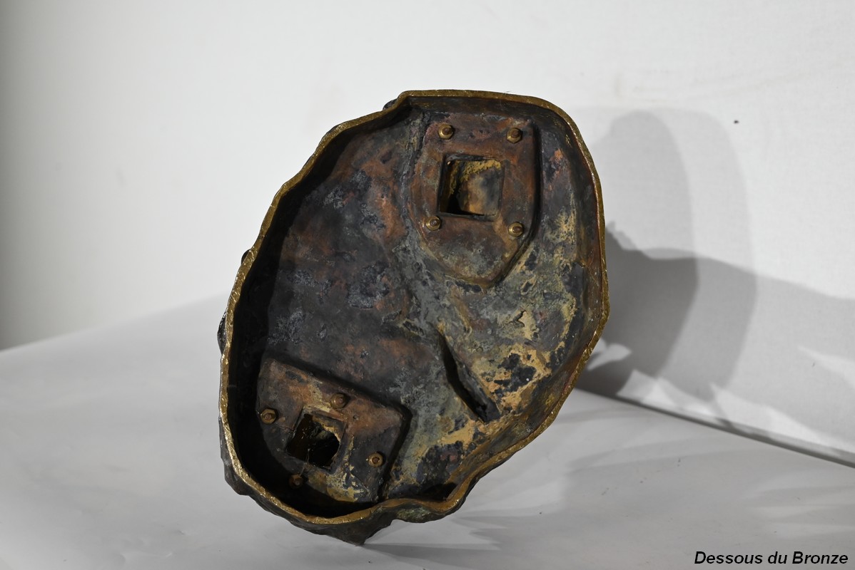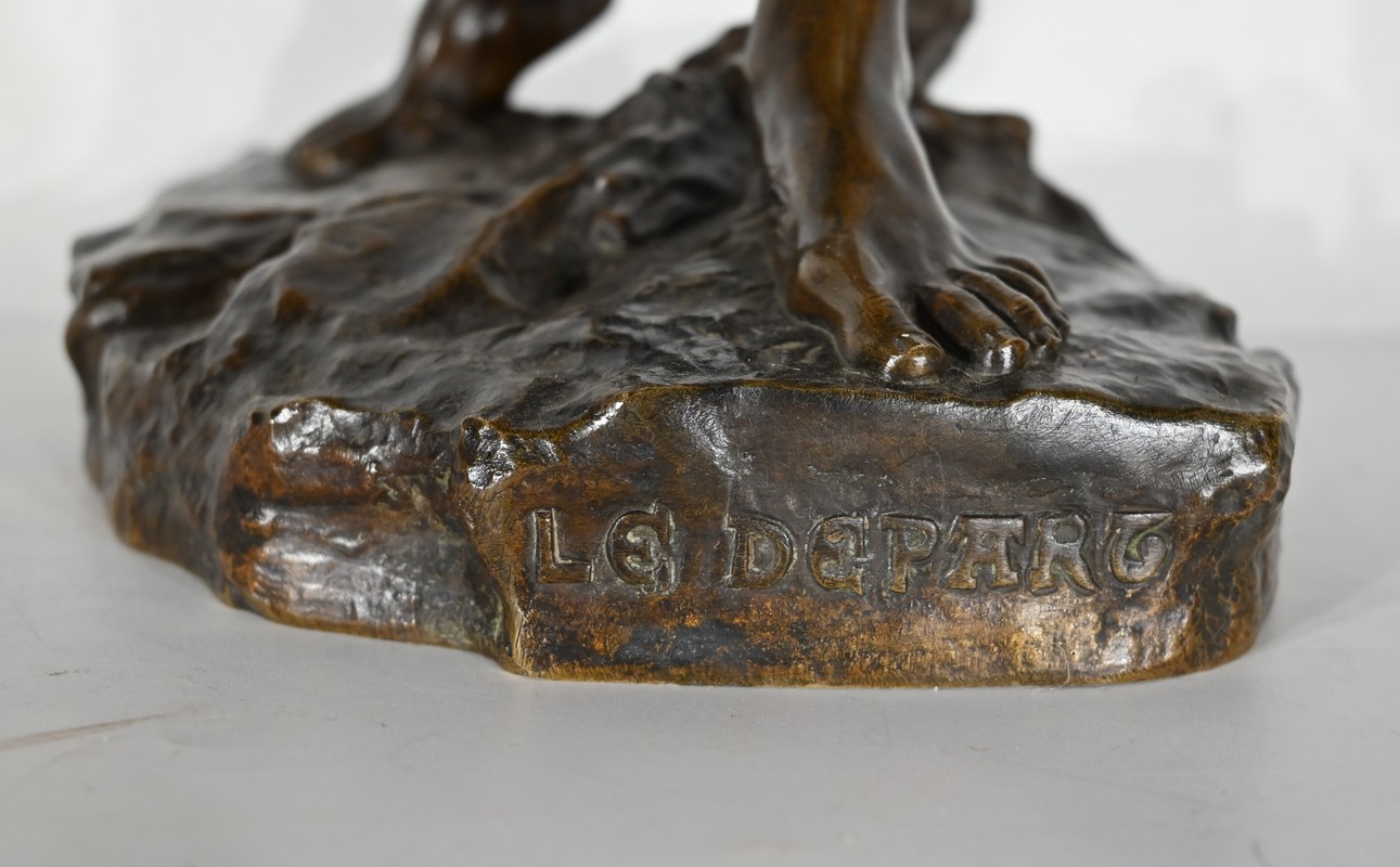 Important bronze à patine verte, titré « Le Départ » et signé sur la terrasse.