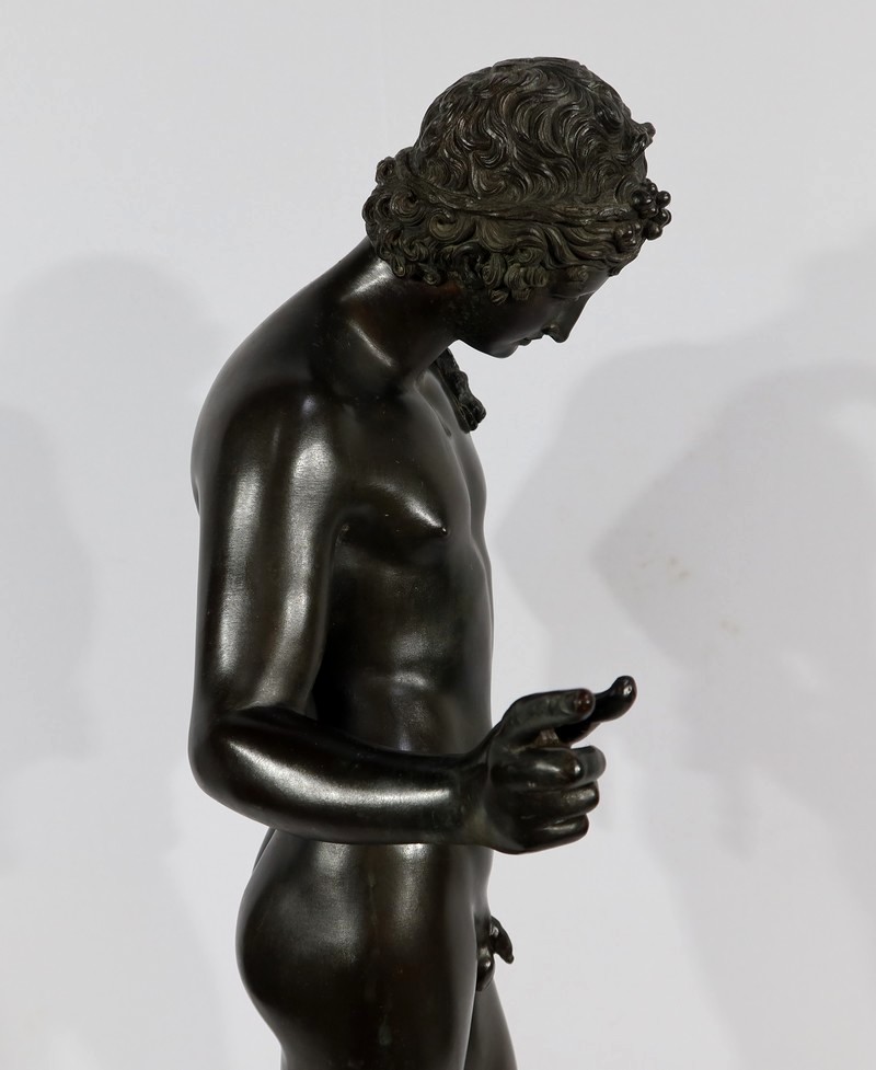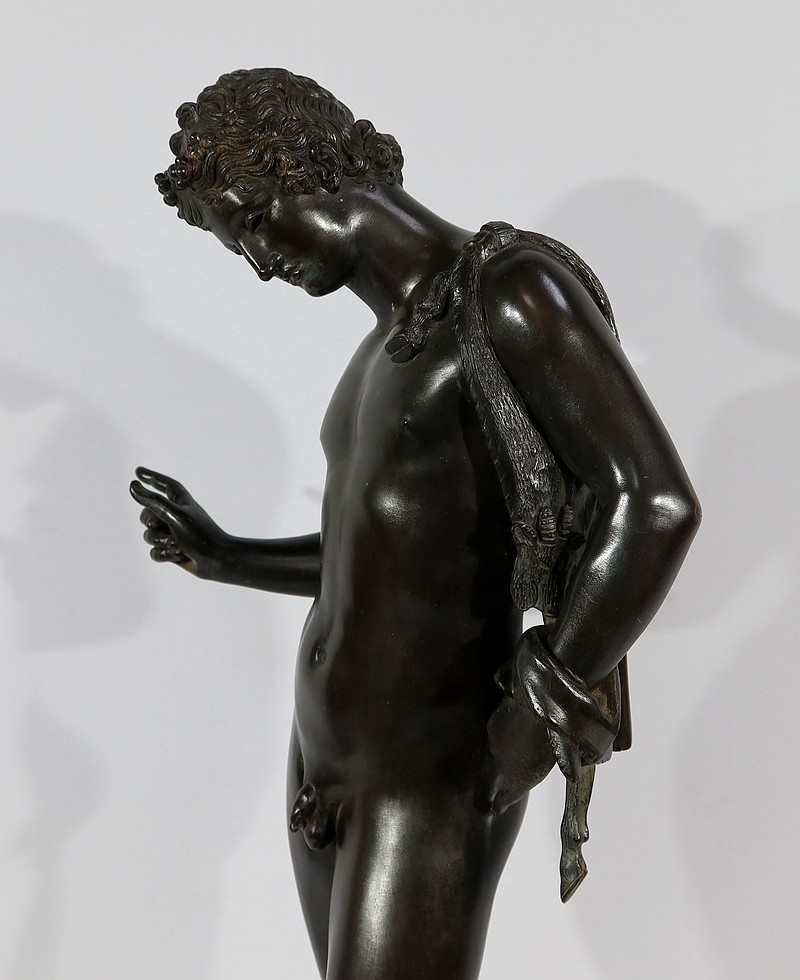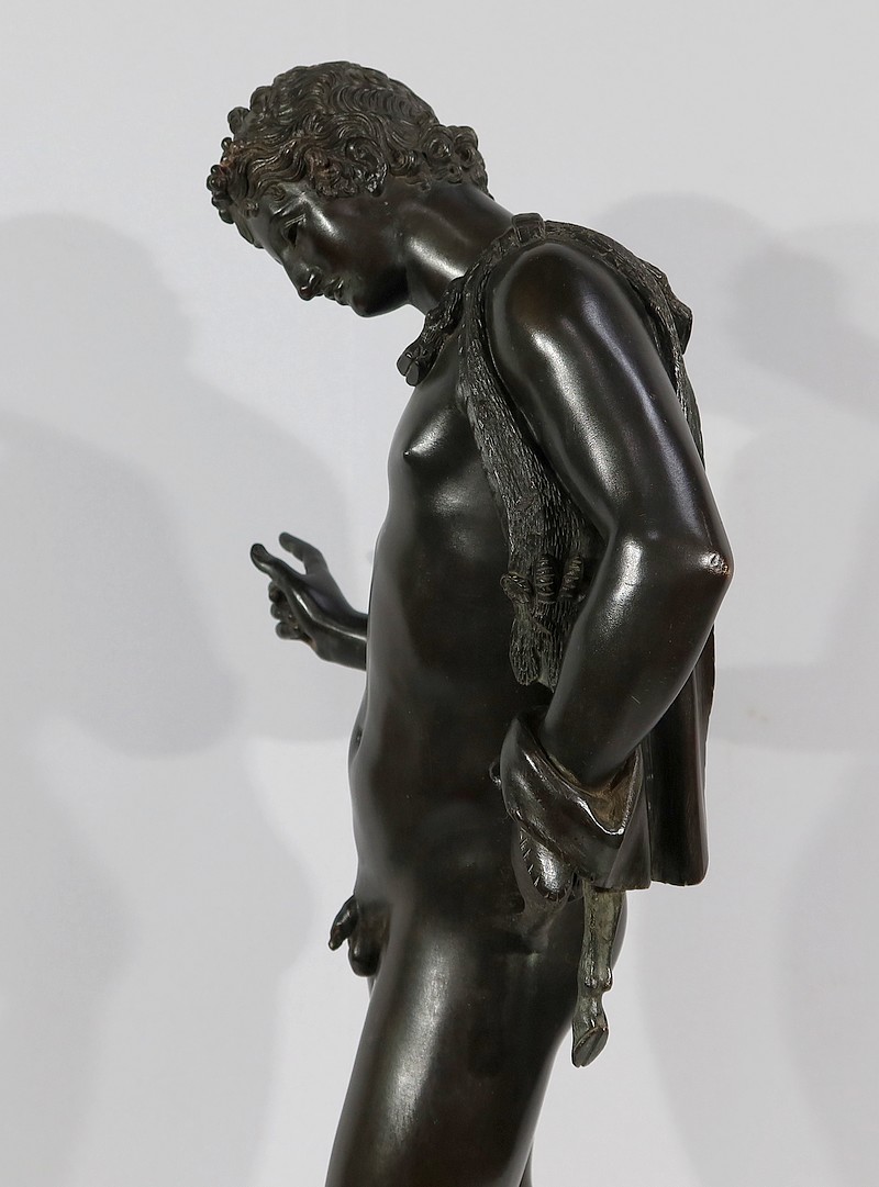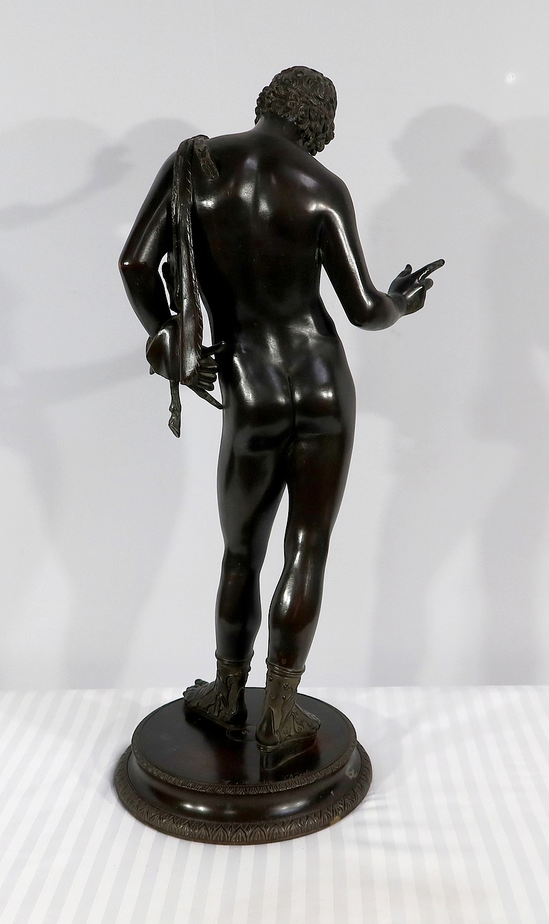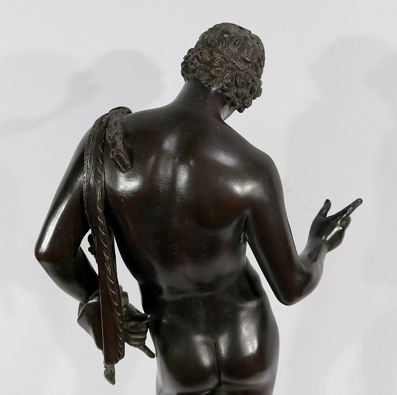 Grande sculpture en bronze patiné figurant Narcisse nu de Michele Amodio, d’après l’original antique découvert en 1862 à Pompéi dans la Maison de Narcisse et actuellement conservée à Naples.