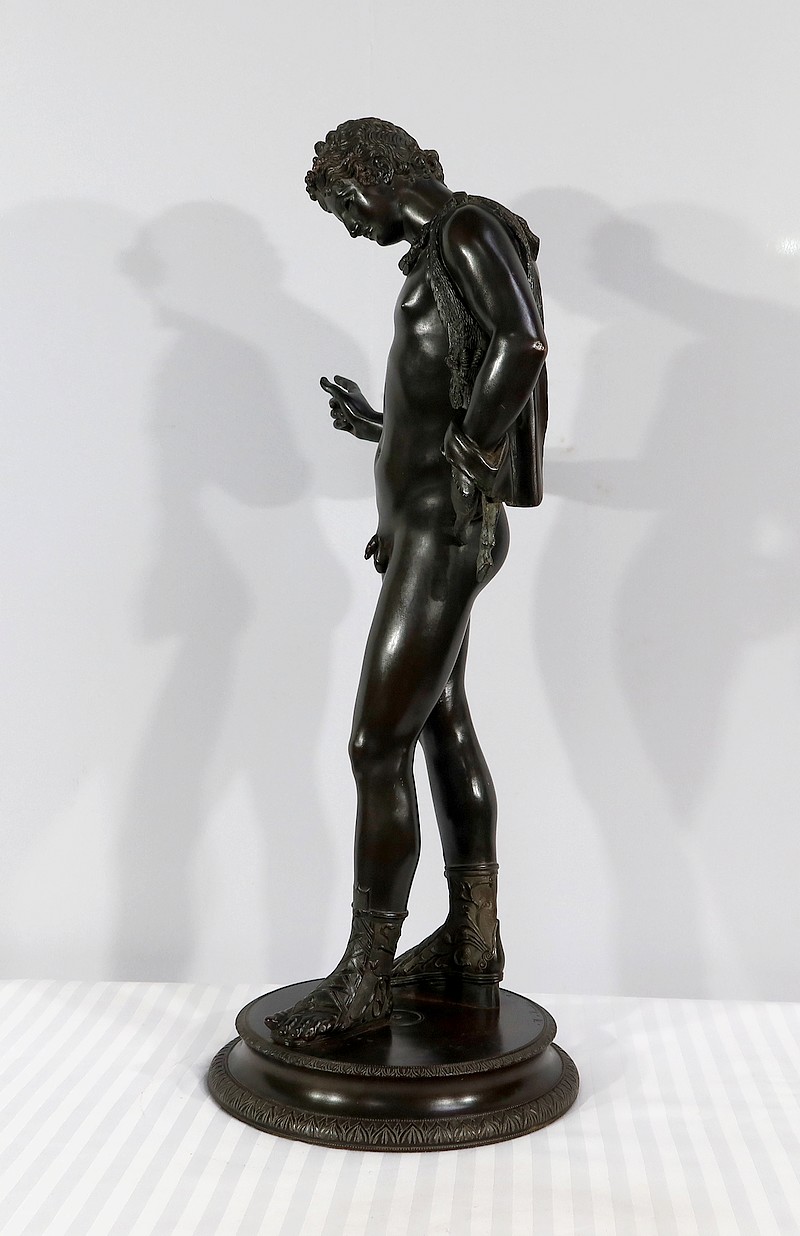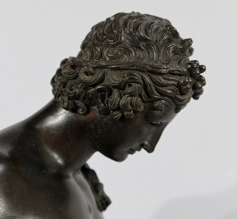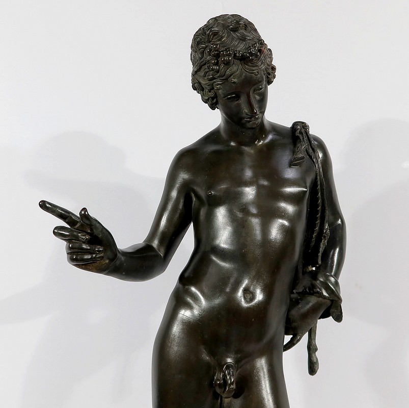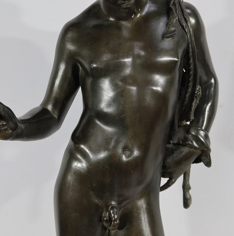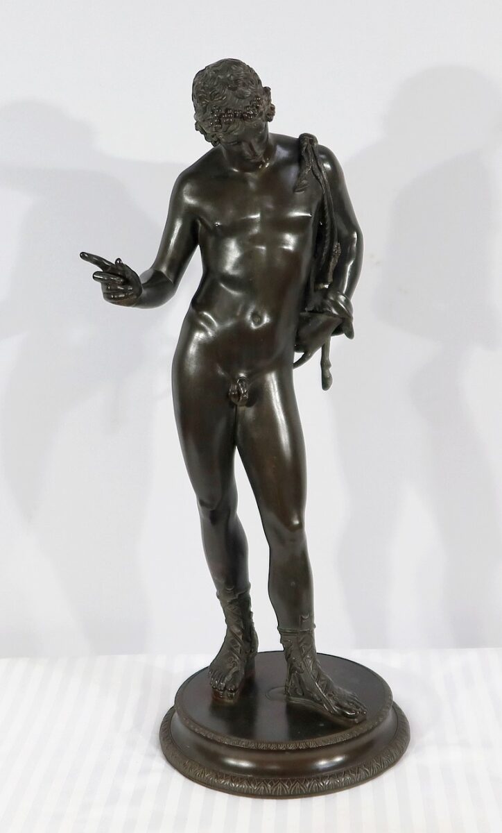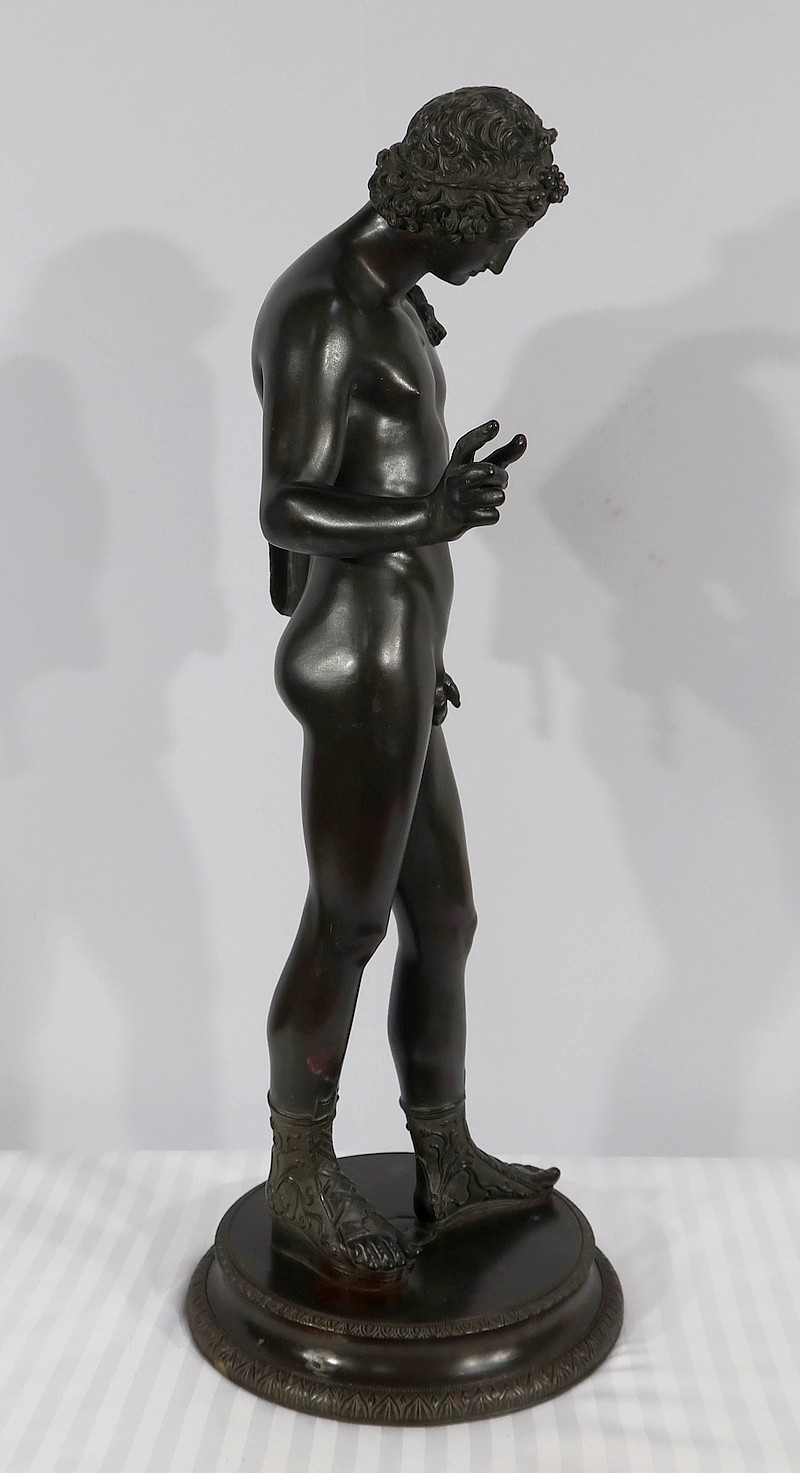 Grande sculpture en bronze patiné figurant Narcisse nu de Michele Amodio, d’après l’original antique découvert en 1862 à Pompéi dans la Maison de Narcisse et actuellement conservée à Naples.