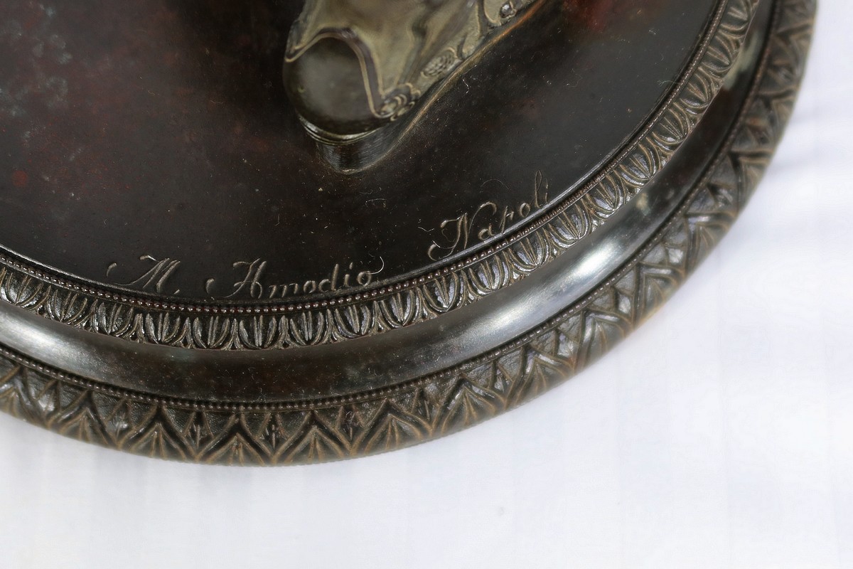 L’éphèbe repose sur un socle rond à gradins orné de feuilles d’eau. L’œuvre est signée sur la terrasse : M. Amodio Napoli.