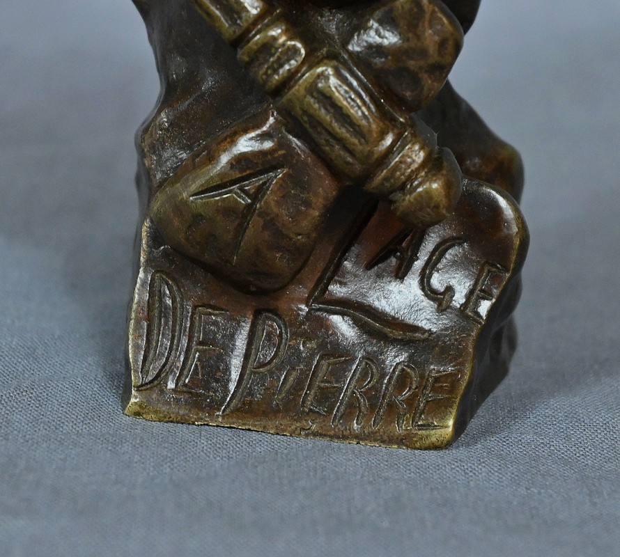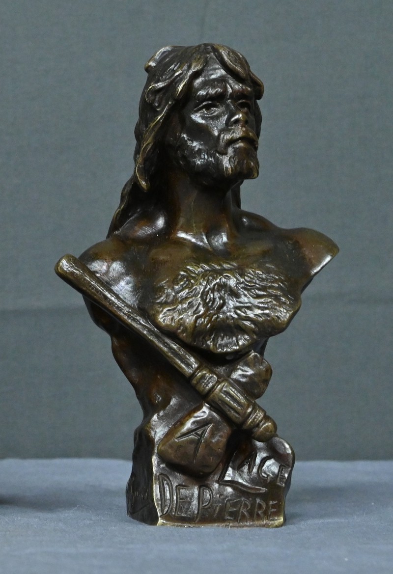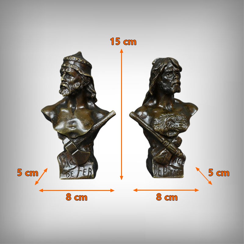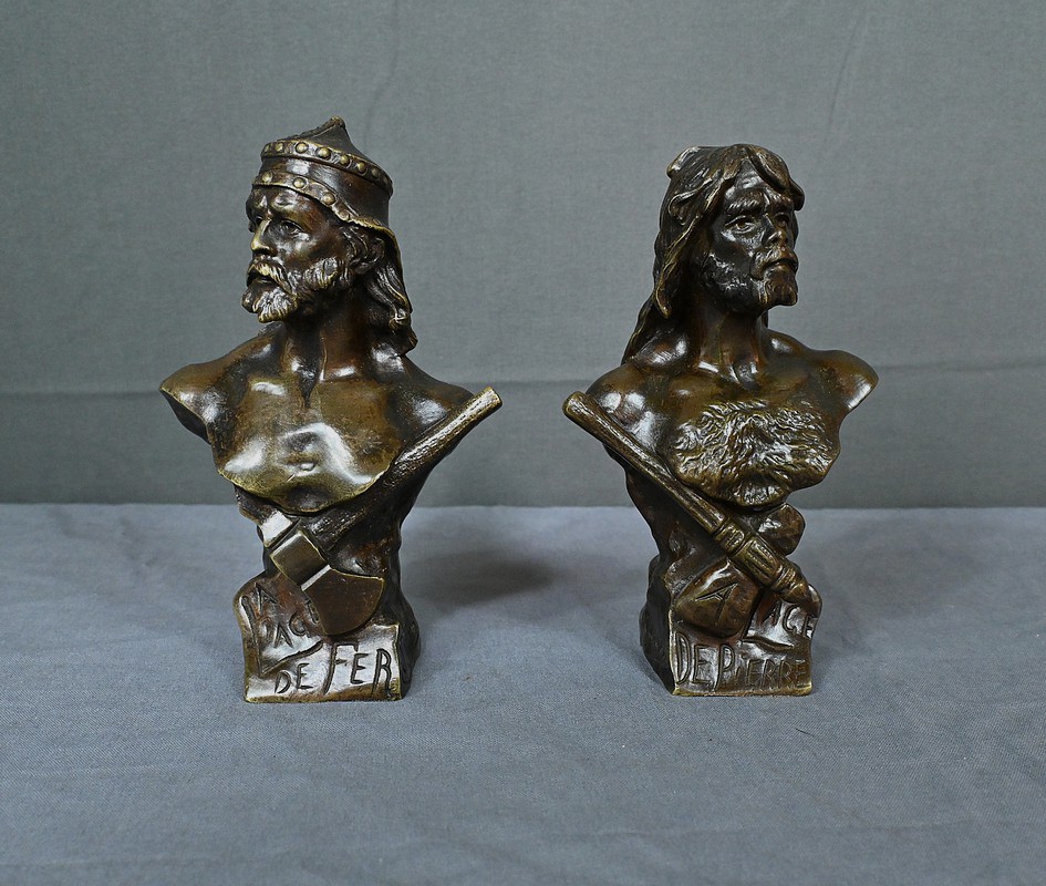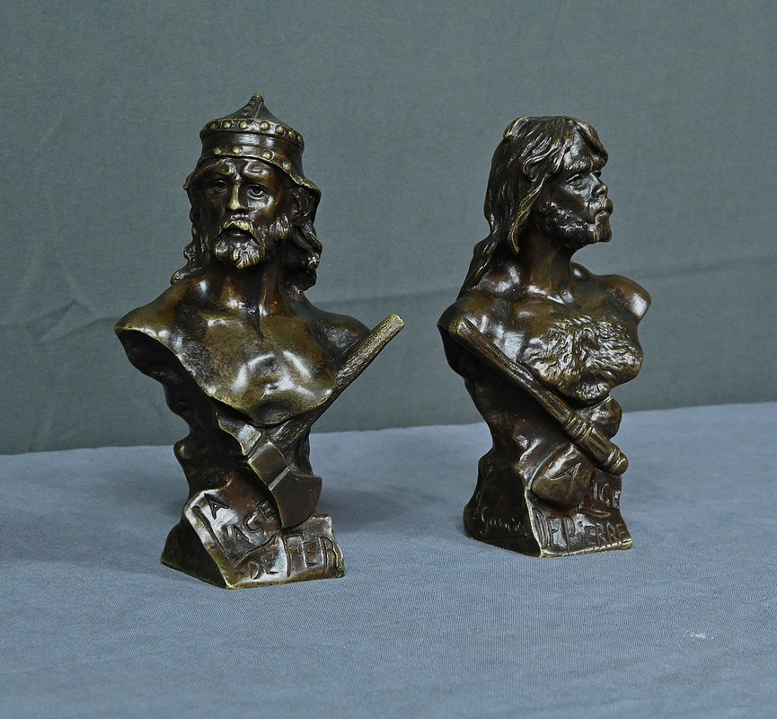 Cette paire de bustes en bronze représente deux figures masculines incarnant l’évolution humaine à travers les âges. Le premier buste illustre l’Âge de pierre, identifiable à son allure primitive et à son gourdin. Le second incarne l’Âge de fer, reconnaissable à sa hache en métal travaillé, symbole de progrès technique. Chaque sculpture est minutieusement détaillée, reflétant le savoir-faire du sculpteur Jean Garnier, actif à la fin du XIXe siècle. Les bustes sont signés sur leur base, confirmant leur authenticité et leur valeur artistique. Ils mesurent environ 15 cm de hauteur et s’inscrivent dans la tradition de l’école française. Réalisés dans un esprit éducatif et décoratif, ces bronzes témoignent d’une époque où l’art servait à transmettre l’histoire et les grandes évolutions de la civilisation. Leur finition soignée et leur expressivité en font des pièces prisées par les amateurs d’art et les collectionneurs.