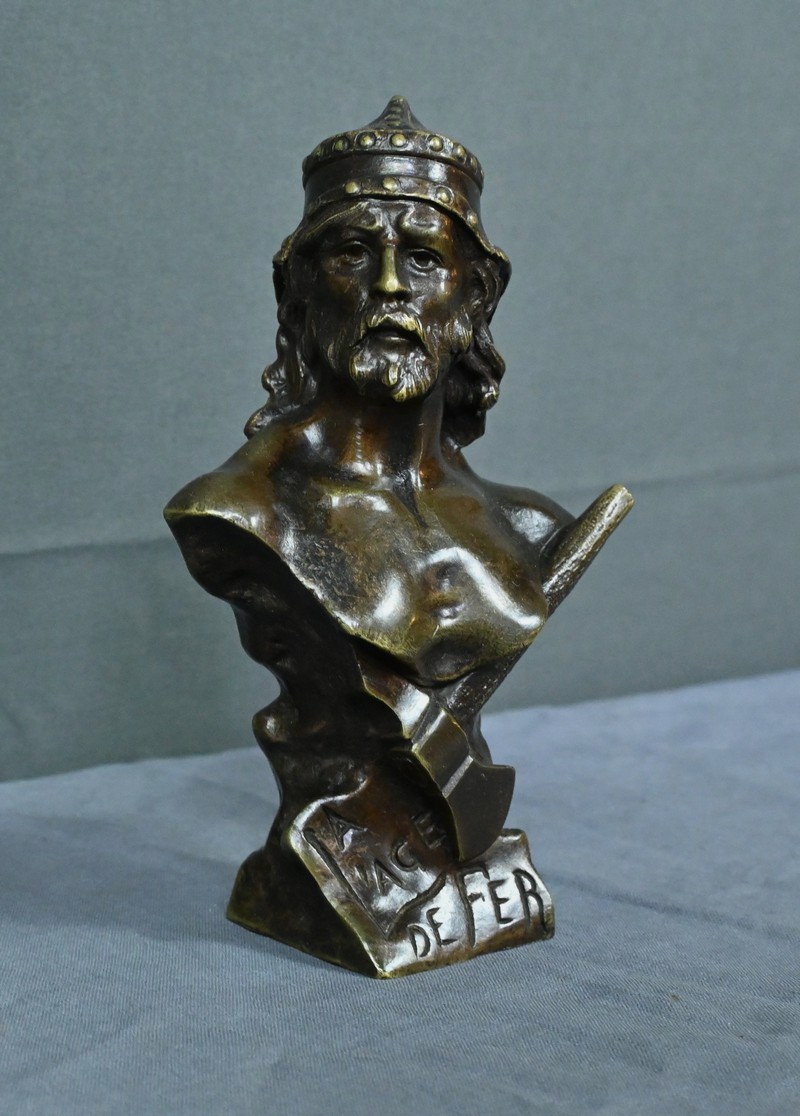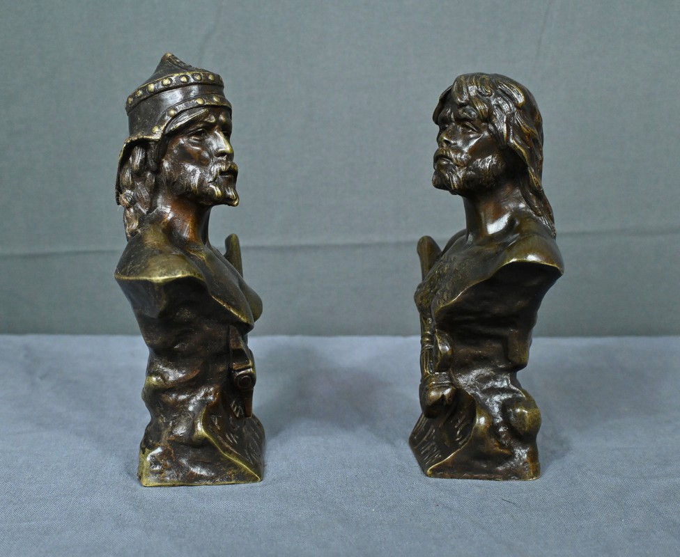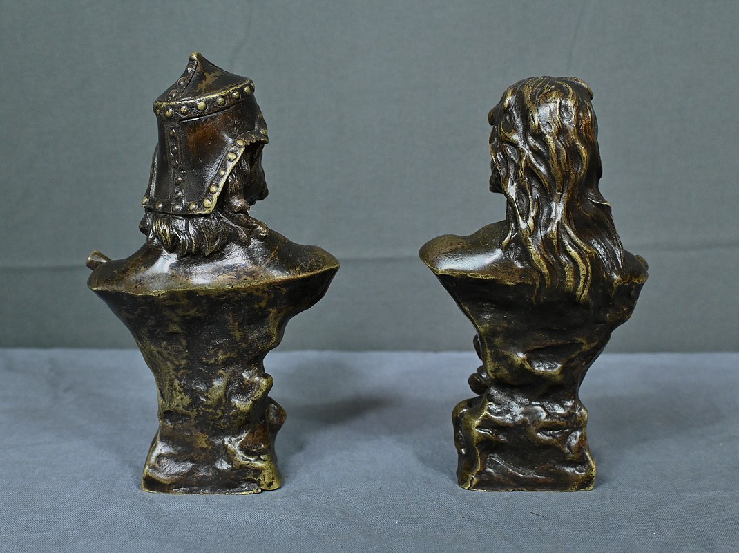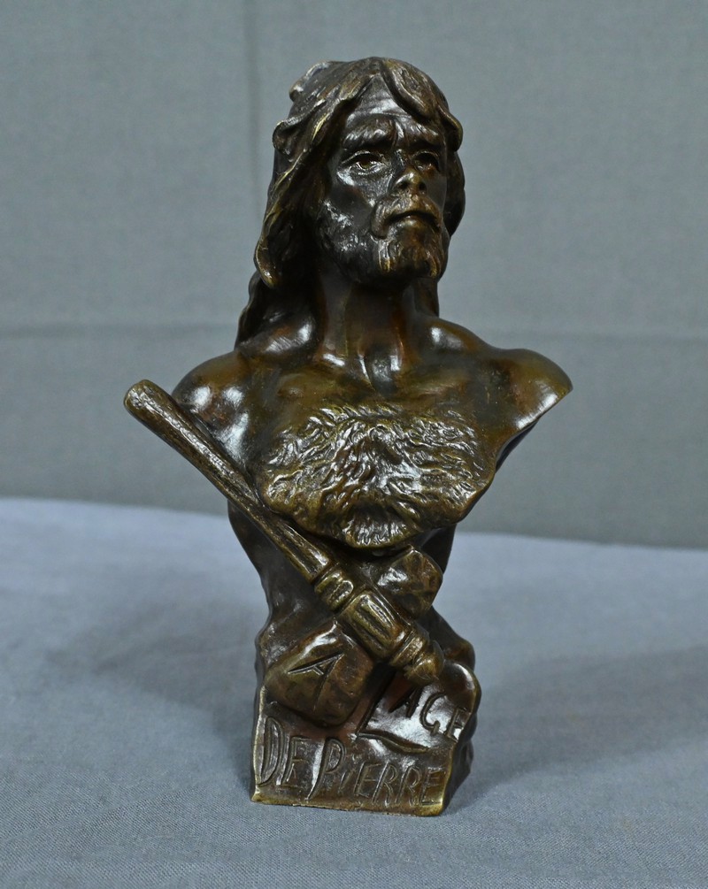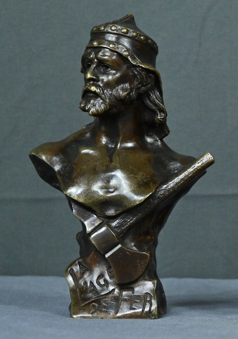 Cette paire de bustes en bronze représente deux figures masculines incarnant l’évolution humaine à travers les âges. Le premier buste illustre l’Âge de pierre, identifiable à son allure primitive et à son gourdin. Le second incarne l’Âge de fer, reconnaissable à sa hache en métal travaillé, symbole de progrès technique. Chaque sculpture est minutieusement détaillée, reflétant le savoir-faire du sculpteur Jean Garnier, actif à la fin du XIXe siècle. Les bustes sont signés sur leur base, confirmant leur authenticité et leur valeur artistique. Ils mesurent environ 15 cm de hauteur et s’inscrivent dans la tradition de l’école française. Réalisés dans un esprit éducatif et décoratif, ces bronzes témoignent d’une époque où l’art servait à transmettre l’histoire et les grandes évolutions de la civilisation. Leur finition soignée et leur expressivité en font des pièces prisées par les amateurs d’art et les collectionneurs.