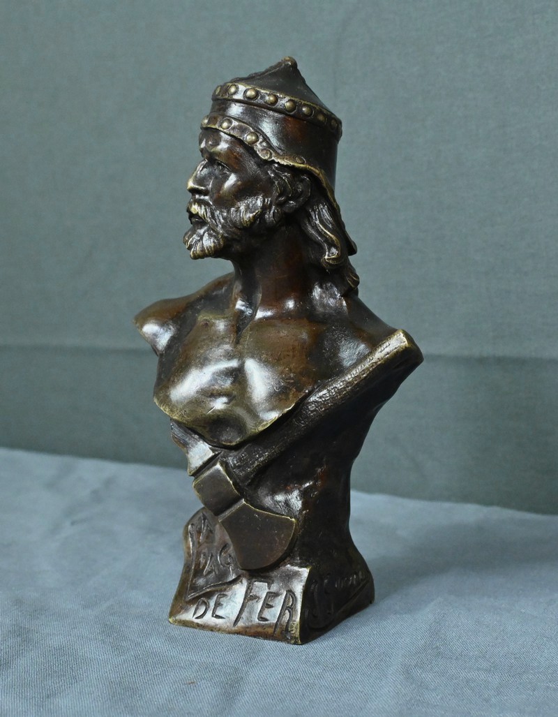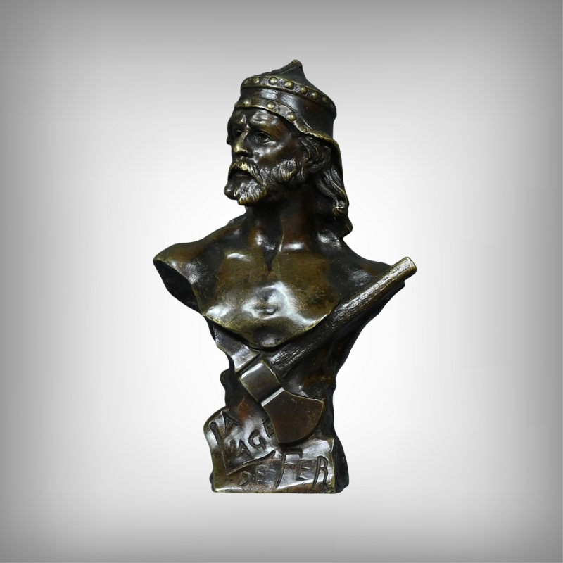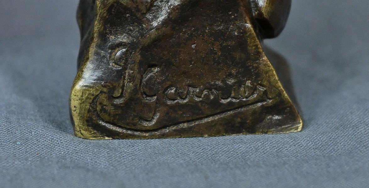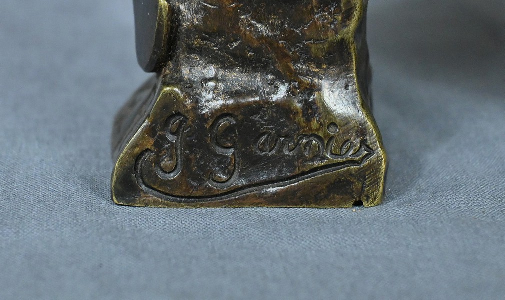 Jean Garnier (1853-1930) est un sculpteur français qui s’est illustré par ses sculptures en bronze, souvent inspirées de personnages historiques, religieux ou populaires, dans un style naturaliste teinté d’Art Nouveau. Il exposa régulièrement au Salon des Artistes Français, obtenant une mention honorable en 1892. Parmi ses œuvres figurent des bustes de Pierrot, Jeanne d’Arc ou Saint Jean Baptiste. Garnier maîtrisait aussi l’étain, l’émail et la céramique, et collabora parfois avec d’autres artistes, comme Emmanuel Villanis.