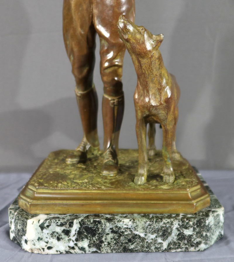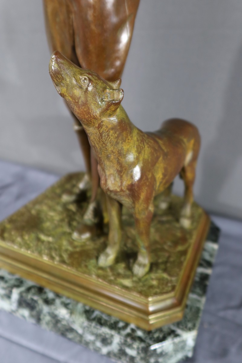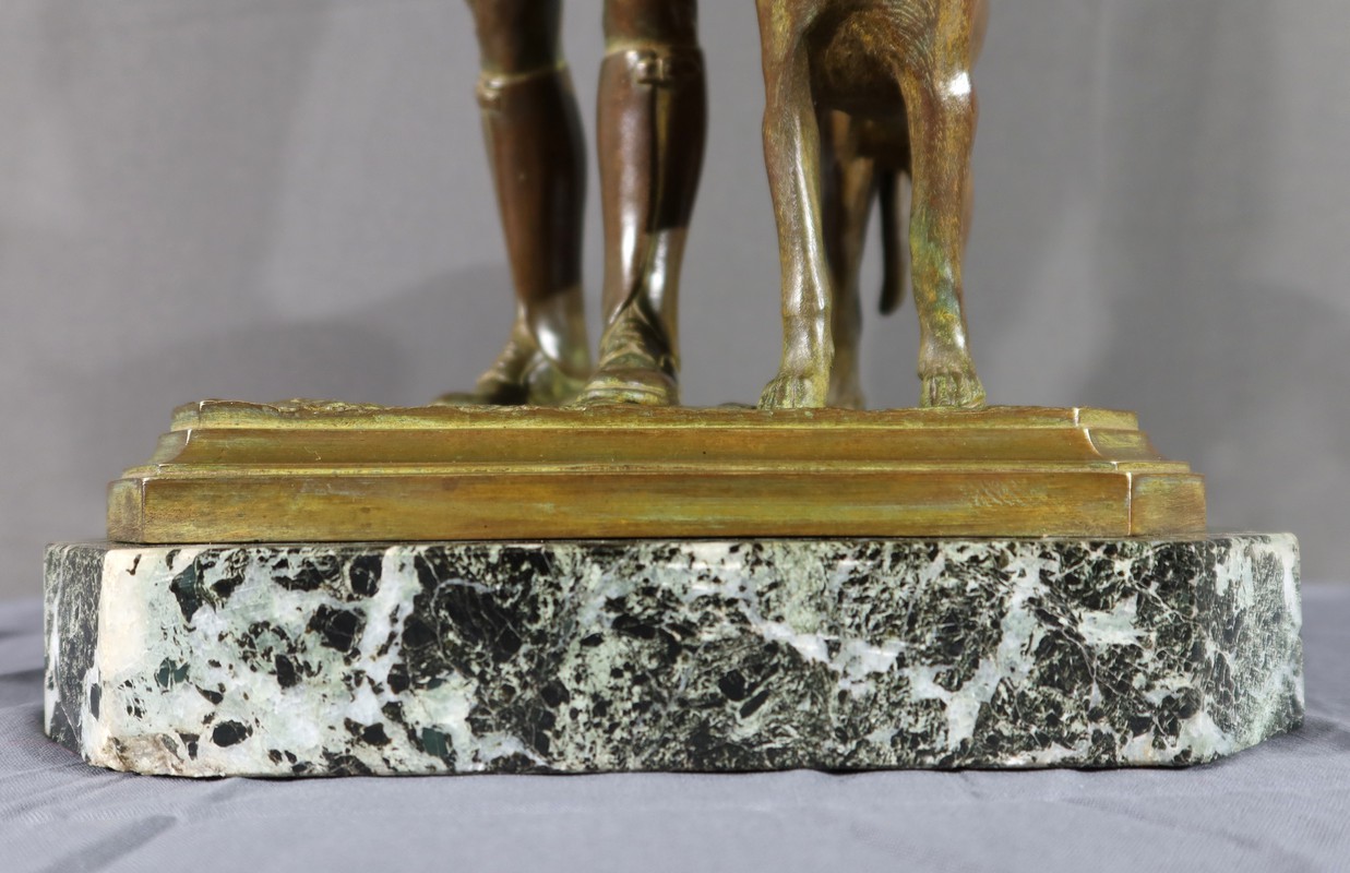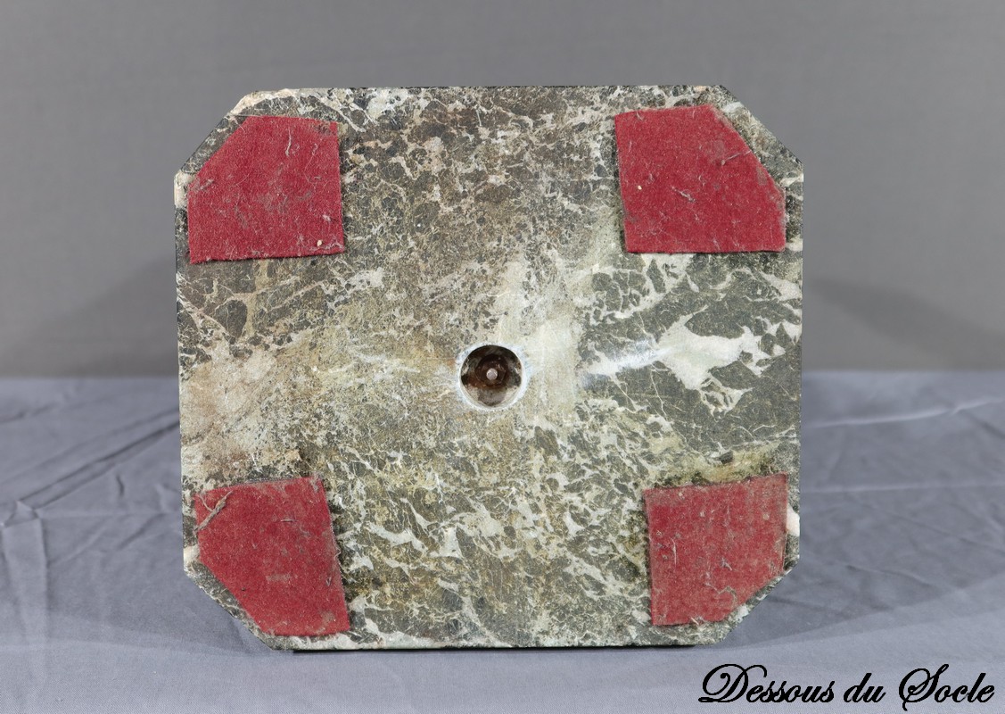 La double patine, verte et brune, ajoute de la profondeur et du contraste à l’œuvre, tandis que le socle en marbre noir, ressemblant au veinage du marbre vert de mer, offre une base solide et élégante.