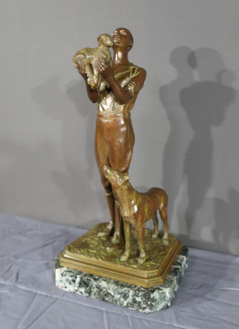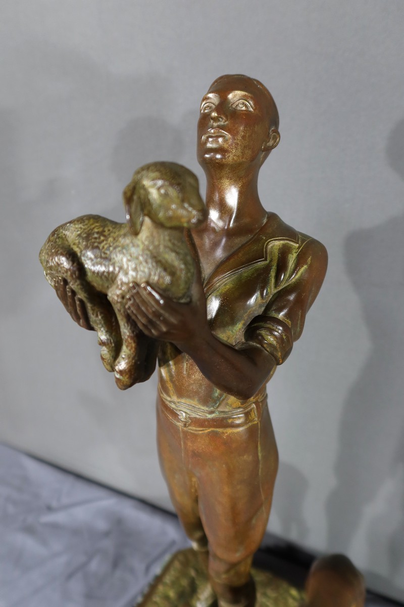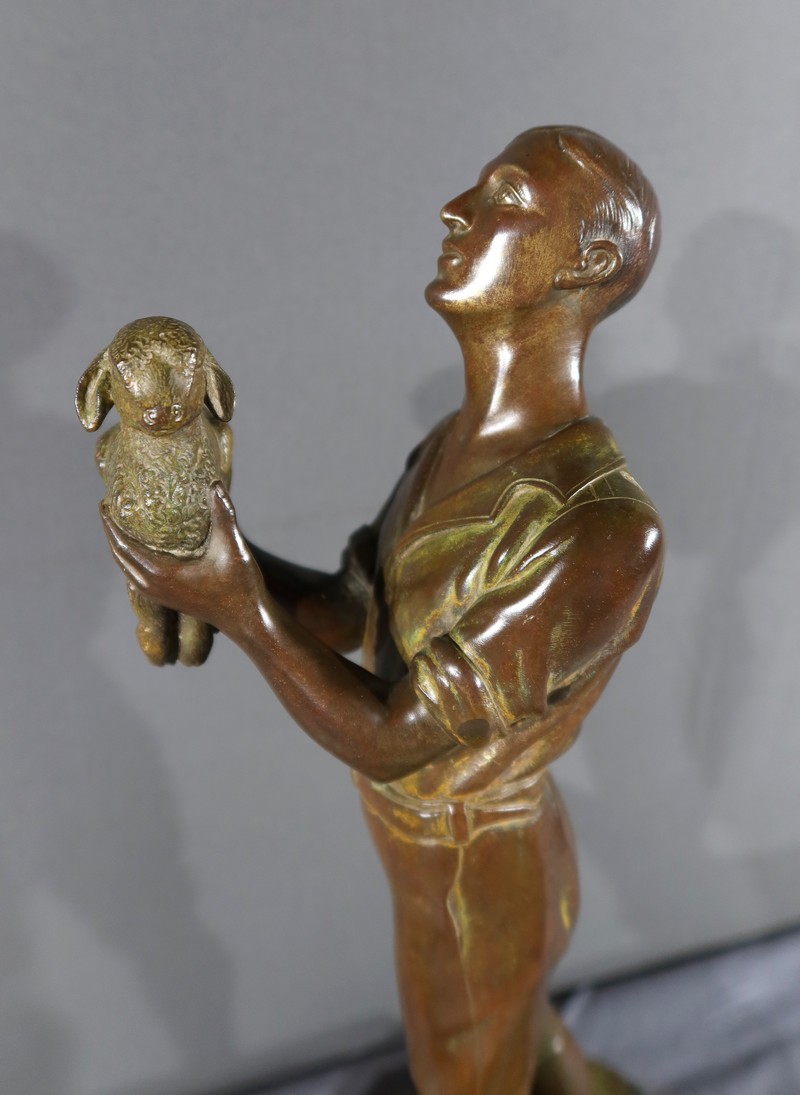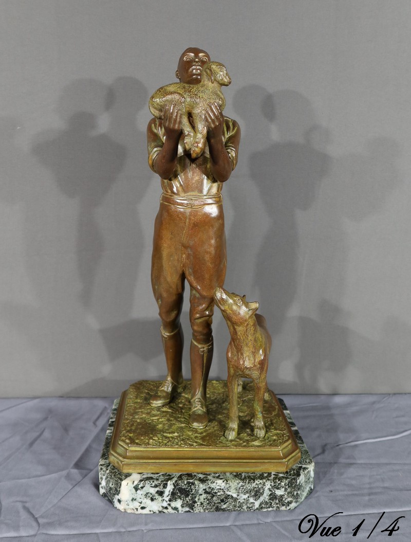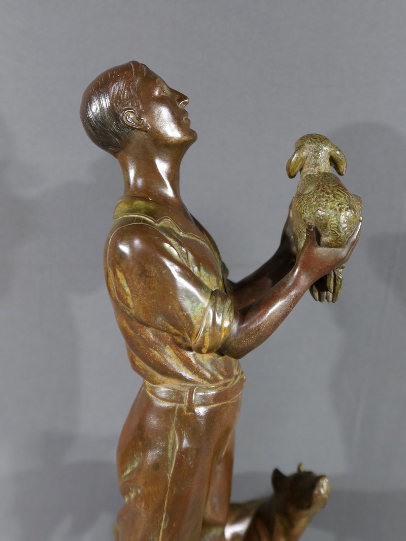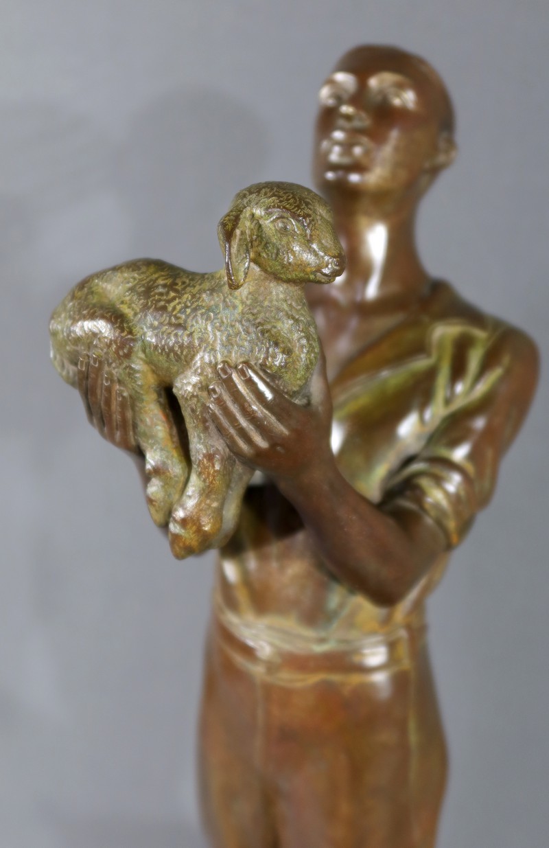 Cette sculpture en bronze représente un homme debout, tenant un agnelet dans ses bras, accompagné de son chien à ses côtés.