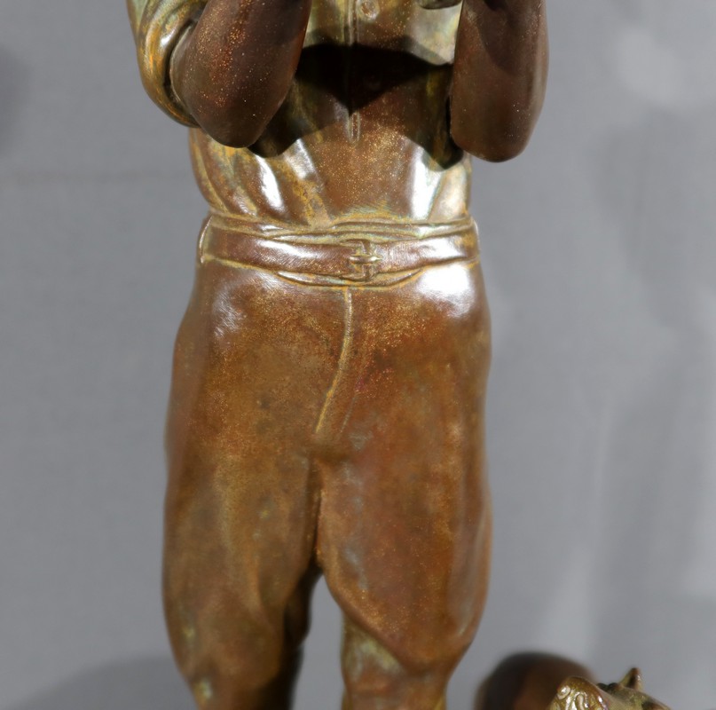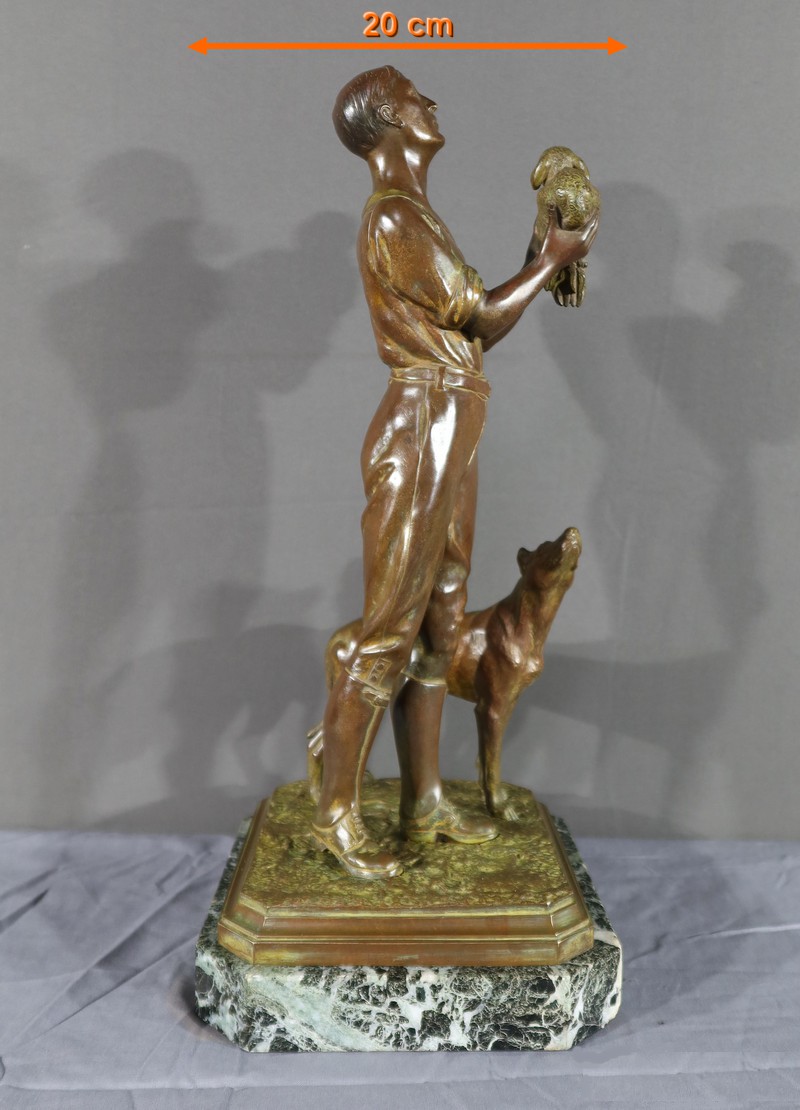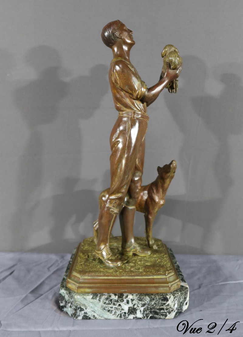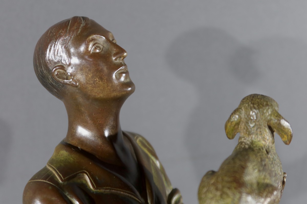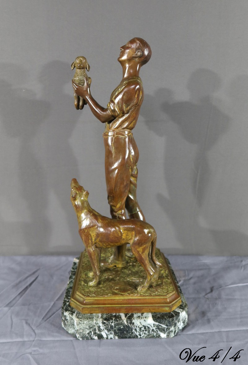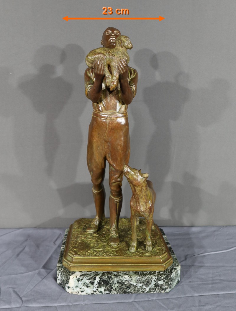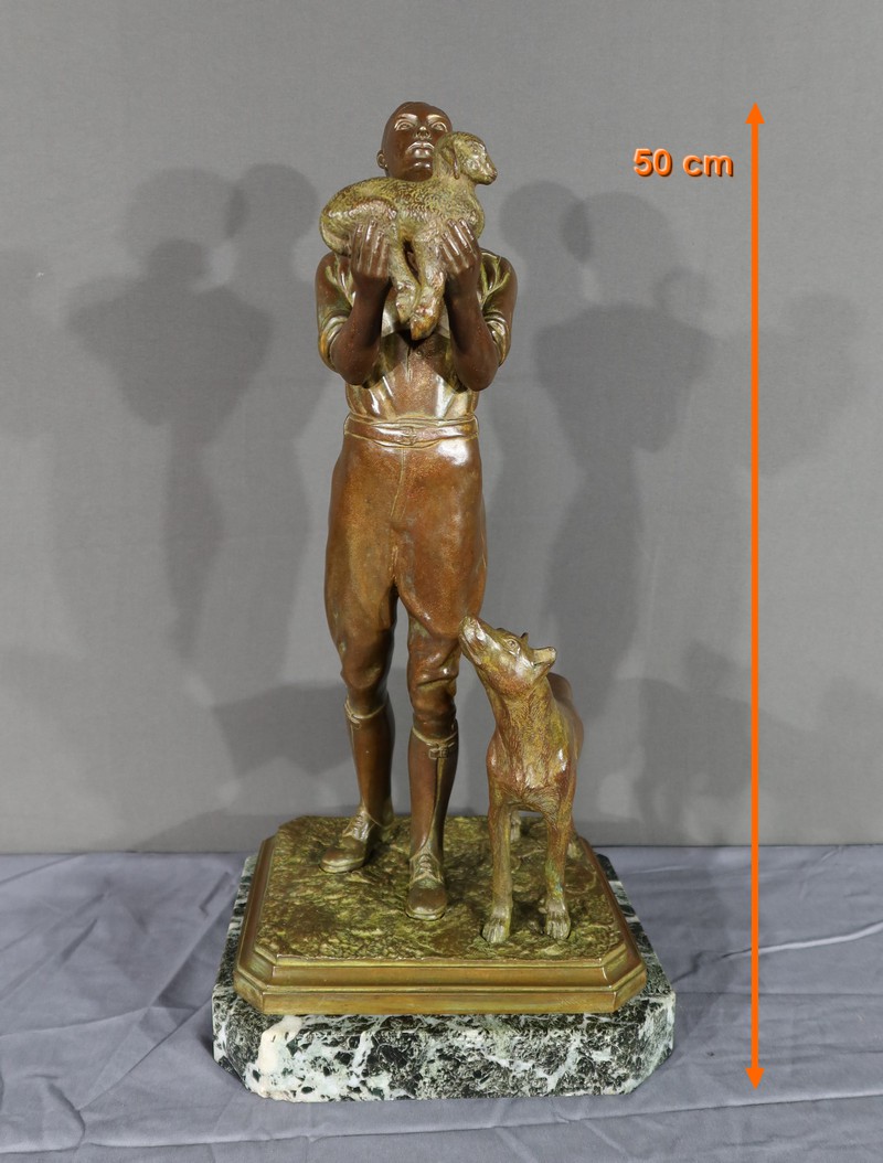 Cette sculpture en bronze représente un homme debout, tenant un agnelet dans ses bras, accompagné de son chien à ses côtés.